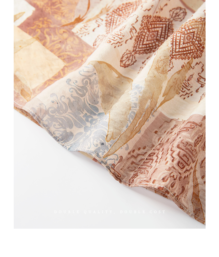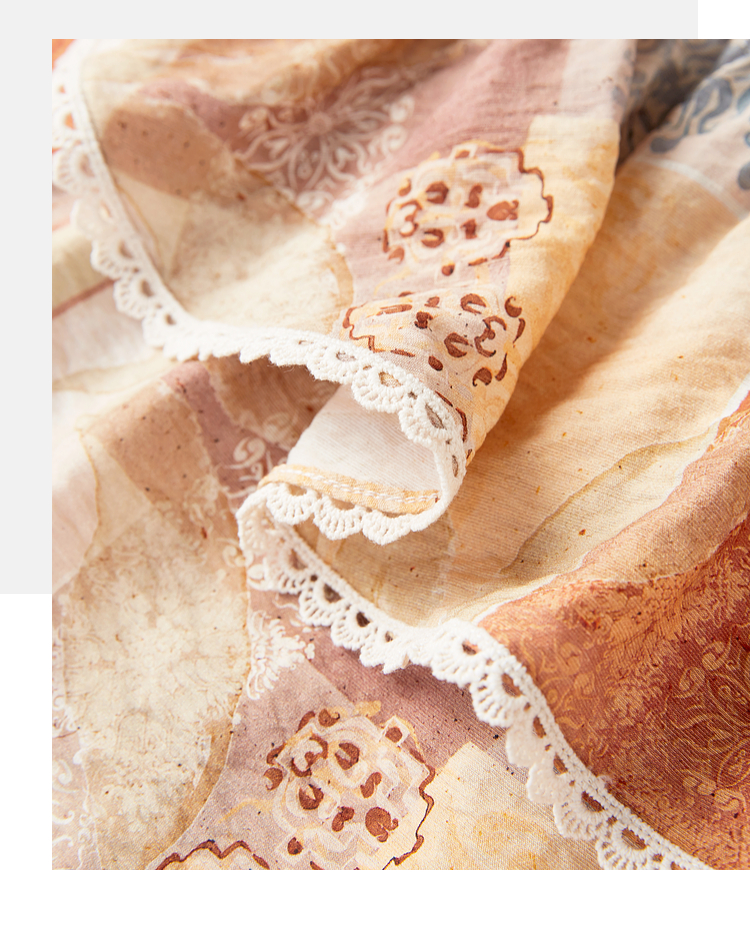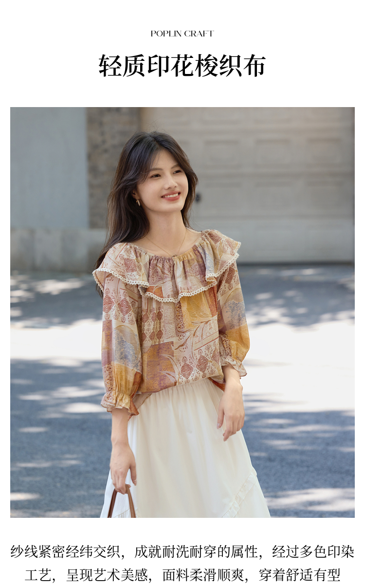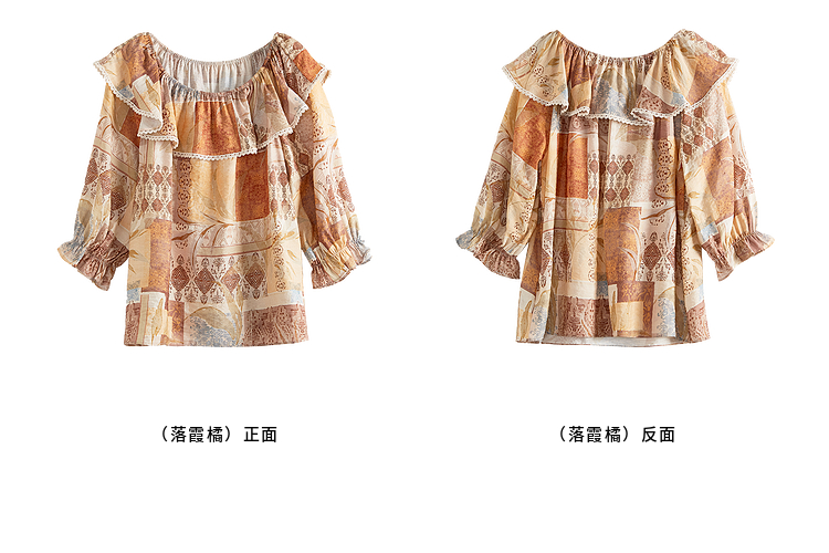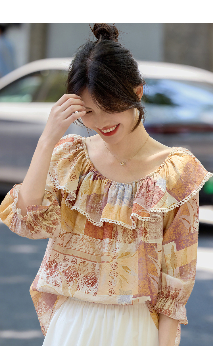【08/06新品】熙世界荷叶边一字肩两穿印花衬衫女2025夏秋波西米亚风七分袖上衣