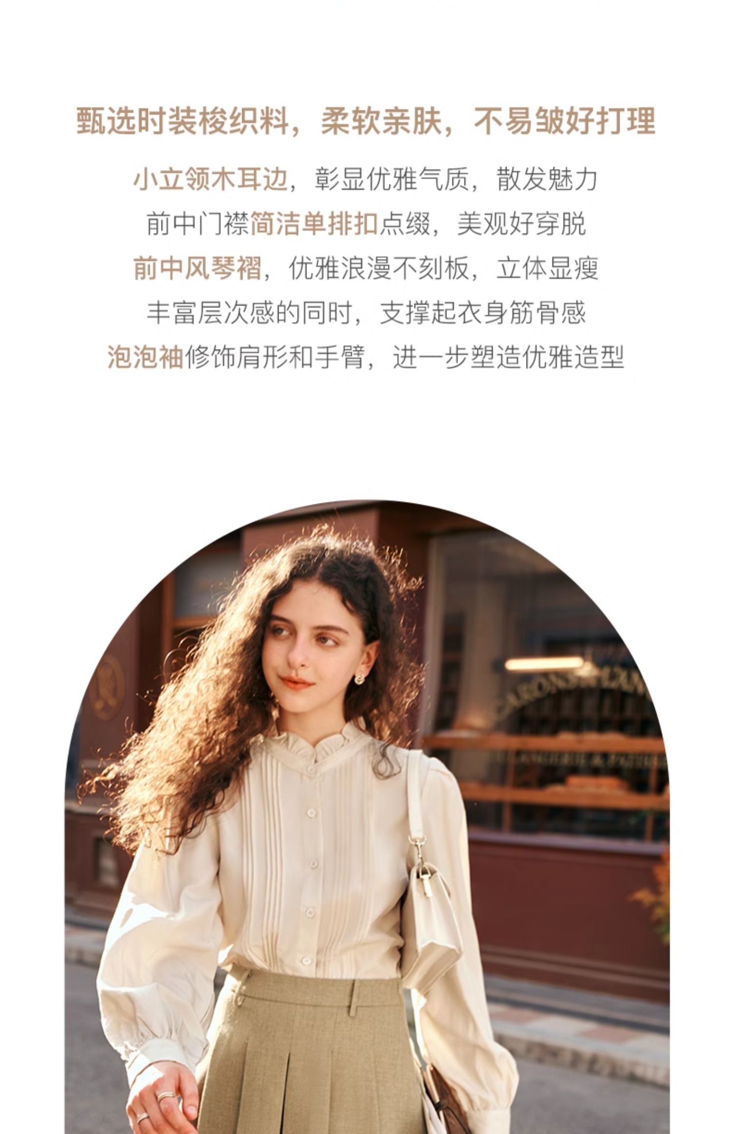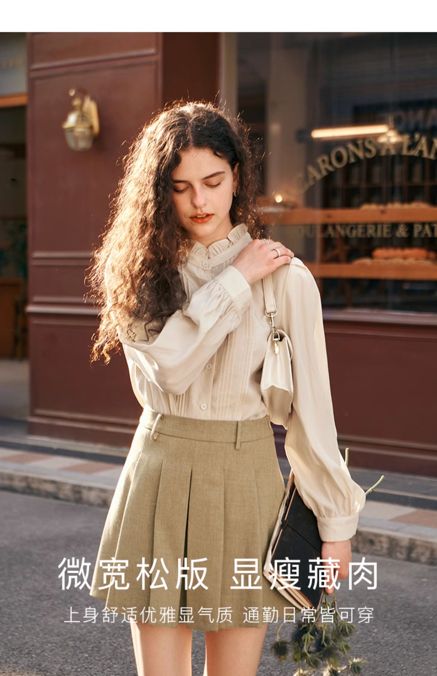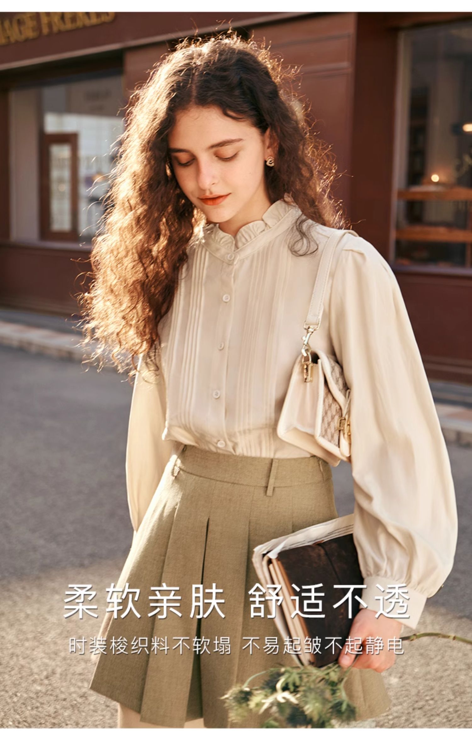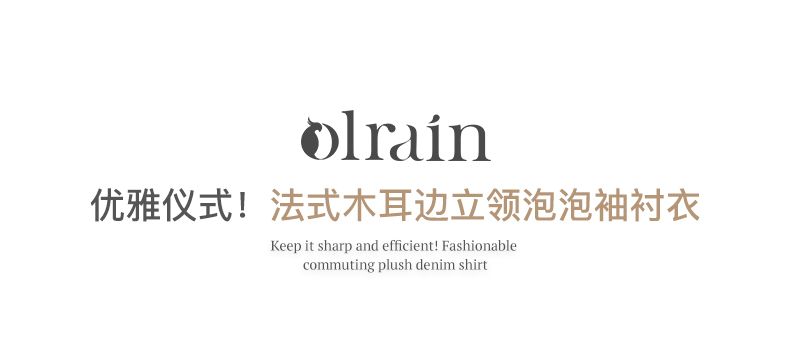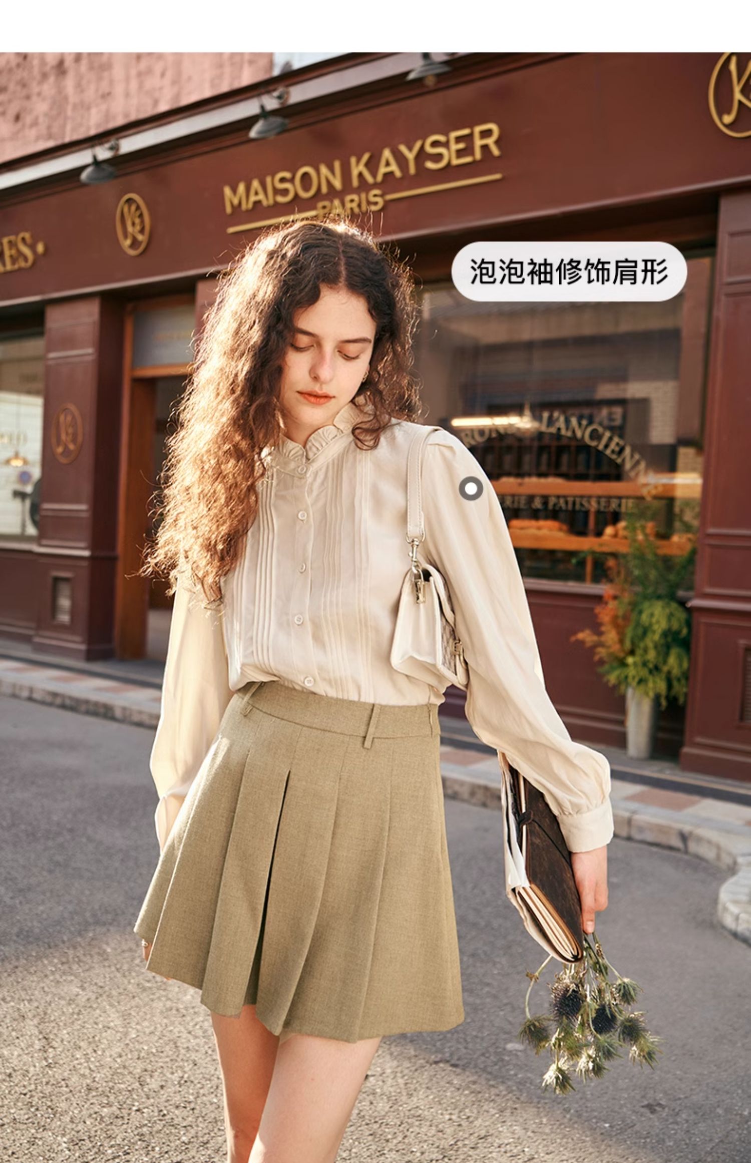 OLrain欧芮儿法式长袖衬衫女秋冬2023年新款木耳边立领泡泡袖衬衣
