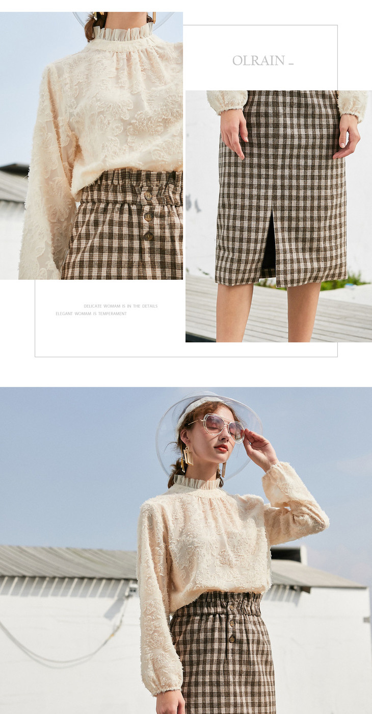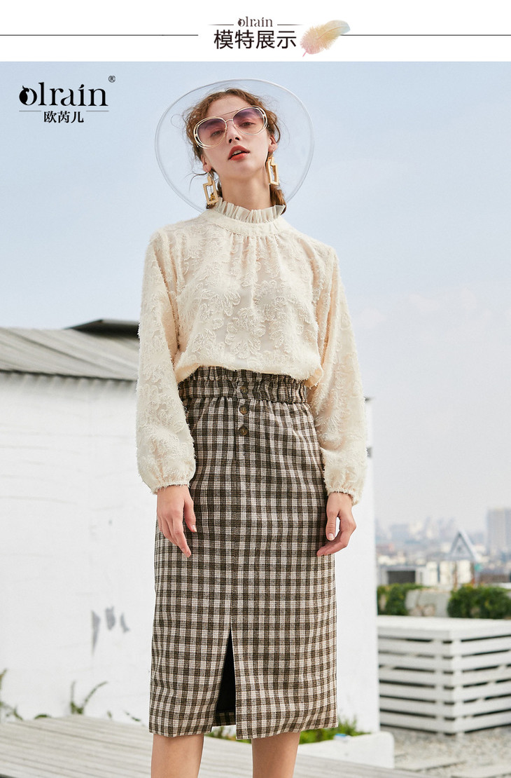 欧芮儿 新品淑女风小香风蕾丝衫格子半裙时尚套装两件套