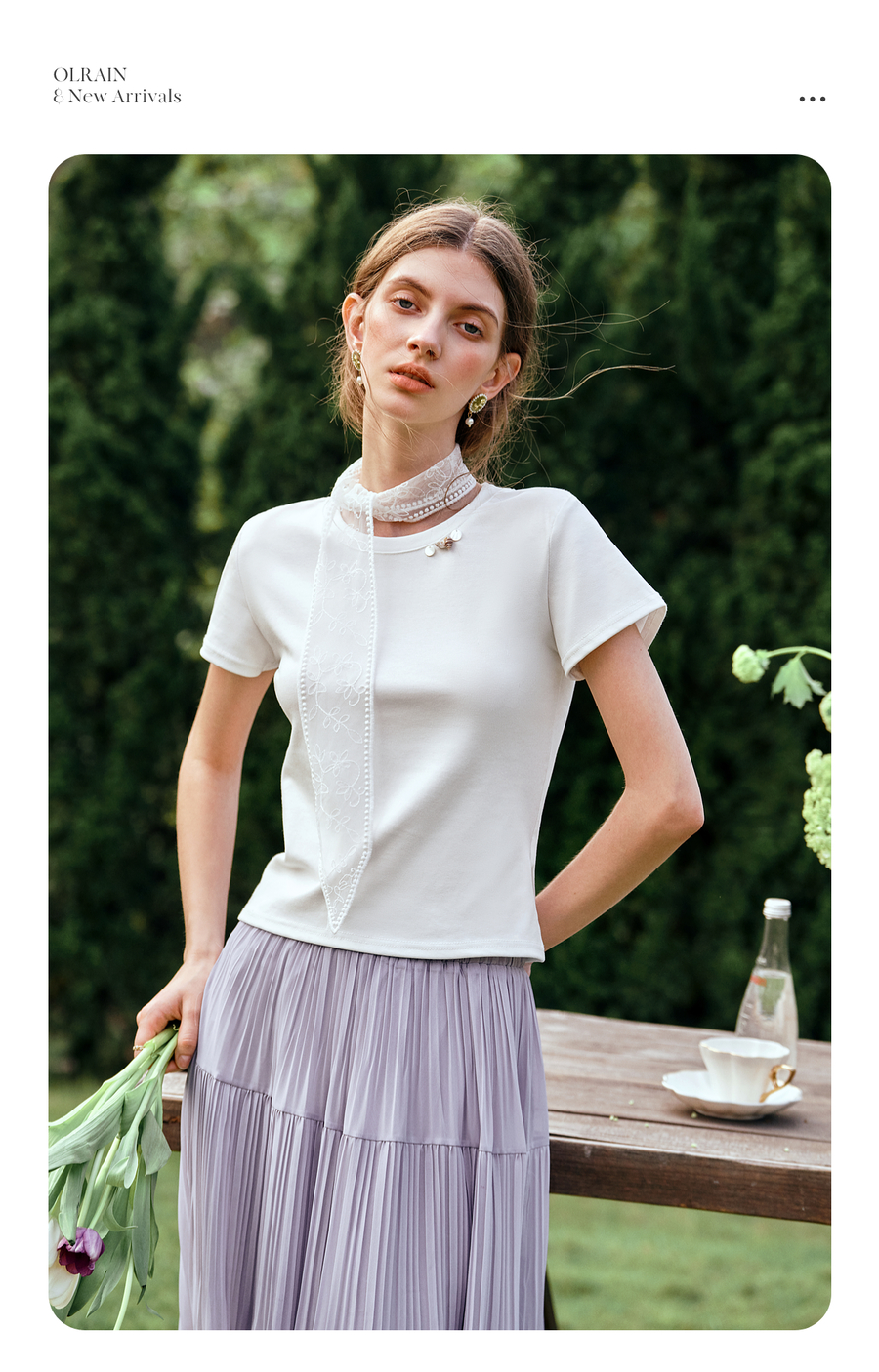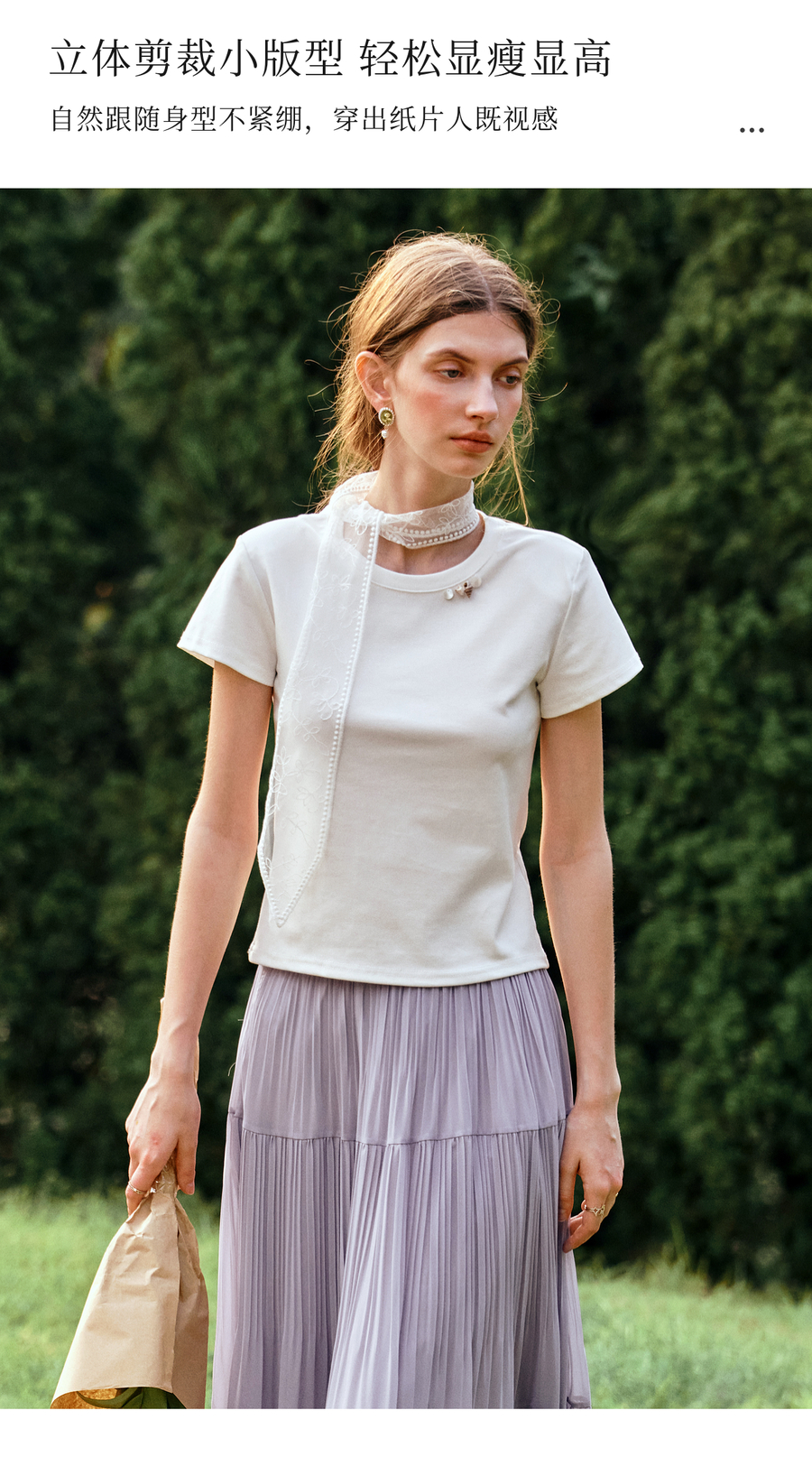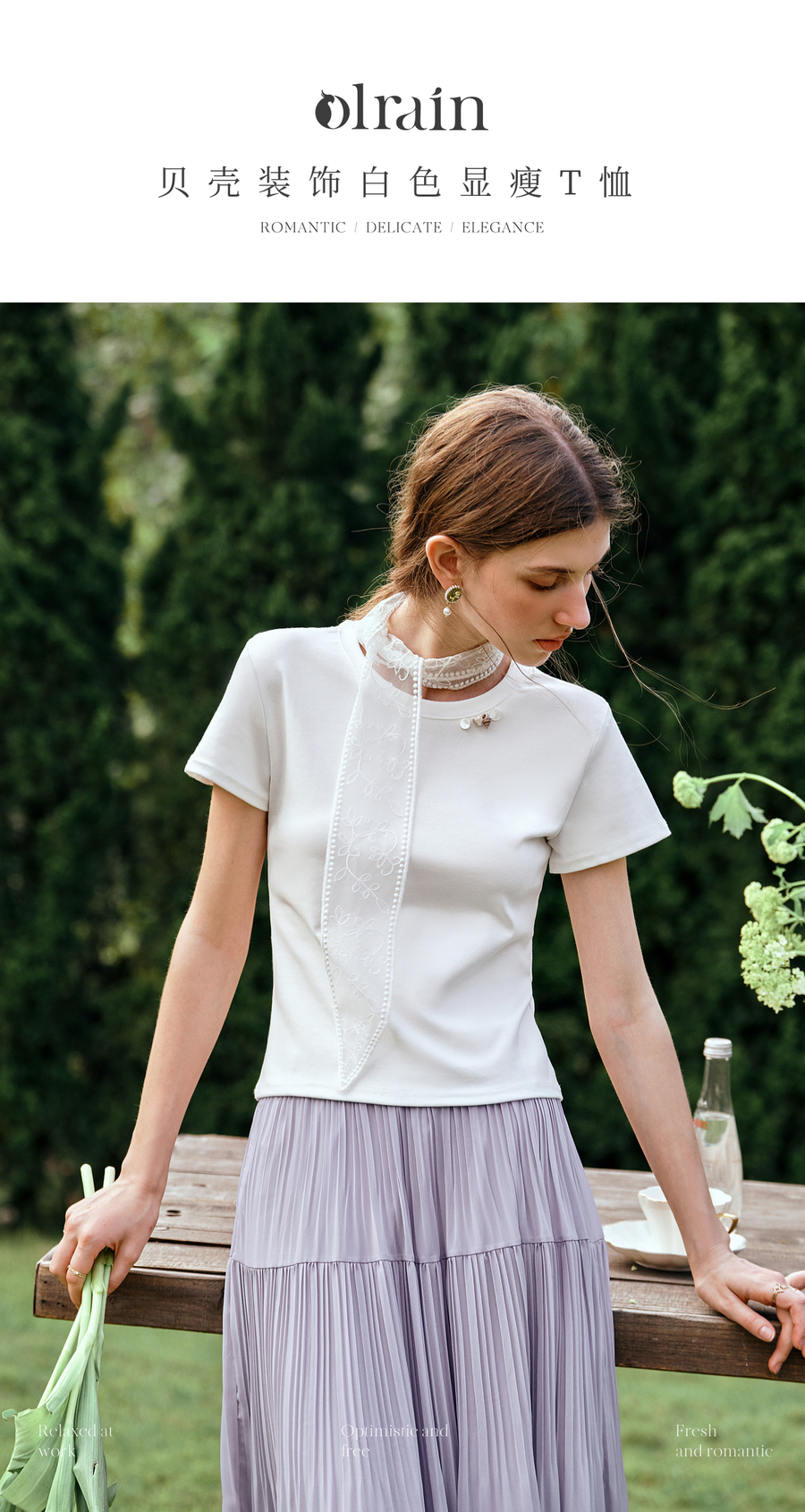 OLrain欧芮儿贝壳装饰白色显瘦T恤夏季2025新款百搭修身短款上衣