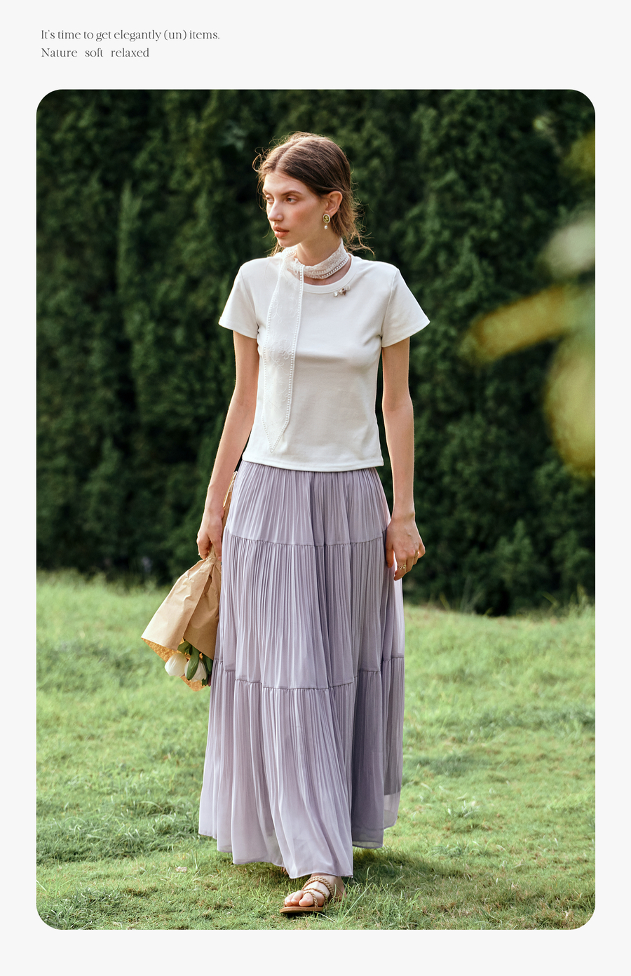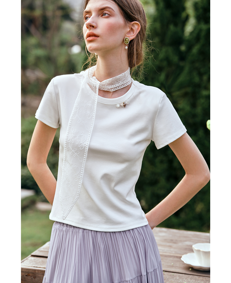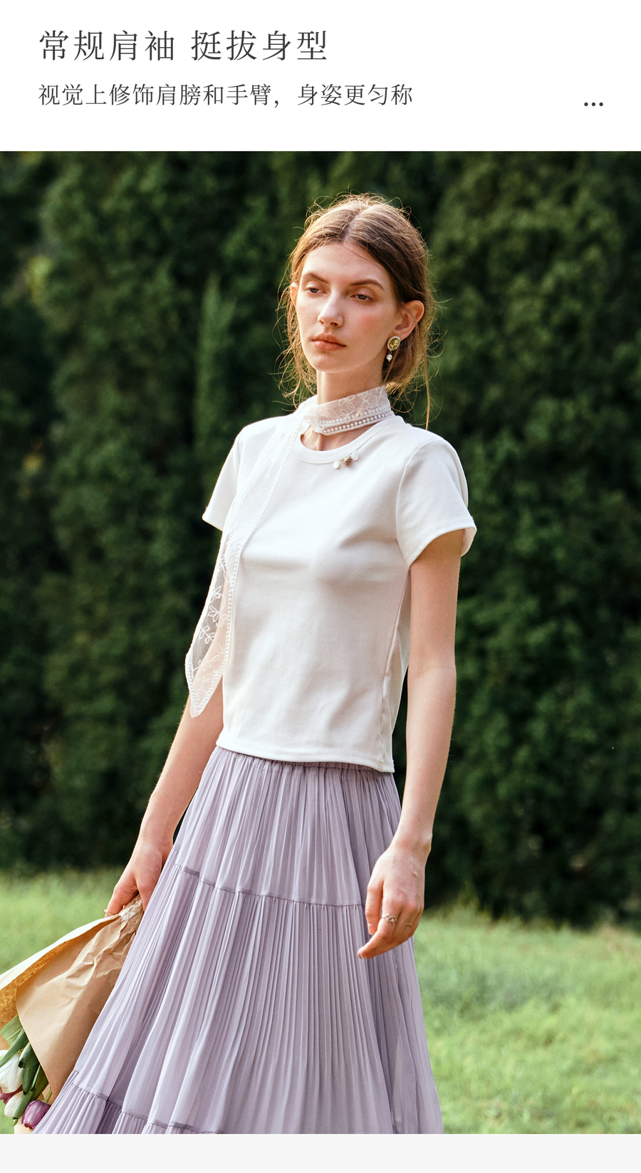 OLrain欧芮儿贝壳装饰白色显瘦T恤夏季2025新款百搭修身短款上衣