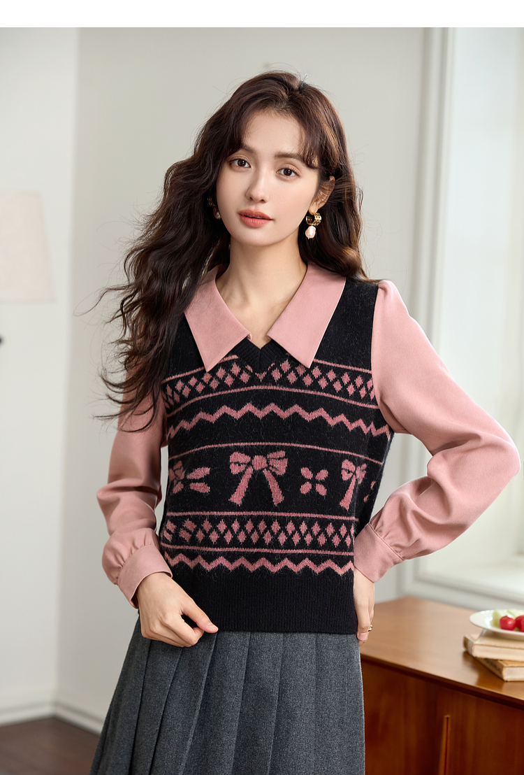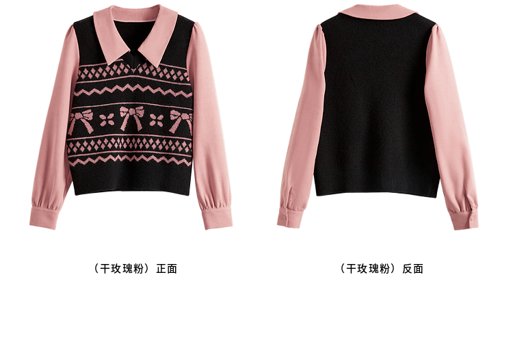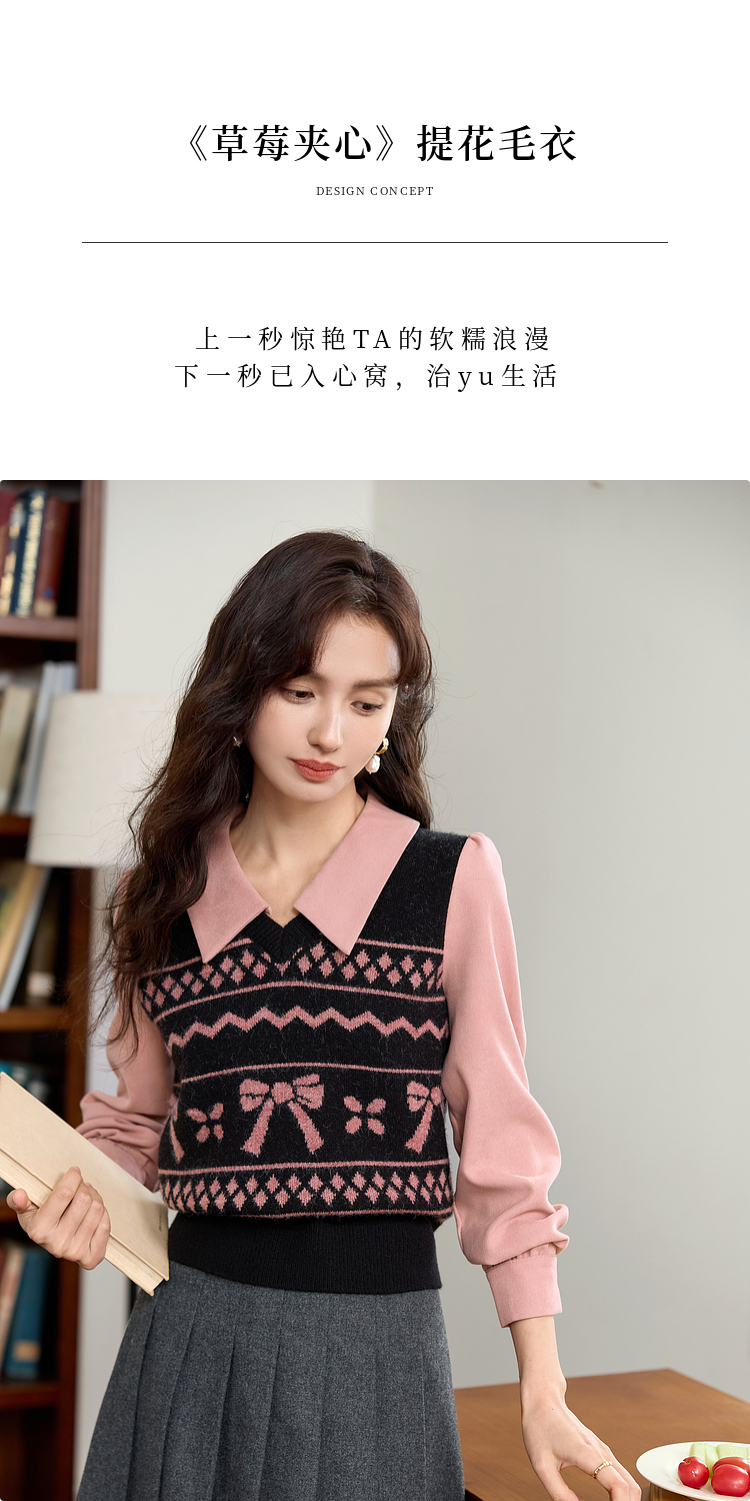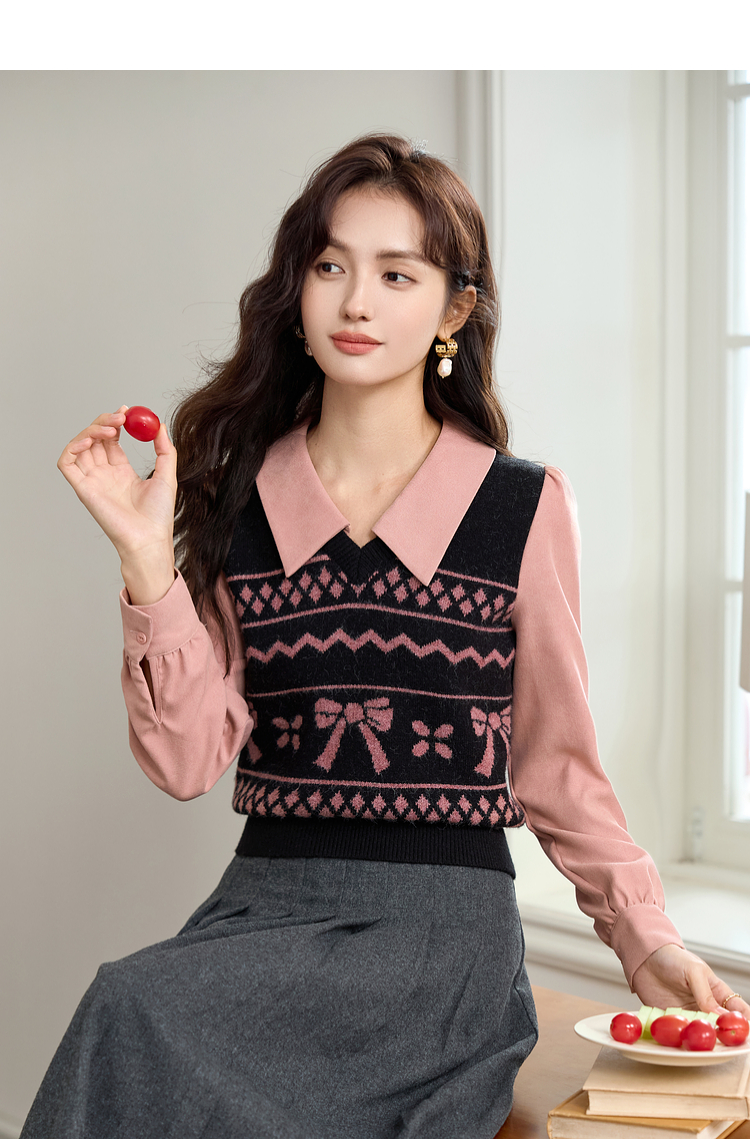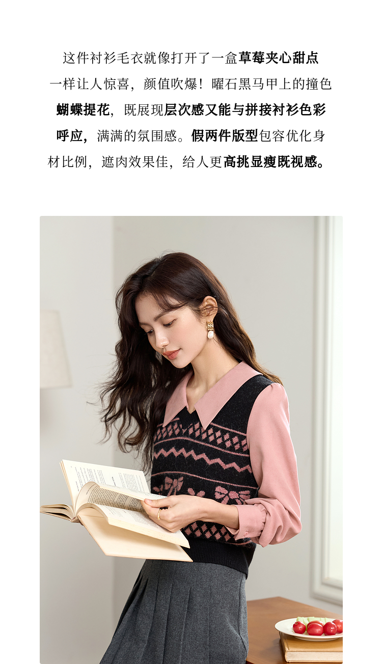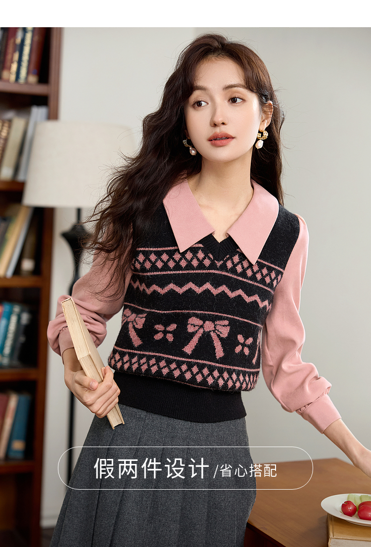 【年终特卖】熙世界假两件衬衫领毛衣秋冬2025新款设计感拼接提花打底针织衫