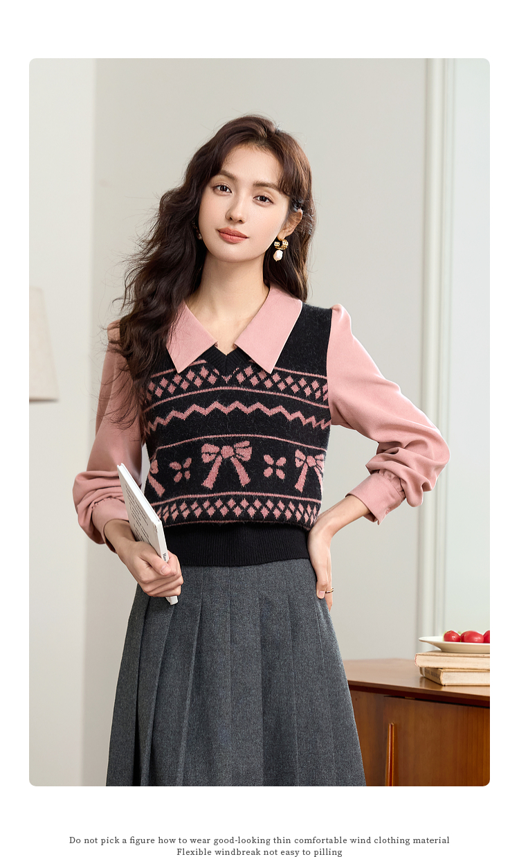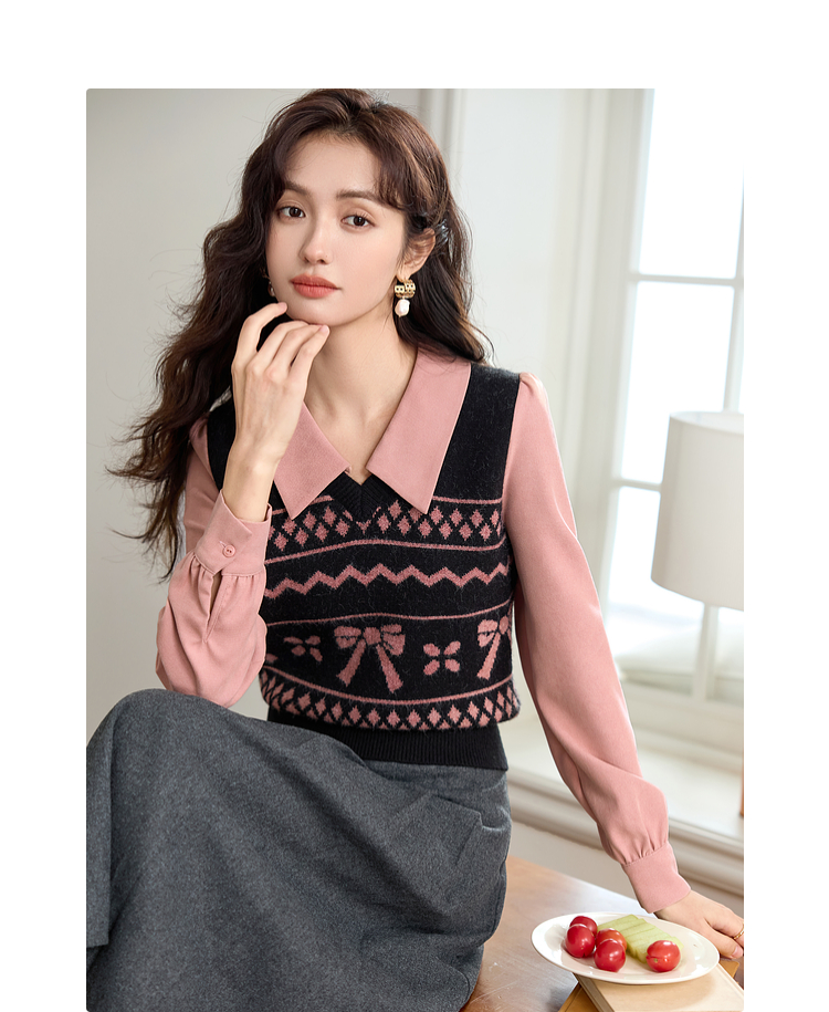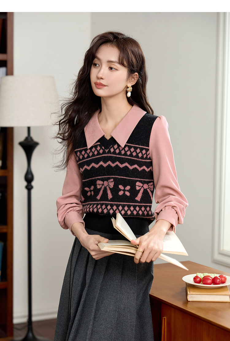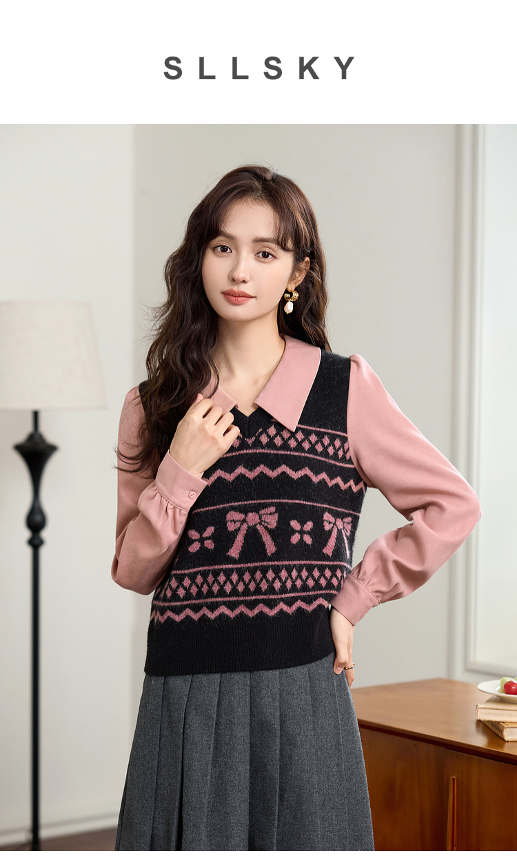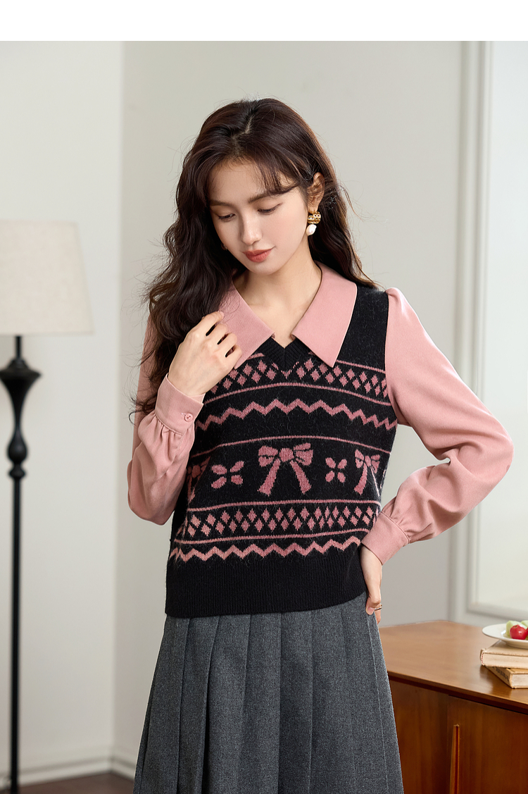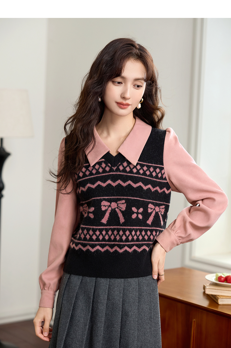 【年终特卖】熙世界假两件衬衫领毛衣秋冬2025新款设计感拼接提花打底针织衫