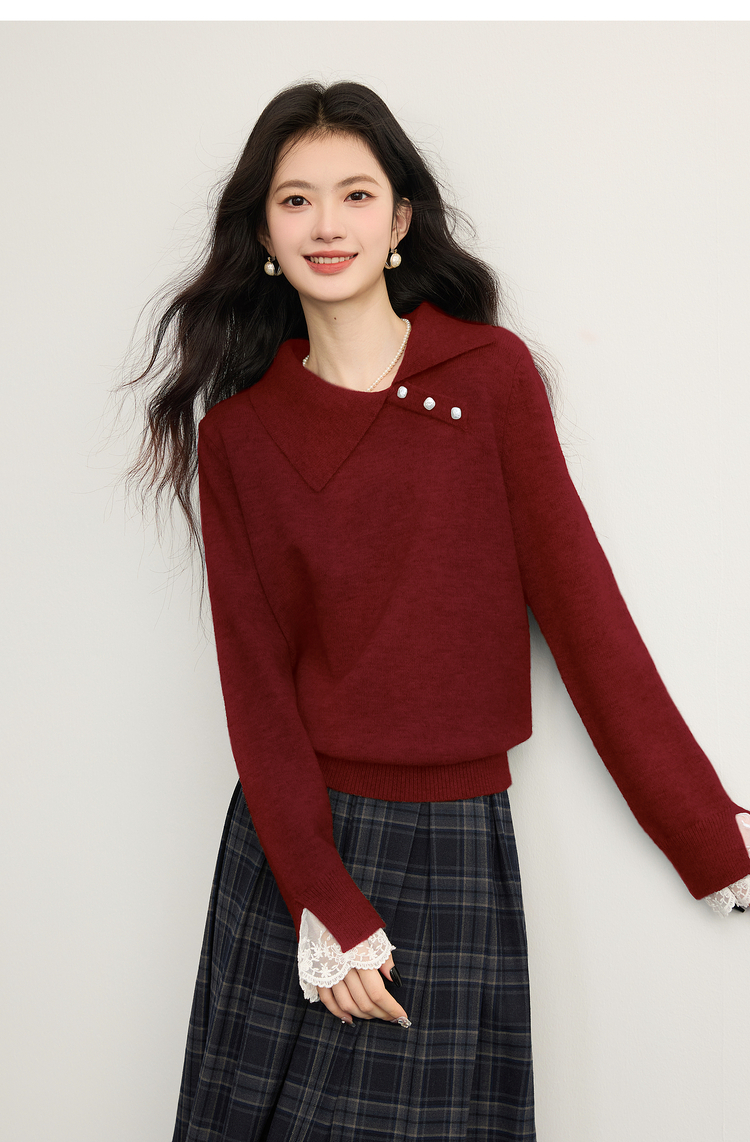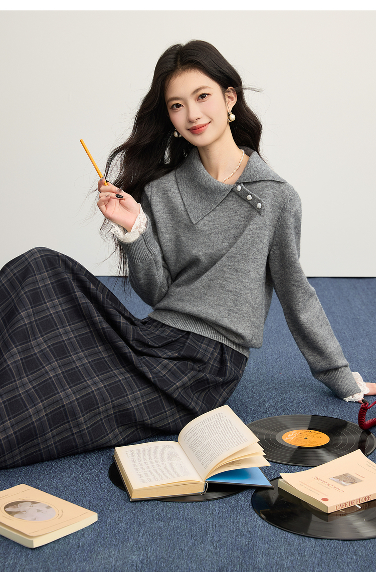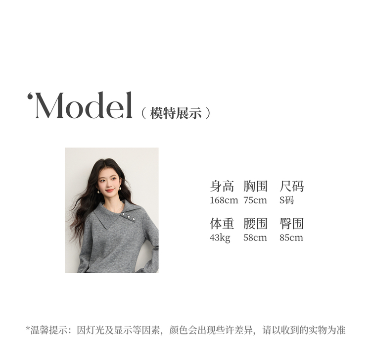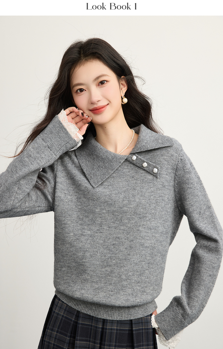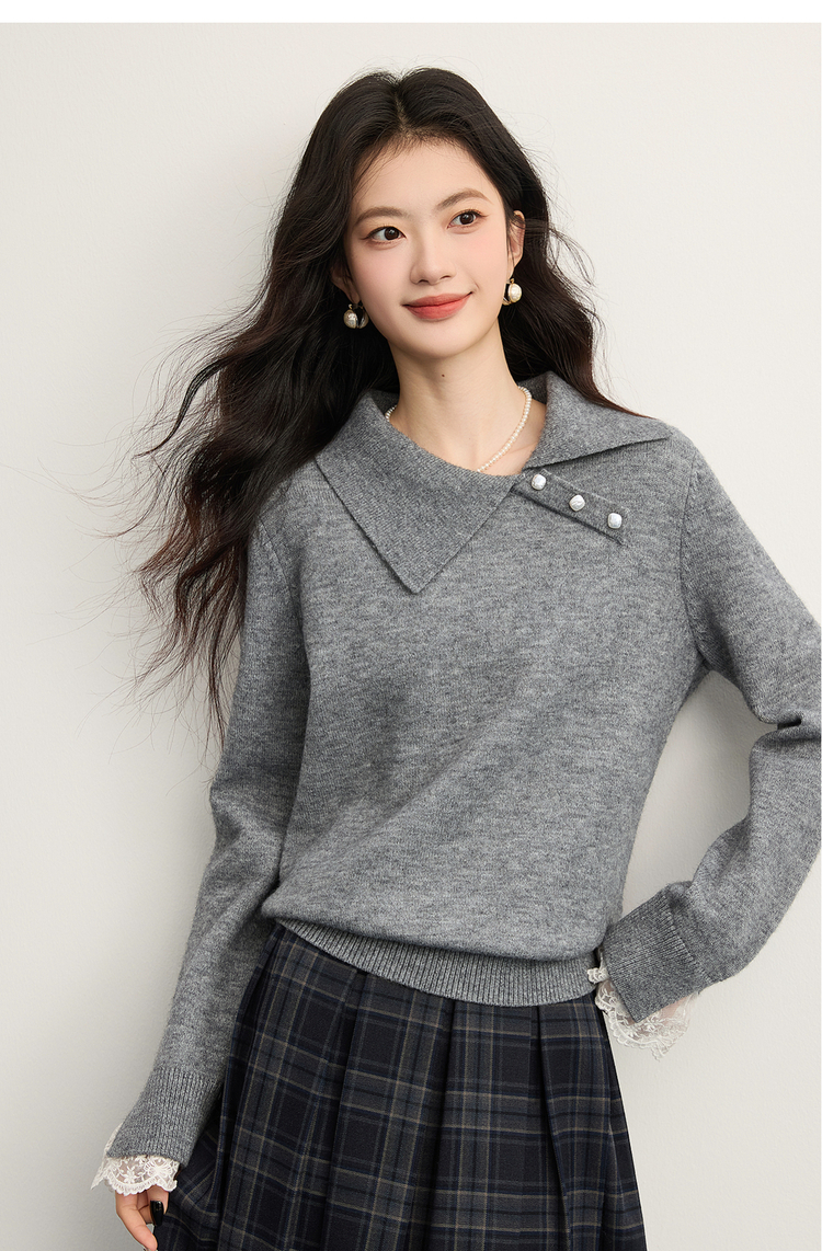 【12/10新品6折】熙世界韩系慵懒风套头毛衣女2025秋冬长袖宽松设计感翻领针织上衣