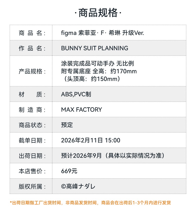 【GSC预售定金】figma 索菲亚· F· 希琳 升级Ver. BUNNY SUIT PLANNING 附官方限定特典