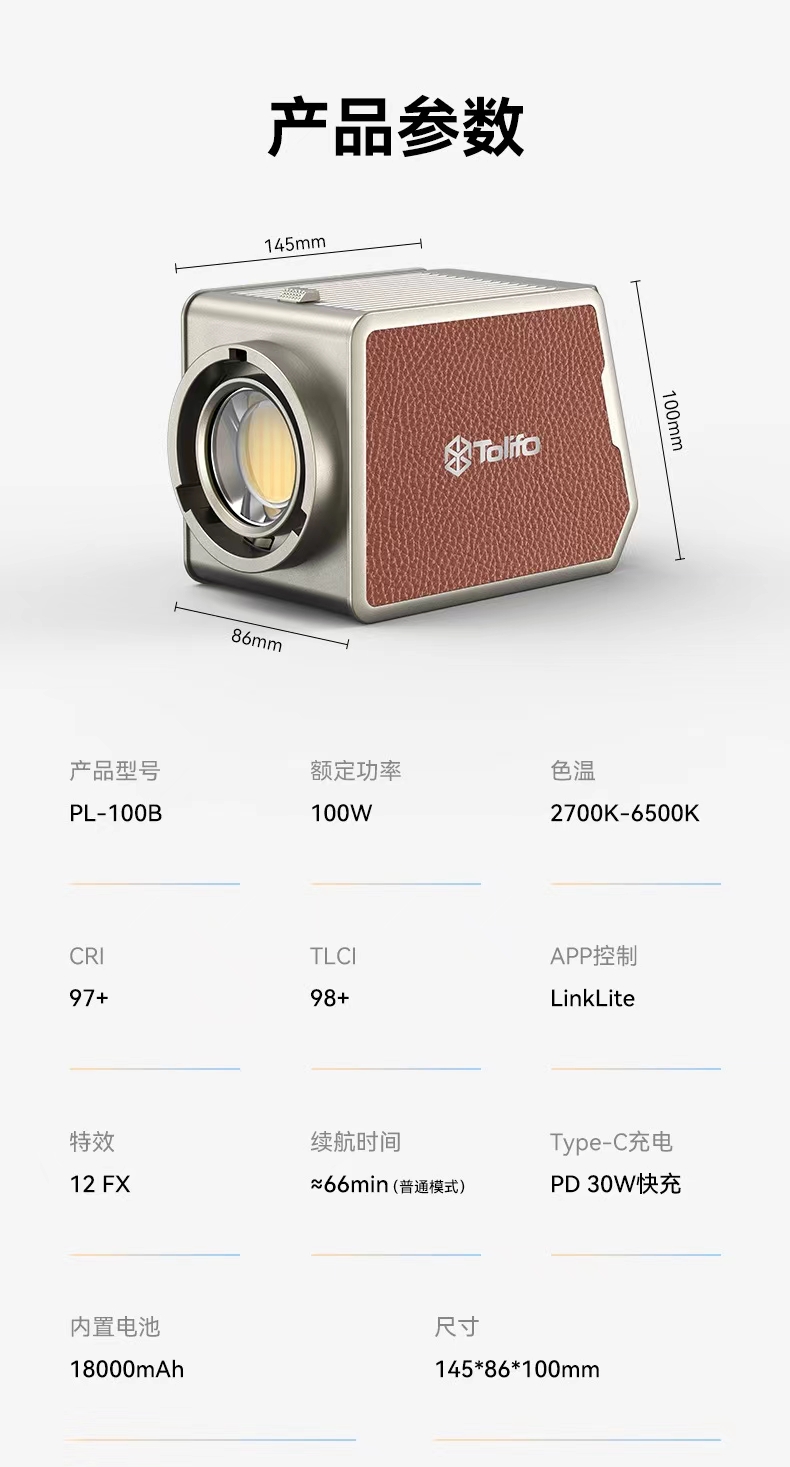 狼族优选丨图立方Tolifo超亮100W摄影补光灯 内置电池标配聚光罩+柔光罩