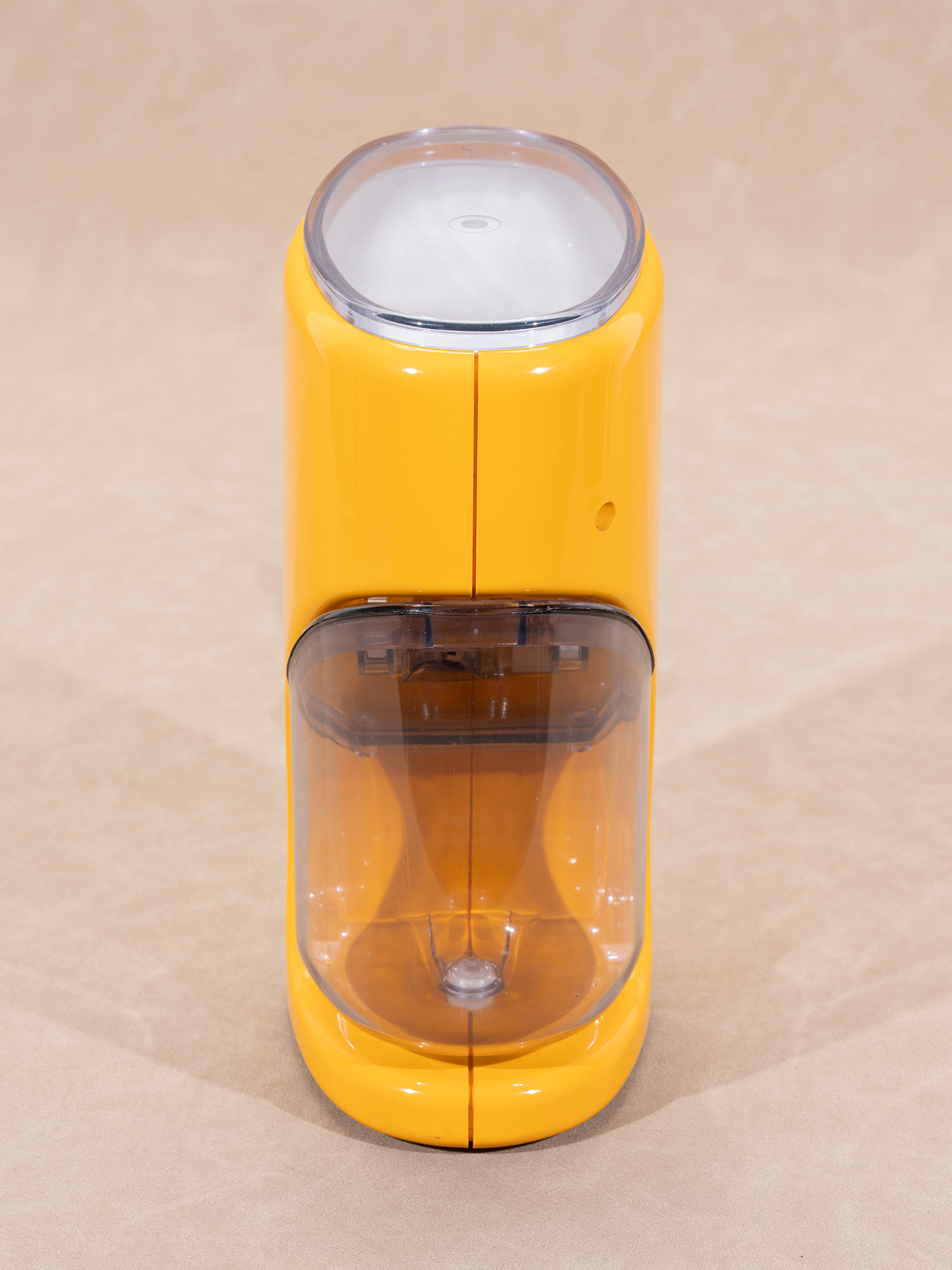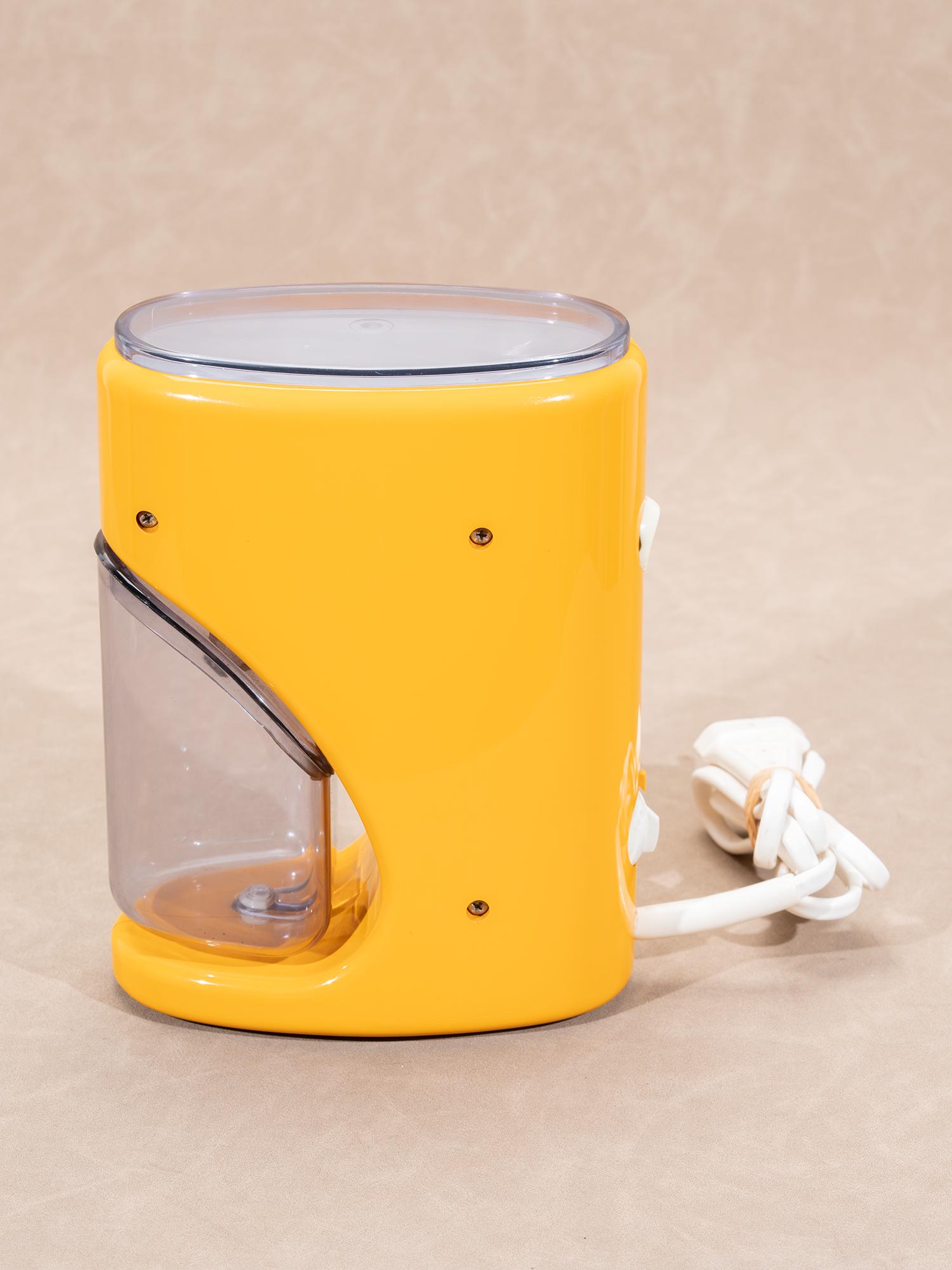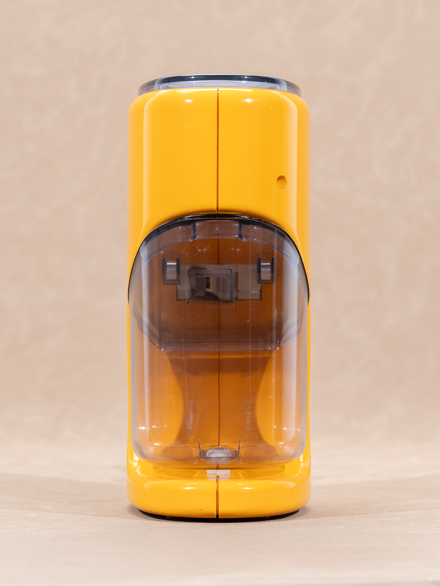 磨豆机的磨芯由金属制成,鲜艳的橙色外壳,和烟熏色盖子以及接粉罐由塑料制成,配色相当和谐。正反两面干净整洁,背部上面是一个开关按钮,下面是研磨度调整旋钮。前面的咖啡粉罐底部有一个按压钮,方便按压后轻松拿出,且咖啡粉罐的微弧度斜口设计,让咖啡粉能丝滑倒出。