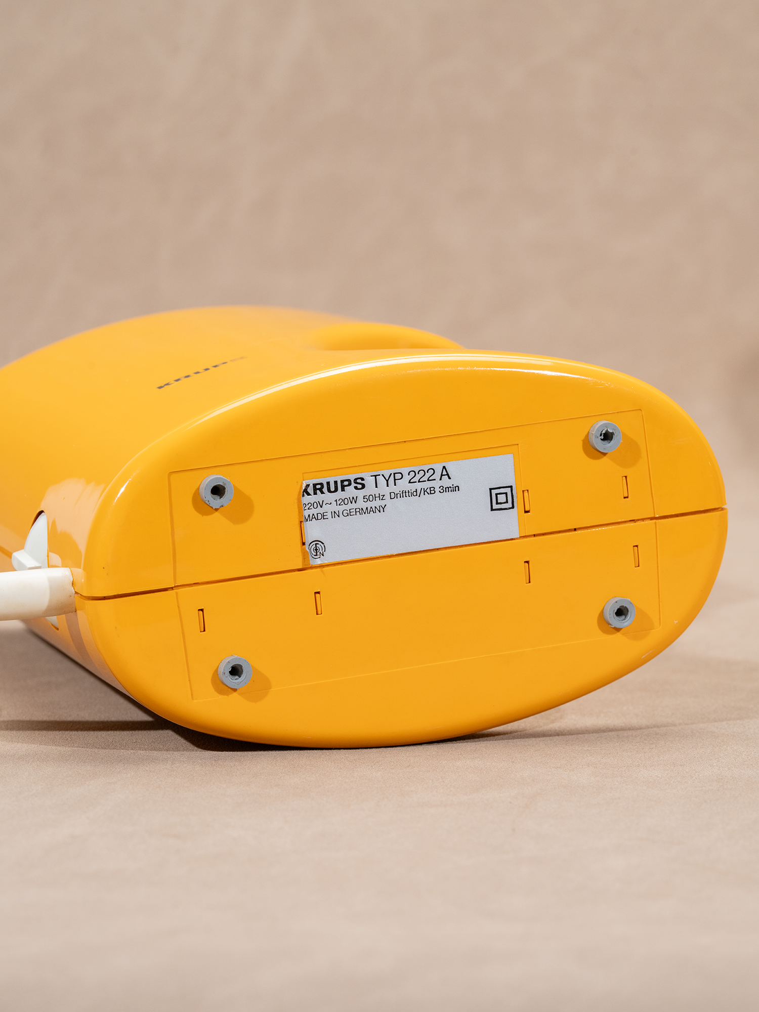 底部除了印有 KRUPS LOGO,还标注了型号 222(或 222A),MADE IN GERMANY 的字样,以及220V ~120W 等信息。另外,整个研磨机上下左右前后,无直角,均圆角收边,使用起来的体验感非常友好且丝滑(也不用担心小朋友触碰)。