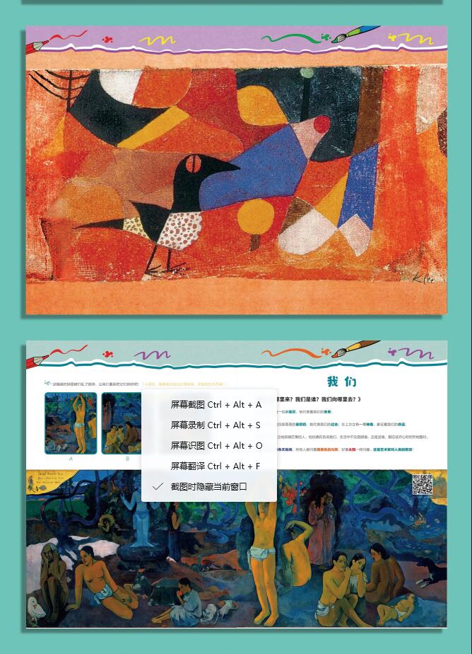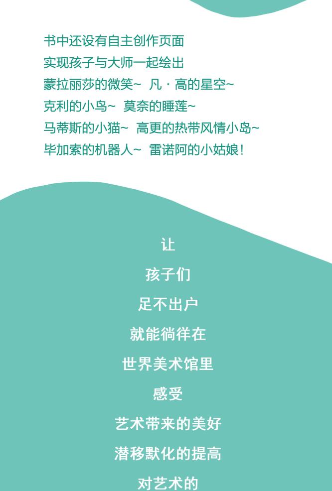 在欣赏大师绘画的同时,随时可以拿起画笔,表达自己的想法,和大师一起绘出蒙拉丽莎的微笑;凡·高的星空:克利的小鸟;莫奈的睡莲,马蒂斯的小猫,高更的热带风情小岛,毕加索的机器人!受到启发的涂鸦,才是珍贵的体验和感受!孩子们足不出户就能徜徉在世界美术馆里,感受大师艺术带来的美好,潜移默化的提高对艺术的欣赏力,想象力与创造力。