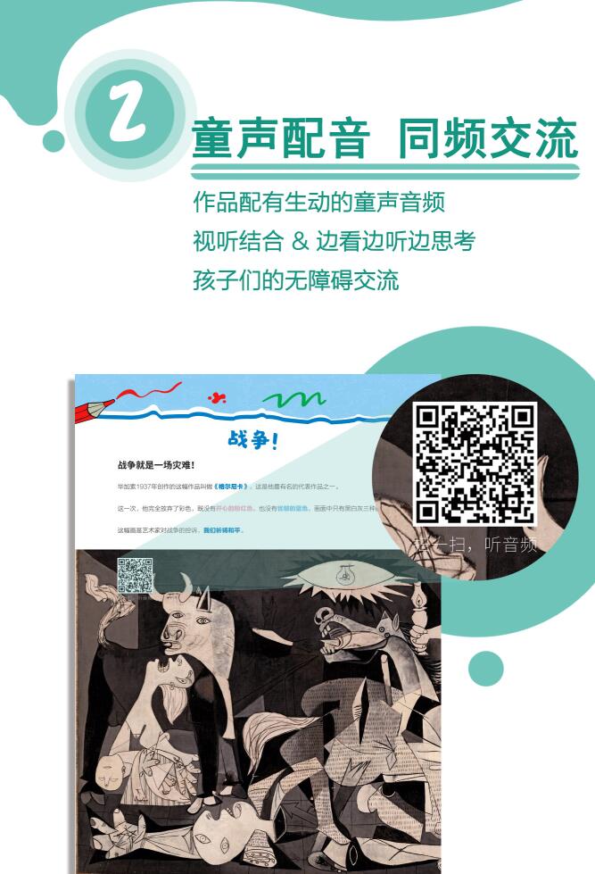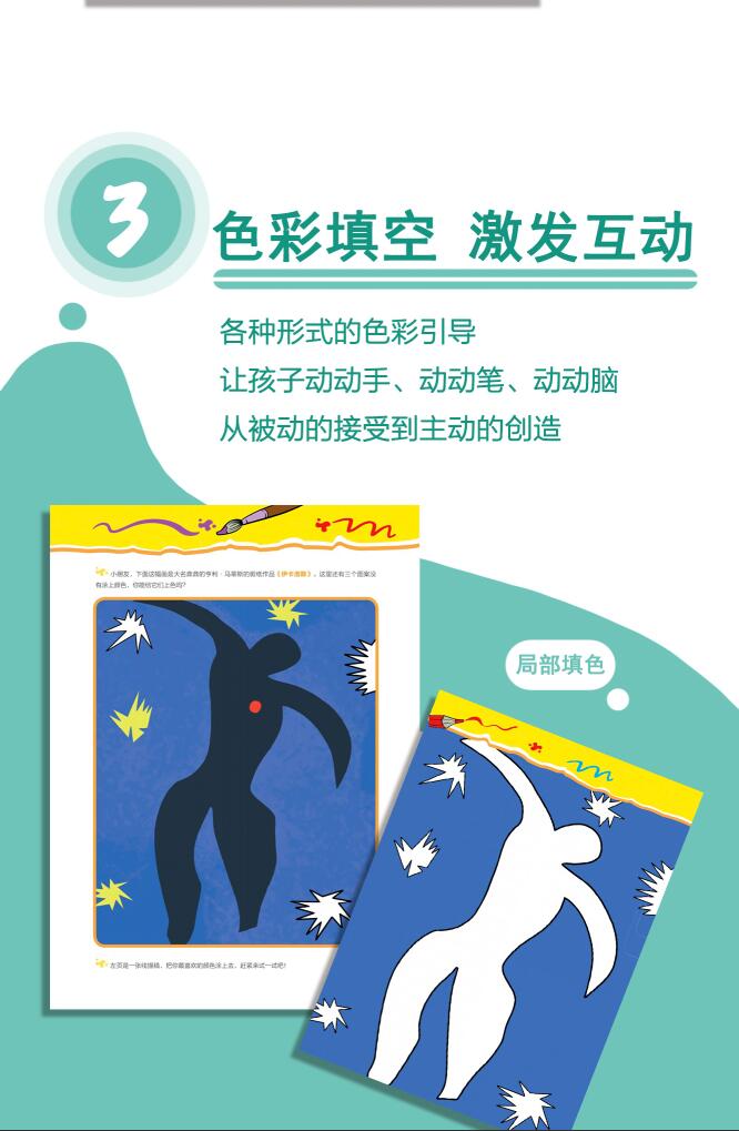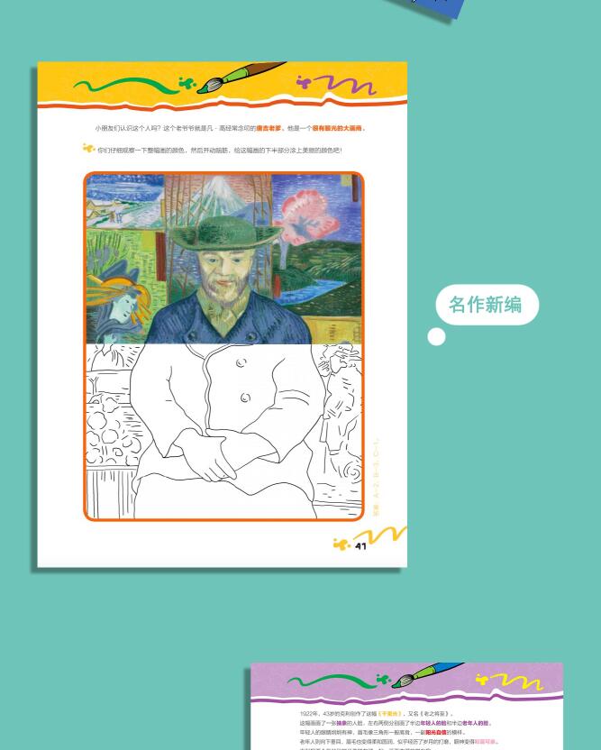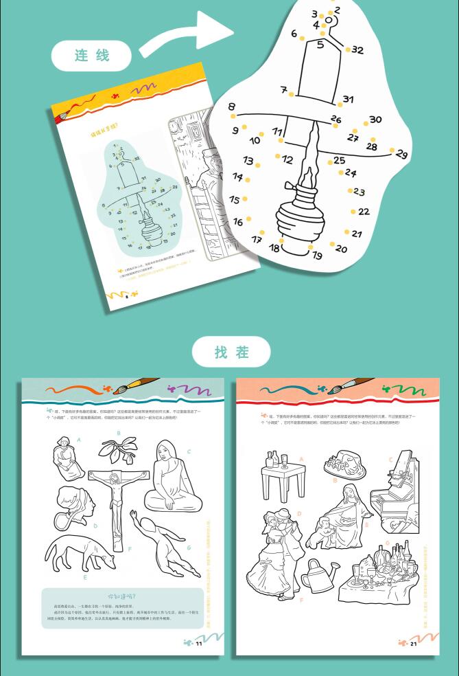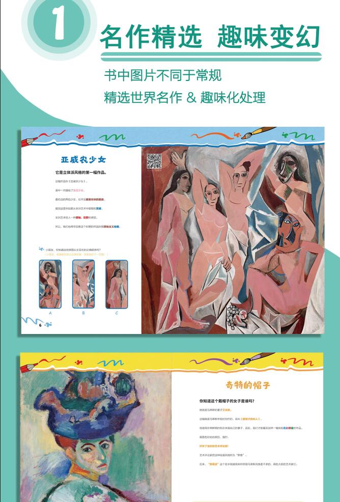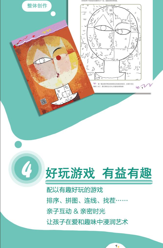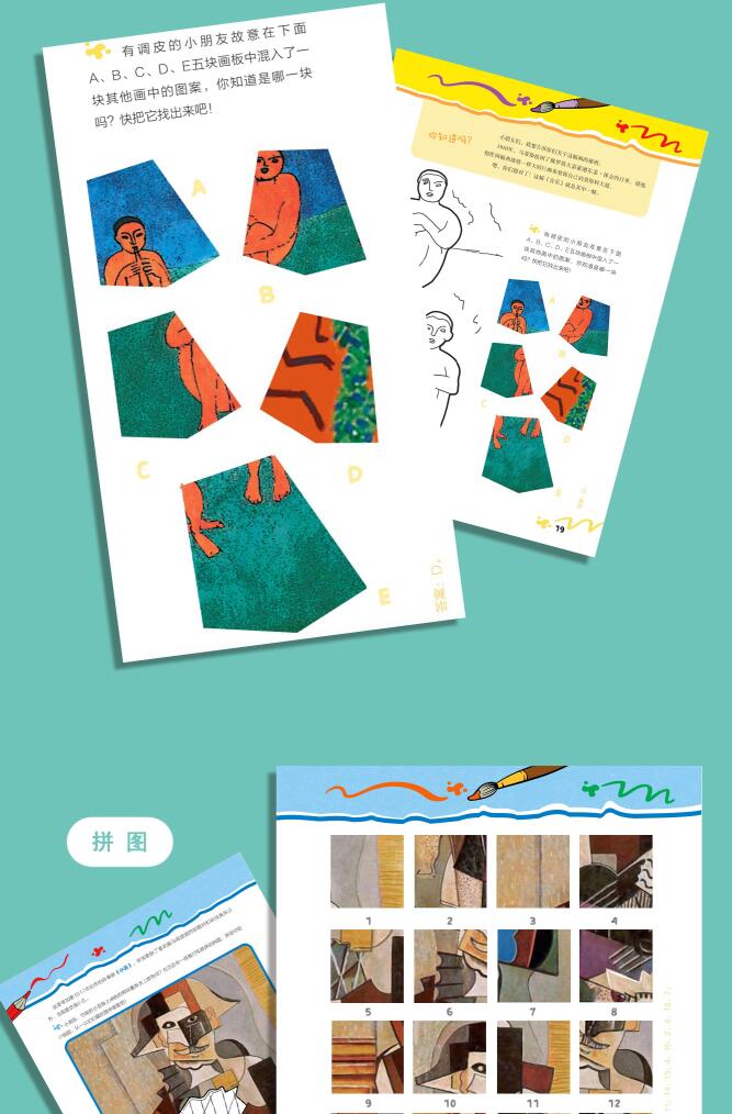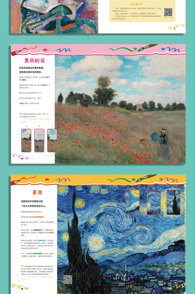 共分八册,每册都是一位既是世界的又适合孩子们学习的画家。书中图片与常规不同,分别以精彩的大图,向孩子们讲解,世界艺术大师的传世作品,和局部图片填空,激发孩子与作品的互动,配以有趣好玩的游戏,错位、拼图、连线、找茬…让孩子在趣味中接收艺术的熏陶。作品配有生动的童声音频,完全属孩子们的同频交流,书中还设有可以自主创作的图画页面,看听画玩,全方位向孩子们呈现立体多维的名画世界,孩子们的学习能力是非常强的!