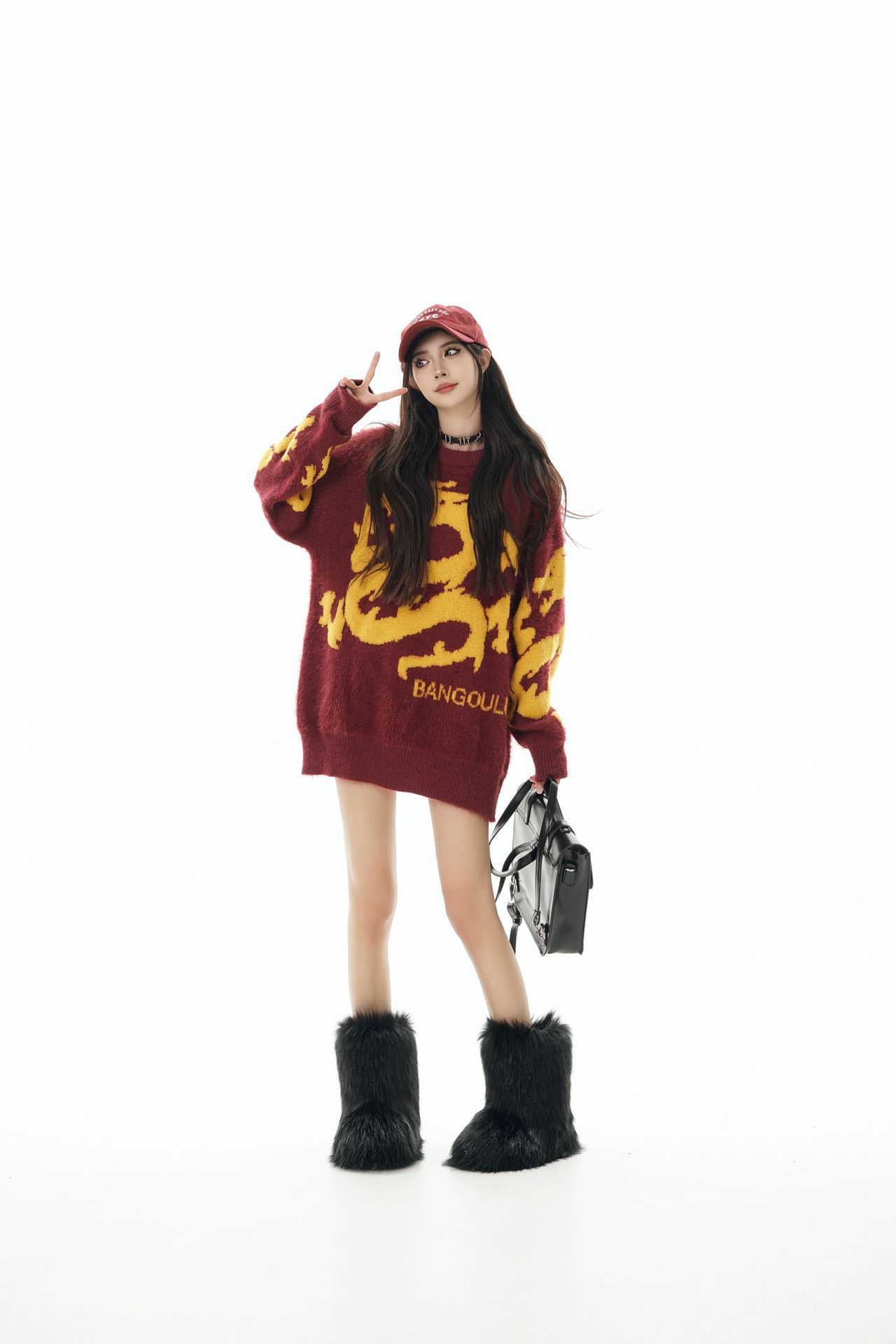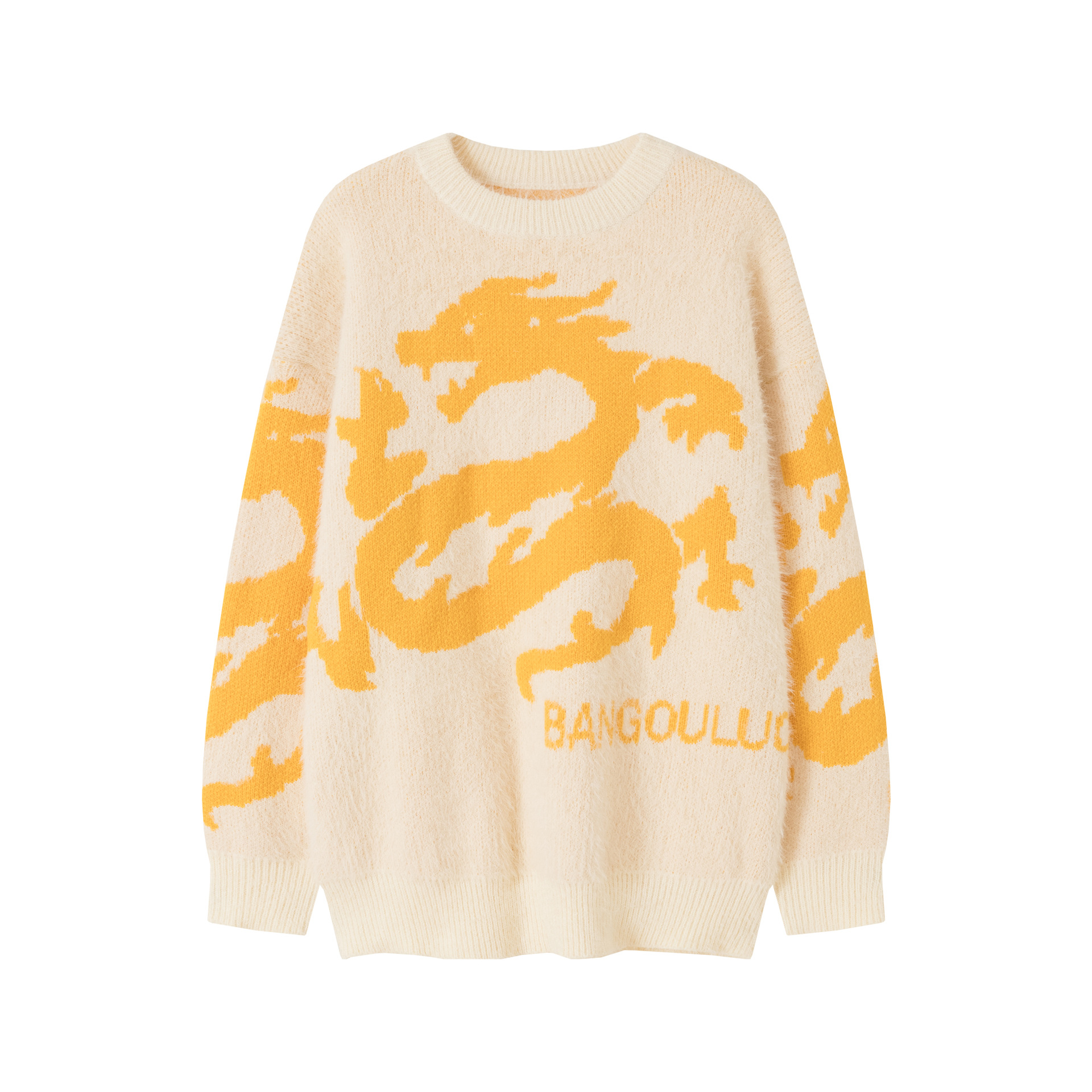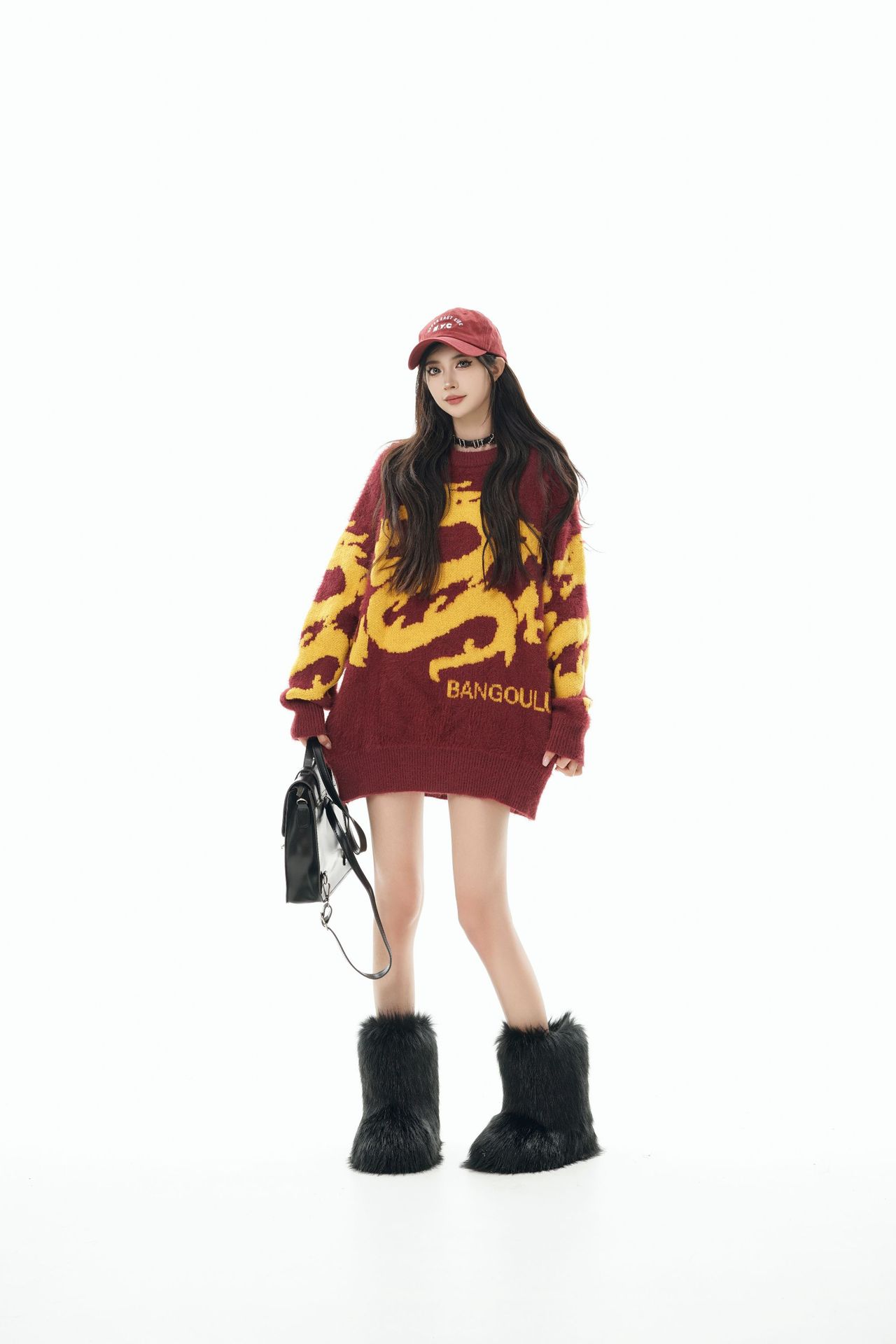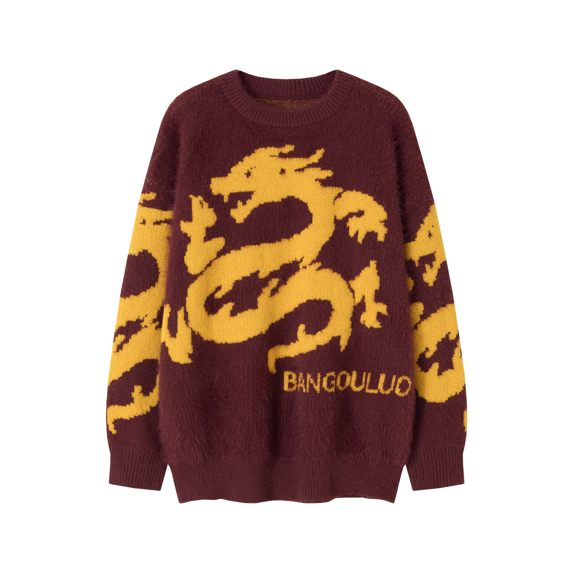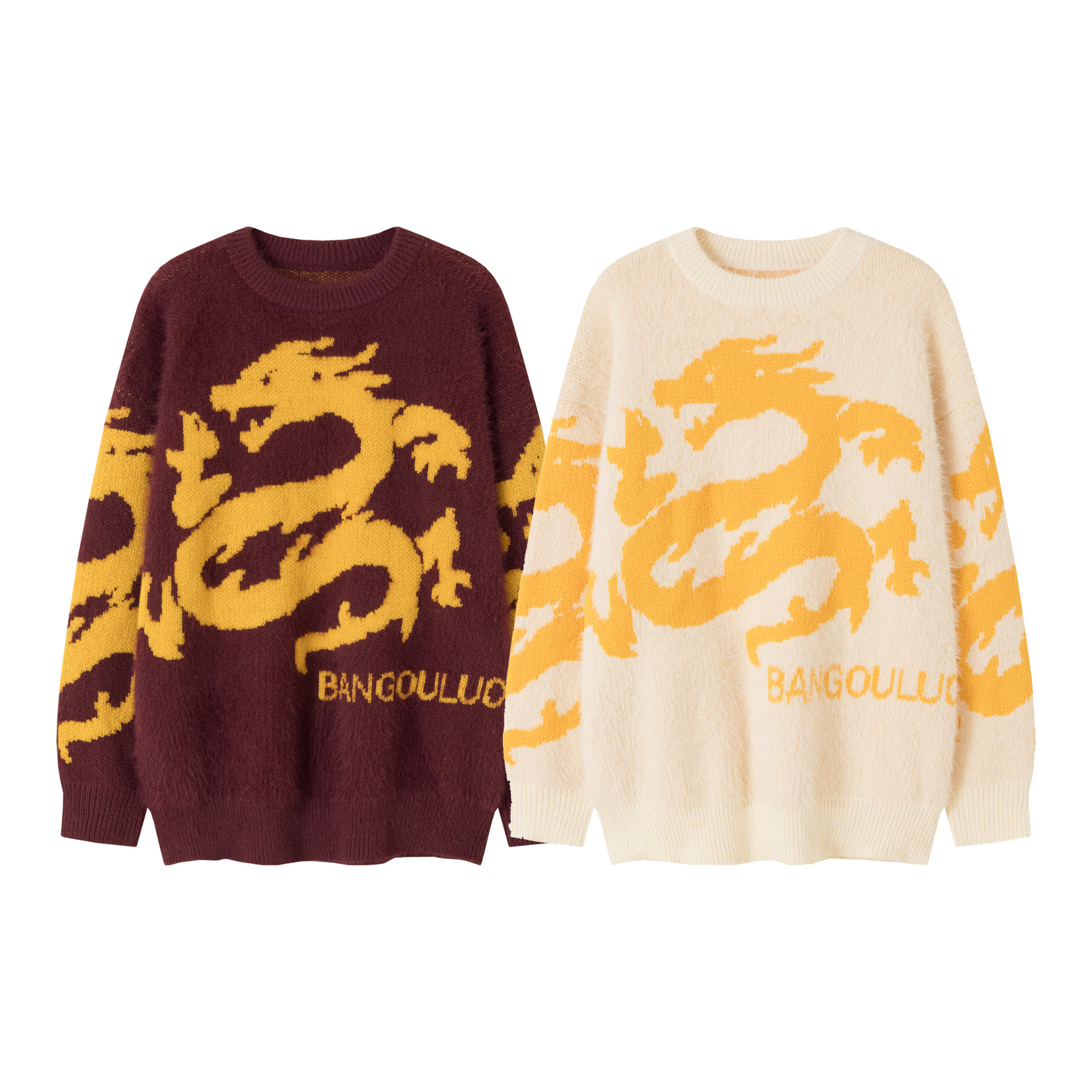 秋冬新款实拍宽松情侣版龙年提花圆领针织毛衣