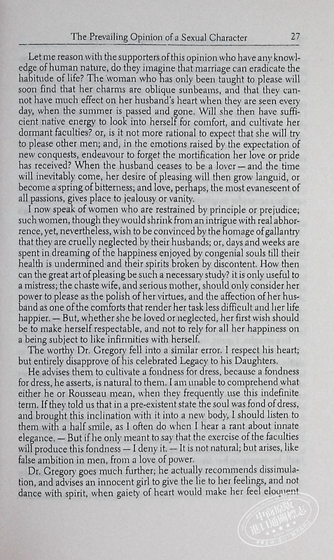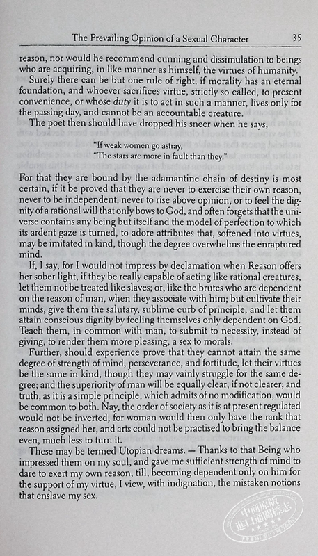 沃斯通克拉夫特并不是一个心胸狭窄的狂热分子,她在热情的倡导和同情的温暖之间找到了平衡——这一特点帮助她的思想获得了广泛的影响。任何对妇女权利运动历史感兴趣的人都会欢迎这本廉价版的书籍,它是争取人类尊严、自由和平等的斗争中具有里程碑意义的文件之一。