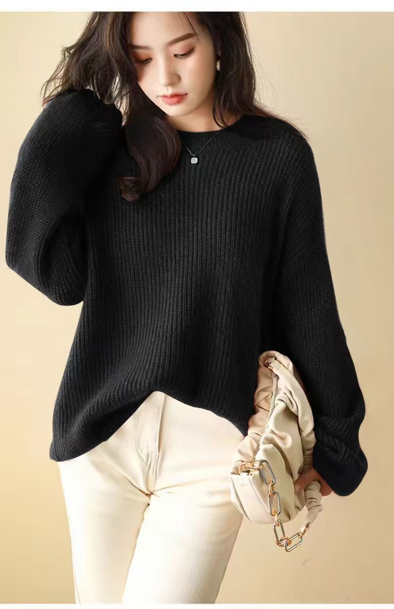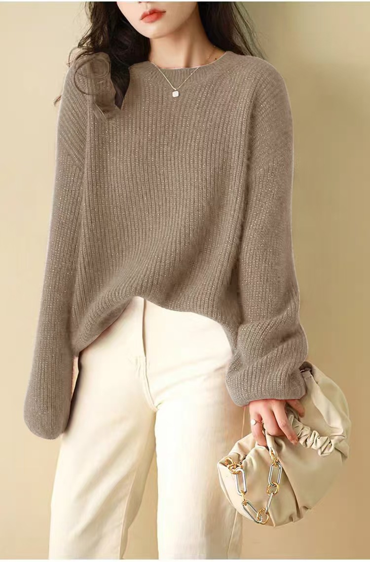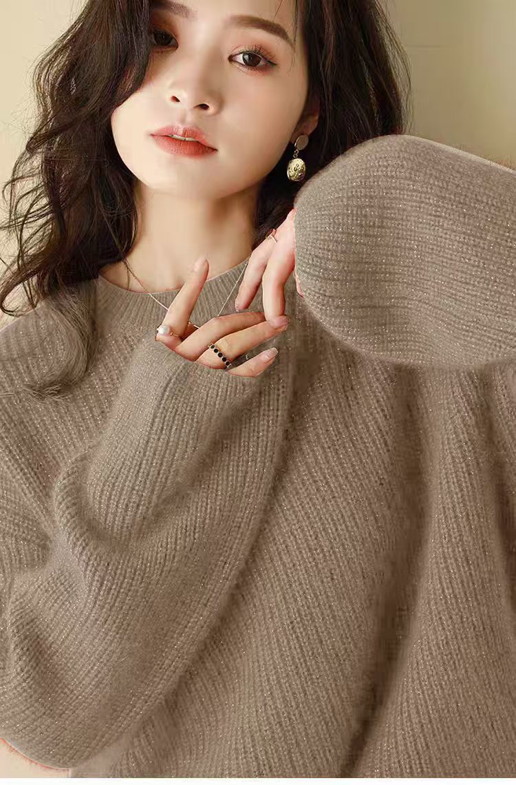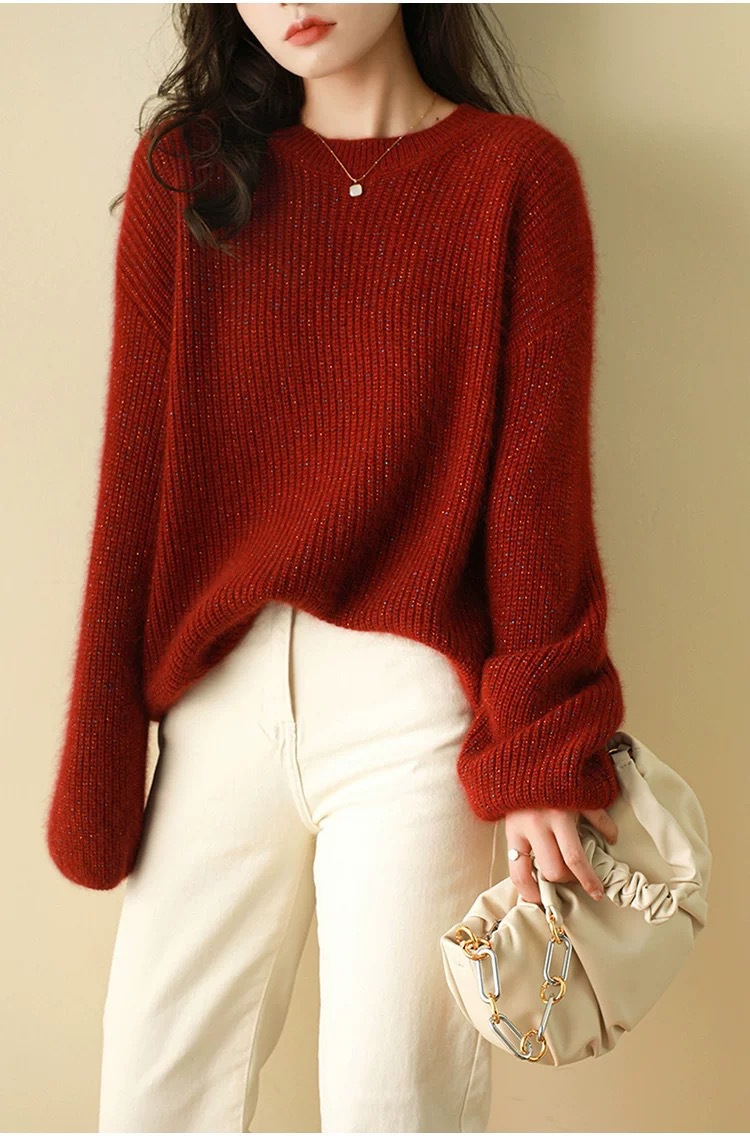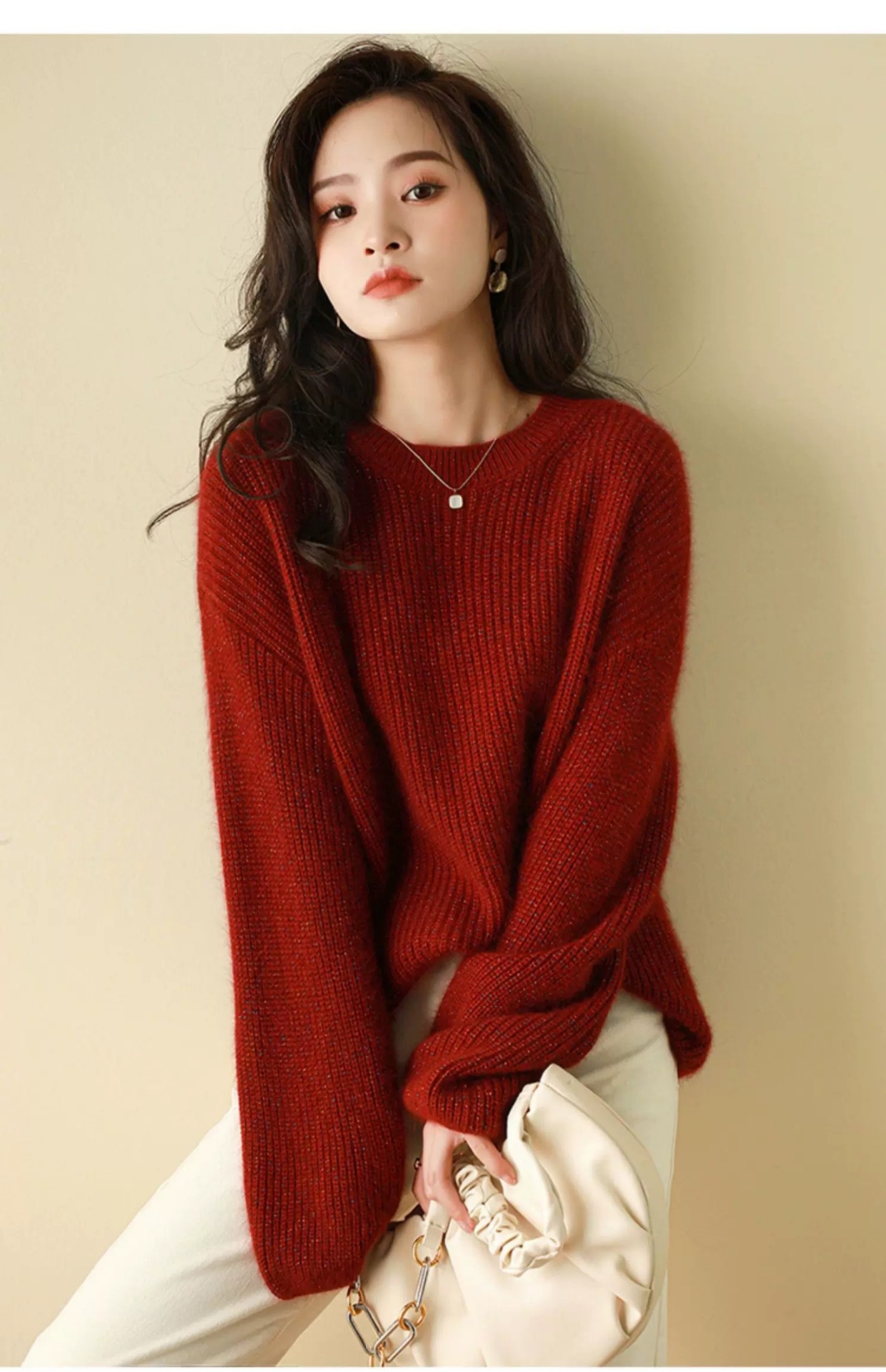 【秋冬新款100纯羊毛衣】新年红色圆领女士打底衫 宽松慵懒风亮丝毛衣潮