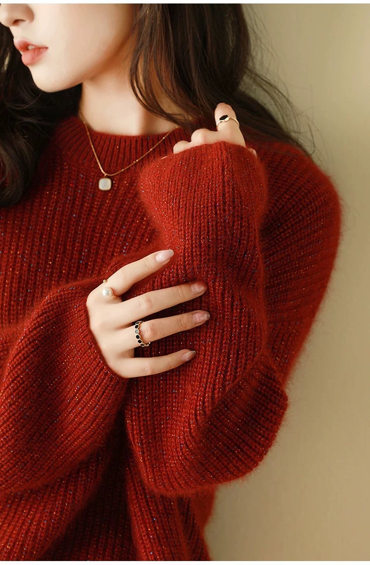 红色亮丝宽松100纯山羊绒衫女2024年冬欧货高端加厚慵懒打底毛衣