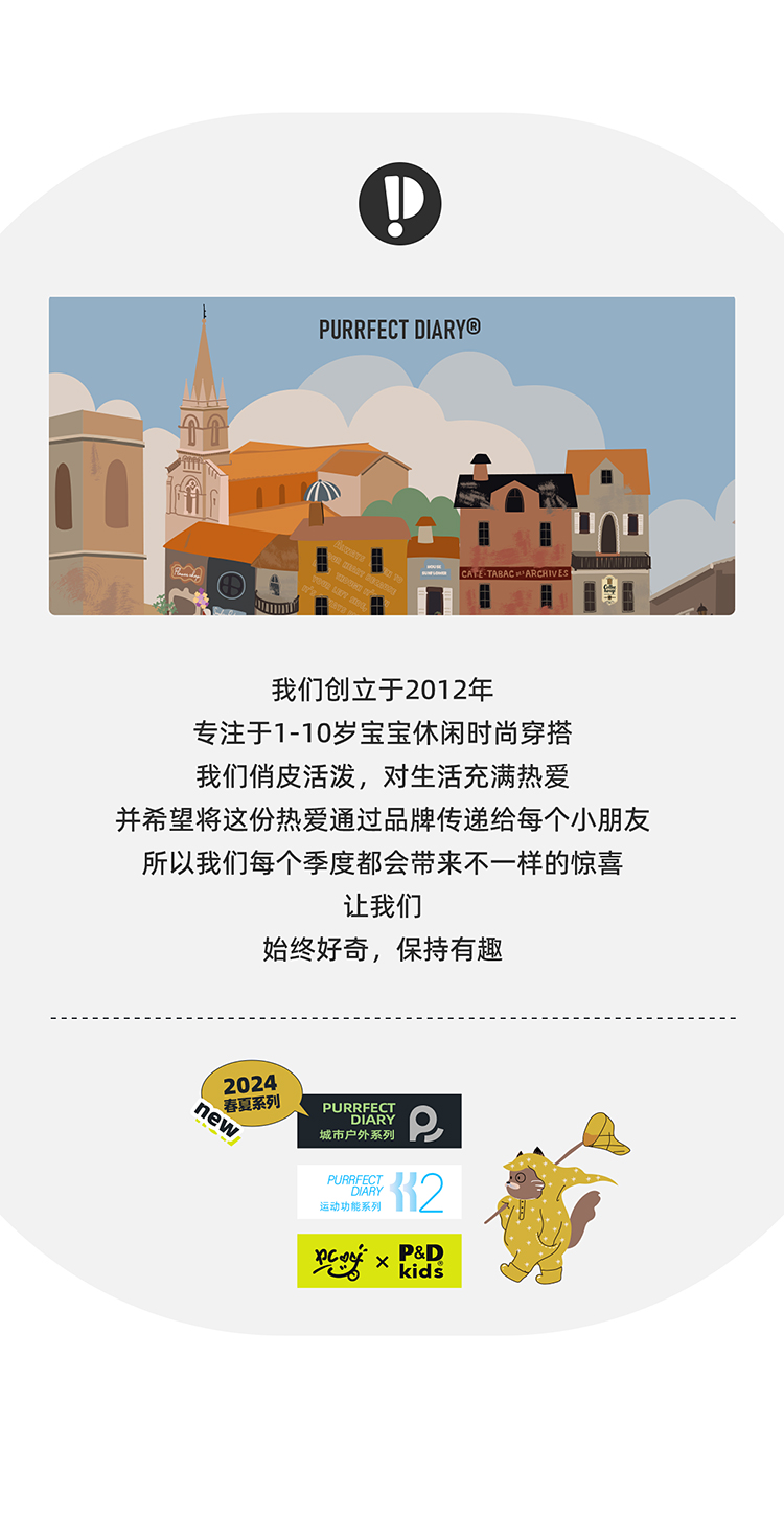 - Purrfect-Diary专注于贴近自然随性的穿着概念,轻奢平价的童装文化传播,在产品设计上更加注重婴童穿着的舒适性、安全性、更出众的国际化品牌,将欧美的育婴文化在中国进行深入的传播与推广。