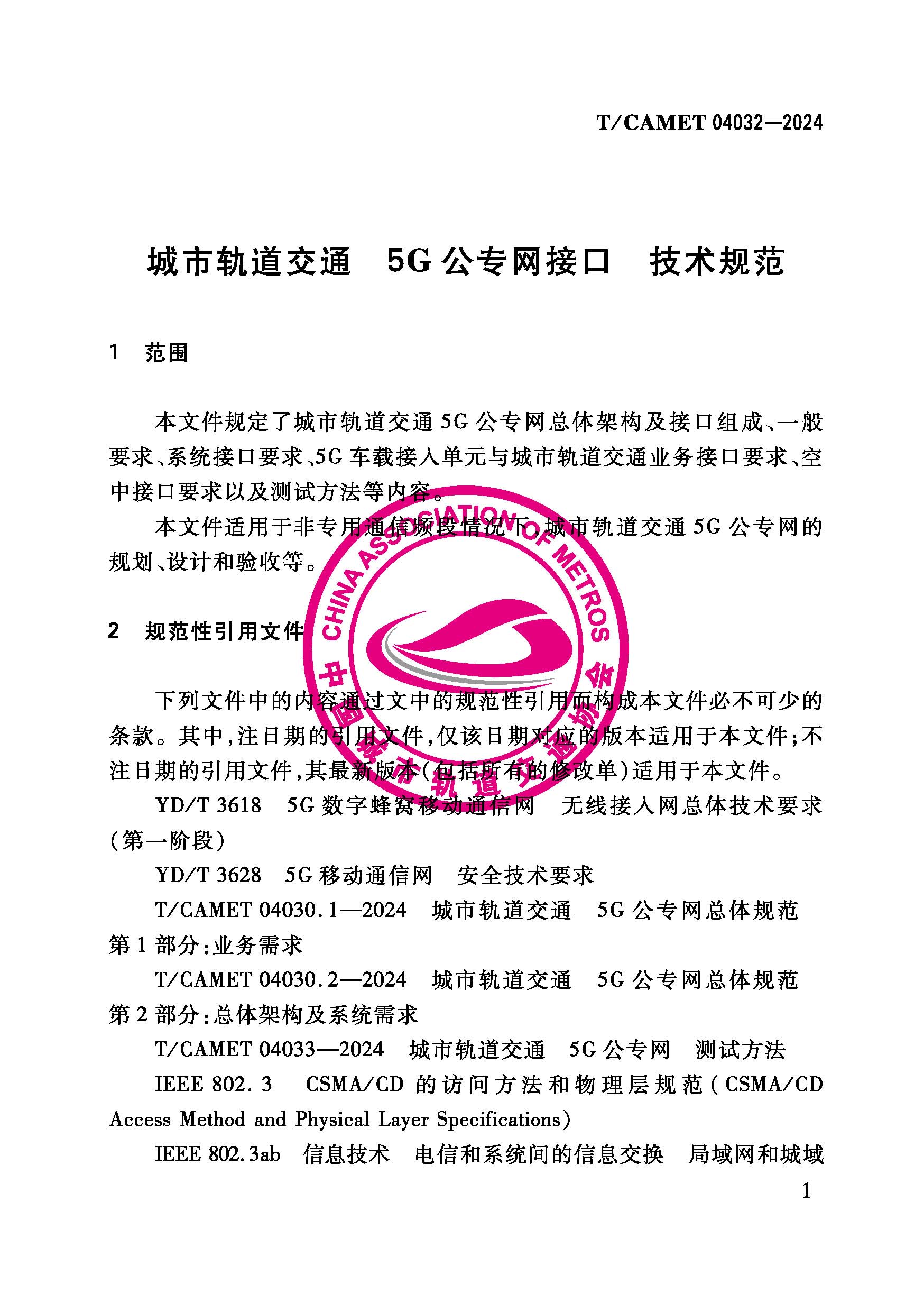 7119 城市轨道交通 5G公专网接口 技术规范(T/CAMET 04032-2024)