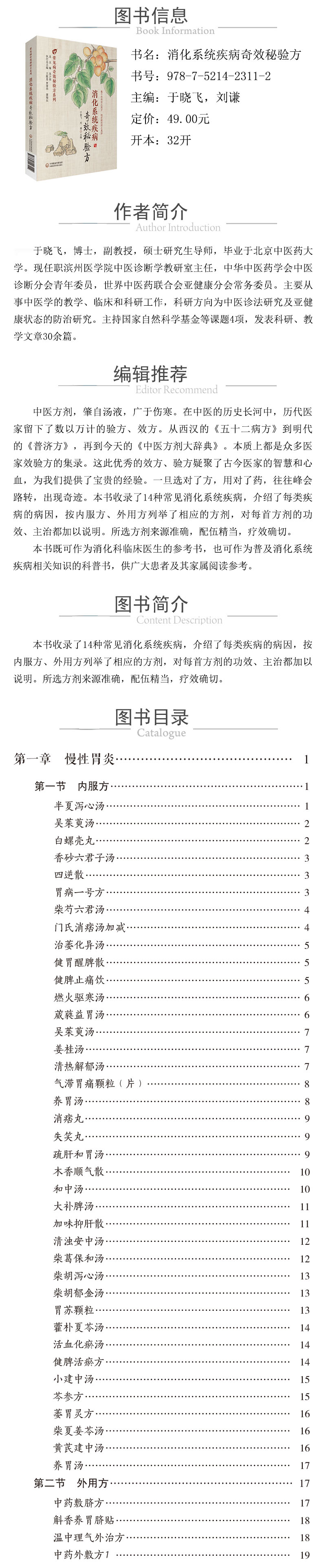 本书是常见疾病灵验效方丛书之一,约21万字。全书以疾病为纲,以方剂为目,荟萃了十四种常见消化系统疾病的中医验方、效方。疾病概述介绍了消化系统常见疾病的定义、典型表现及其在中医学的范畴。其内容来源于疾病的指南、行业标准、专家共识及著作等,如《中医内科常见病诊疗指南西医疾病部分》、《消化系统常见病中医诊疗指南》、《实用内科学》、《功能性胃肠病辨证论治》、功能性胃肠病罗马分类及诊断标准等。对于部分疾病(如功能性腹泻)的定义和诊断标准存在差异的情况,在综合参考著作、指南、标准的基础上,由编者讨论而定。方剂部分列出了组成、加减、制法、用法、功效、主治、来源。方剂是在广泛收集公开发表的古今医书著作,期刊杂志,学位论文和临床指南等基础上,加以精选。