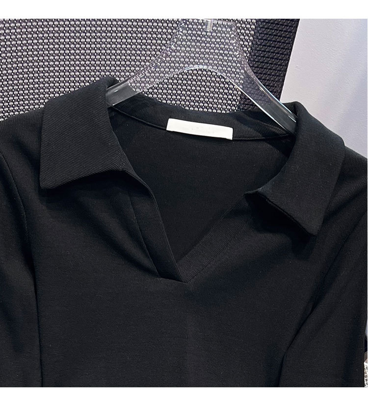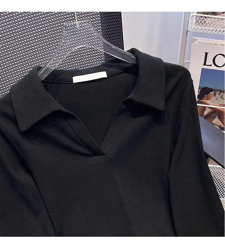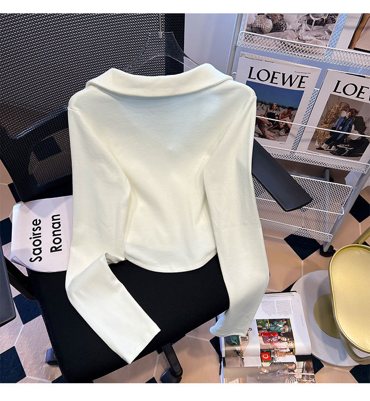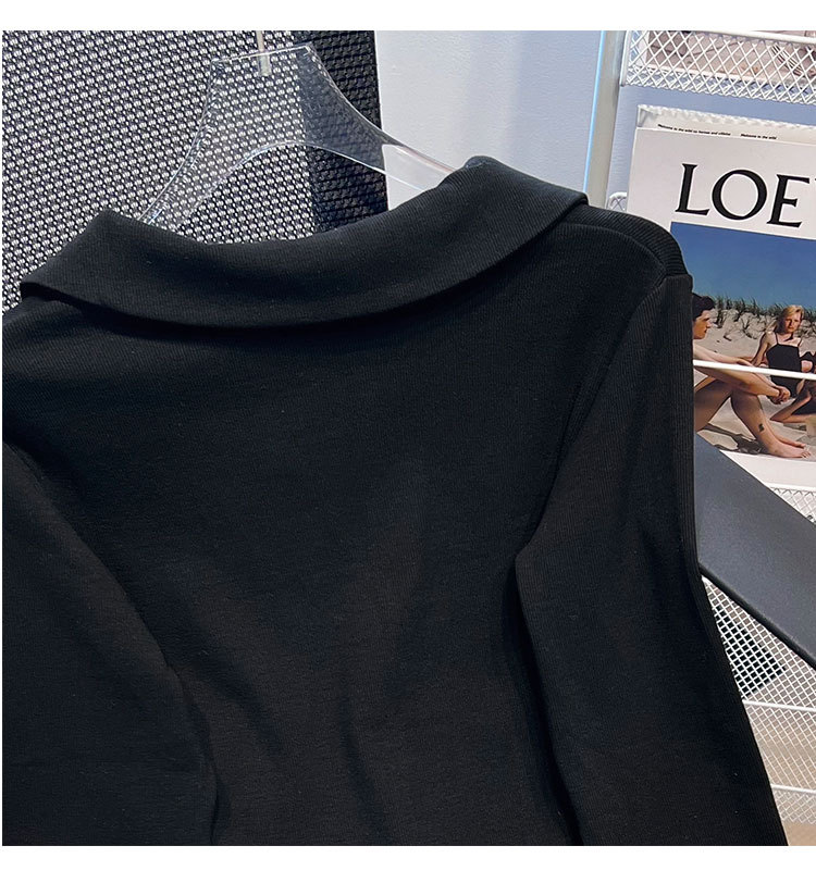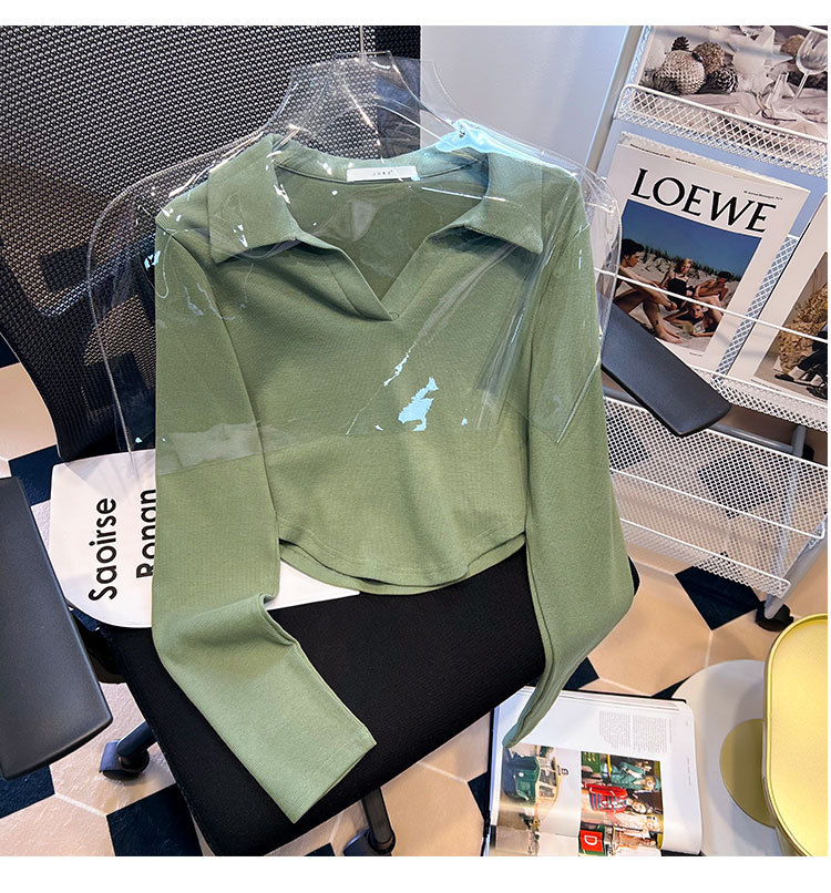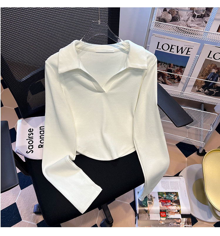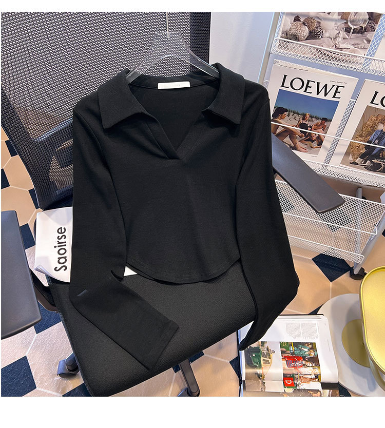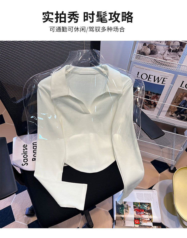 秋冬正肩Polo领T恤女美式复古纯欲甜辣短款V领上衣内搭长袖打底衫