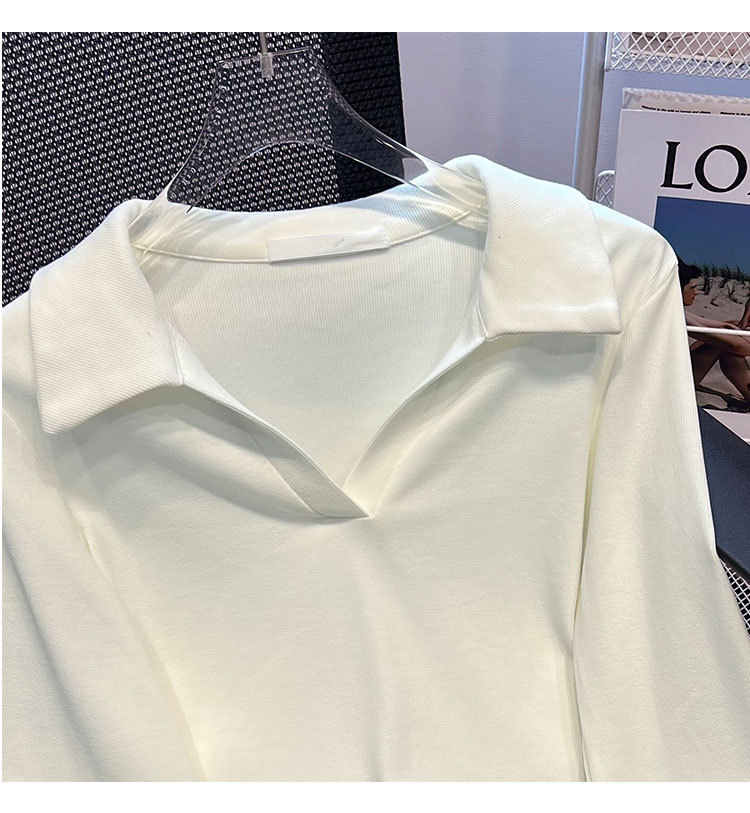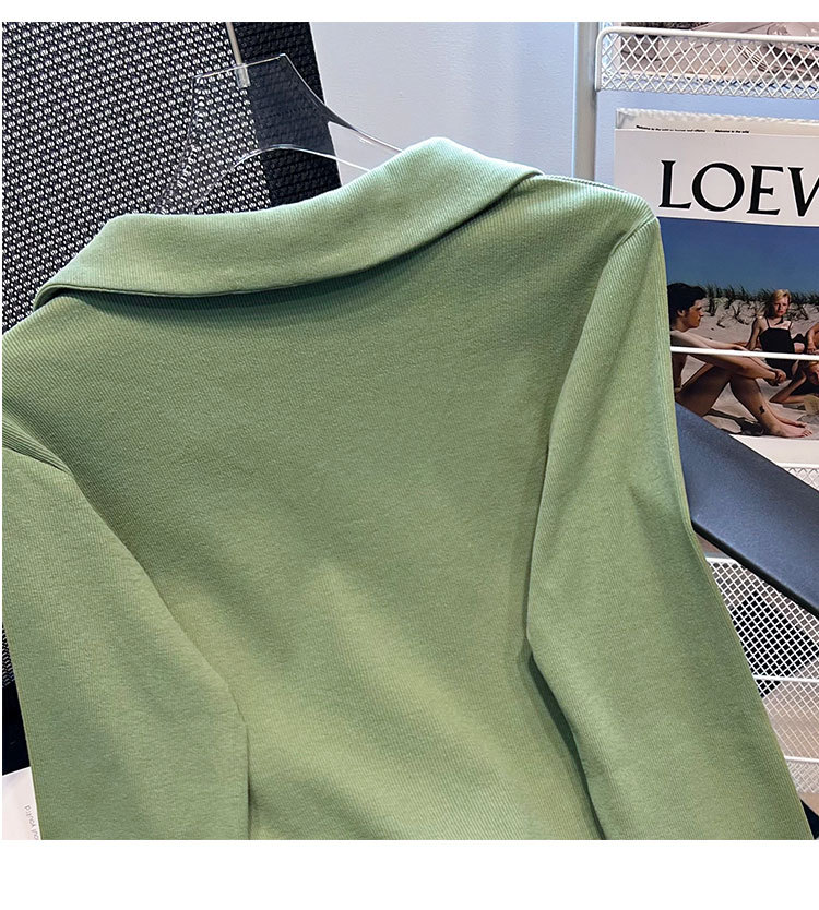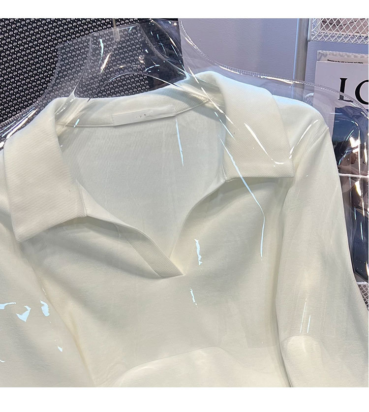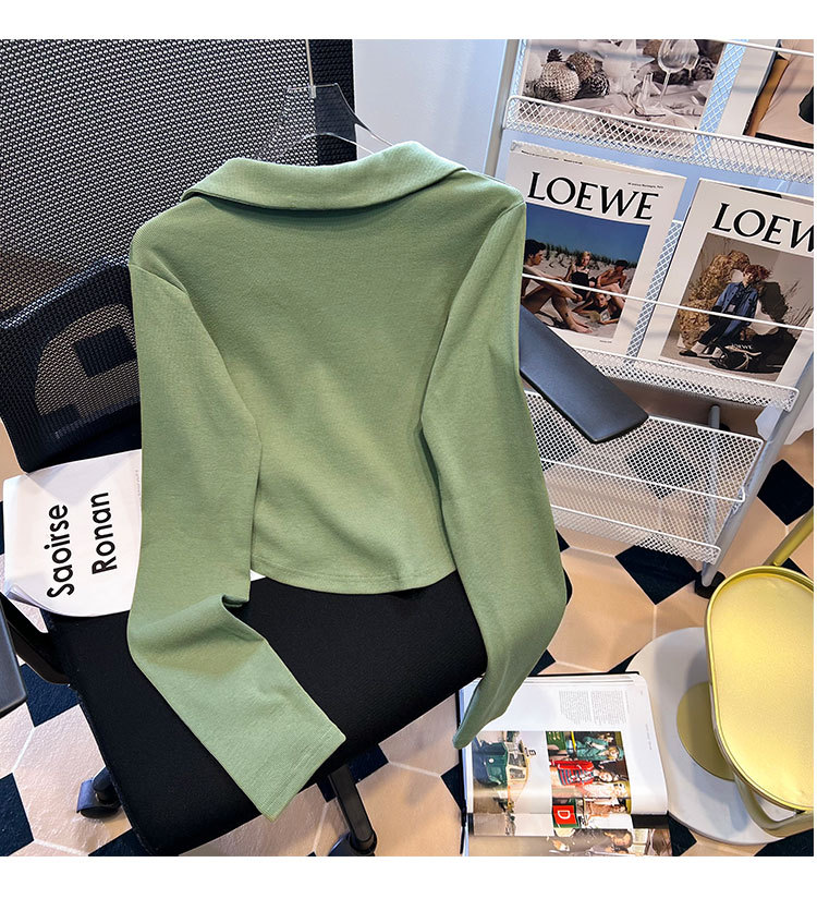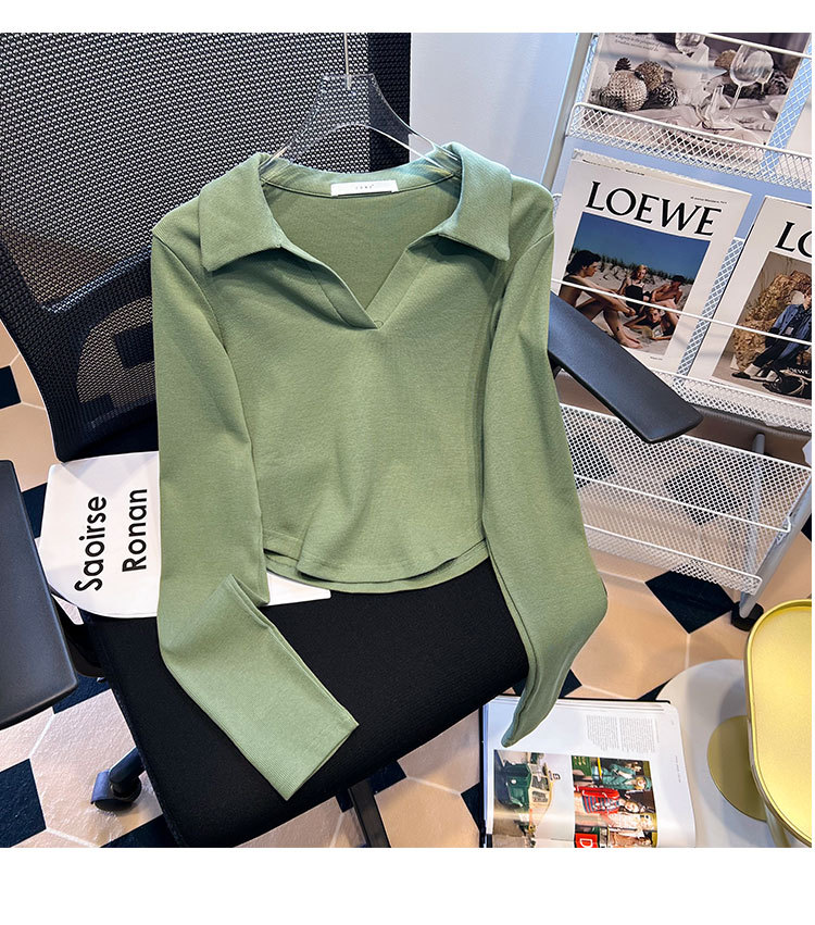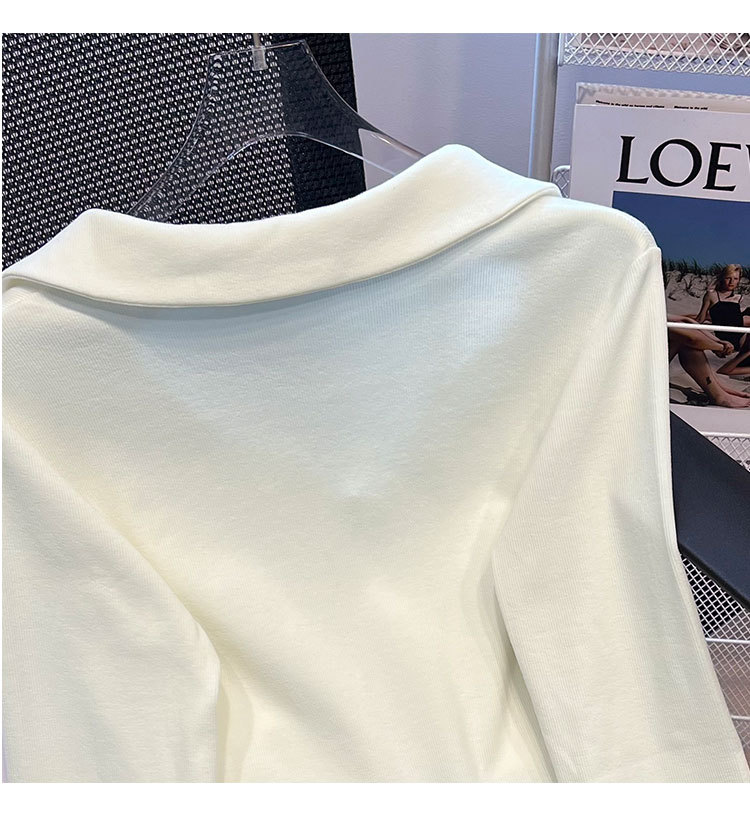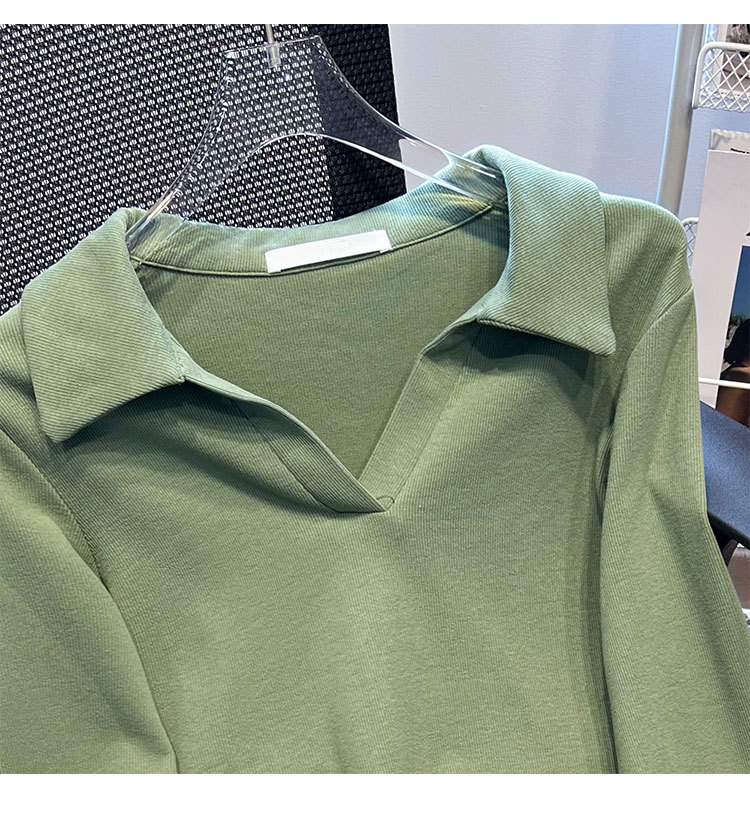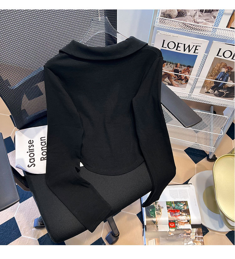 秋冬正肩Polo领T恤女美式复古纯欲甜辣短款V领上衣内搭长袖打底衫