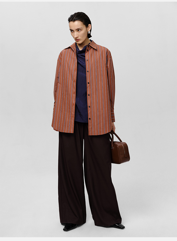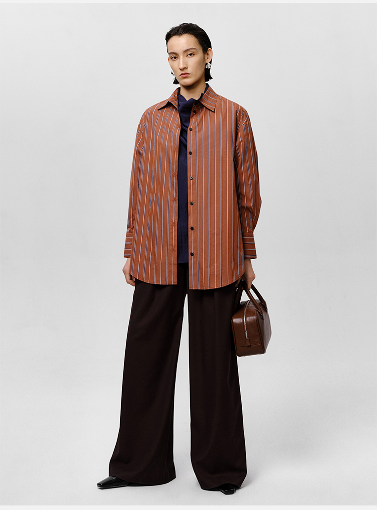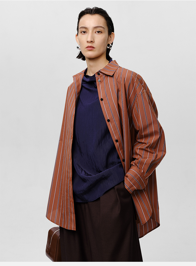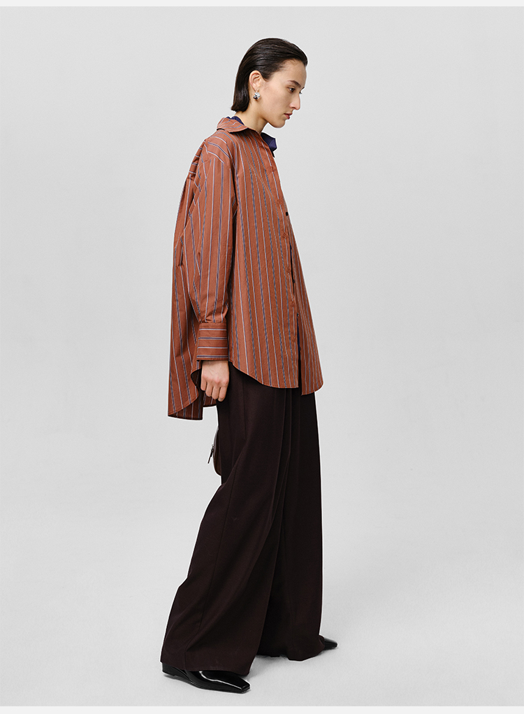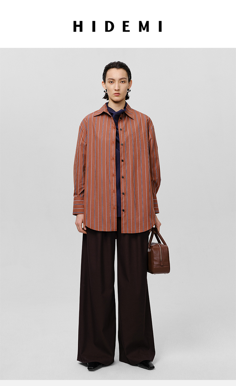 HIDEMI 砖红色色织条纹极简廓形剪刀领衬衫