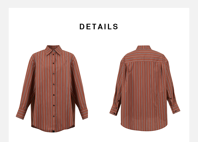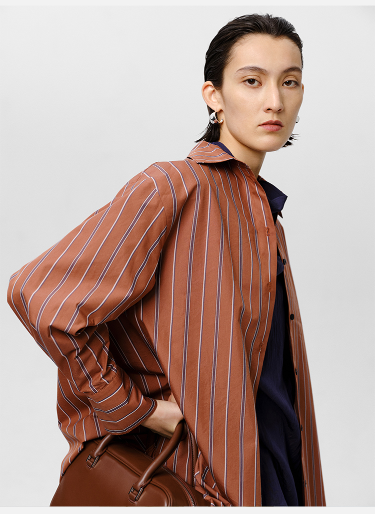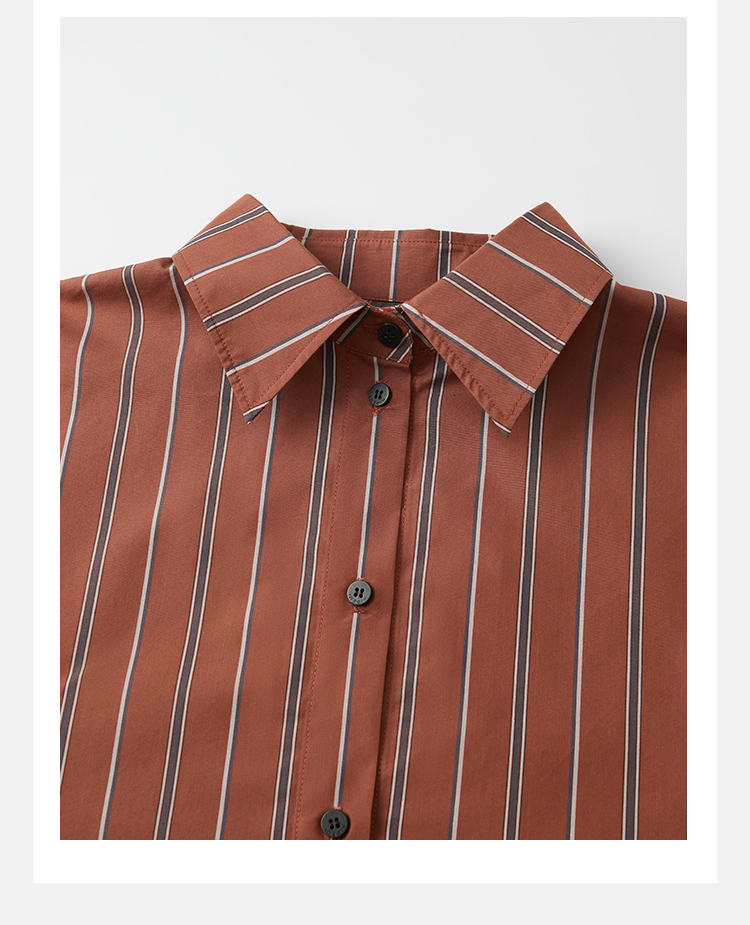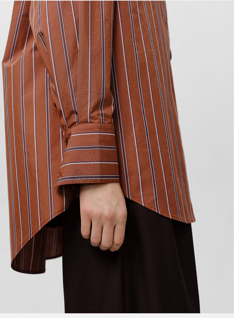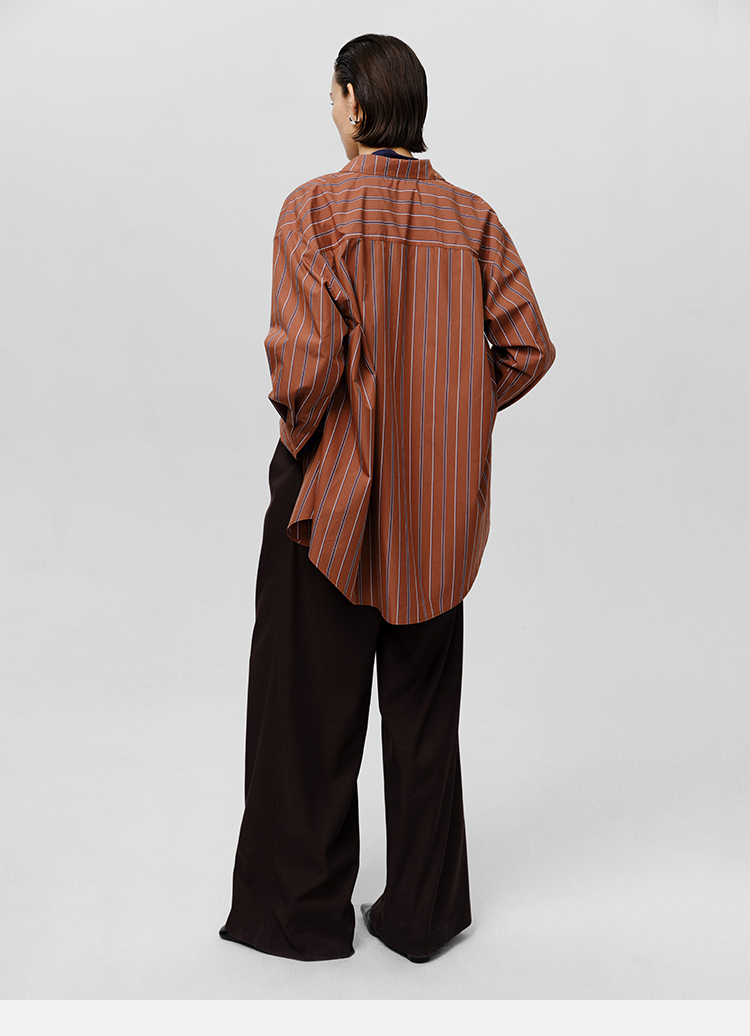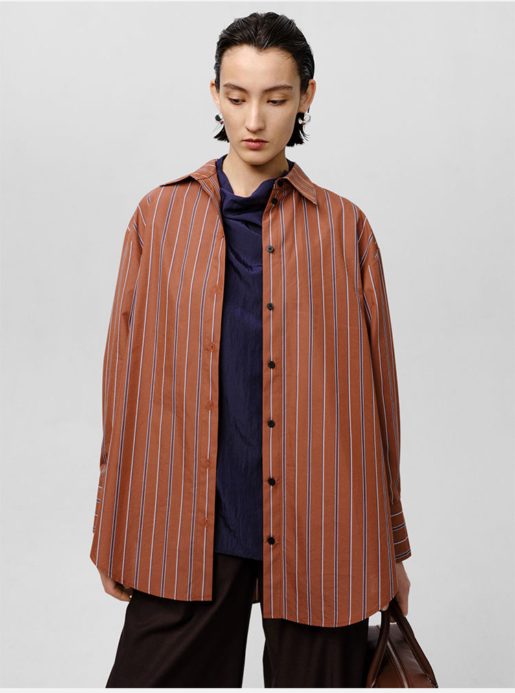 HIDEMI 砖红色色织条纹极简廓形剪刀领衬衫