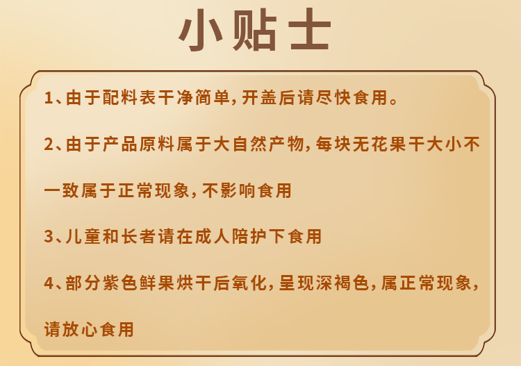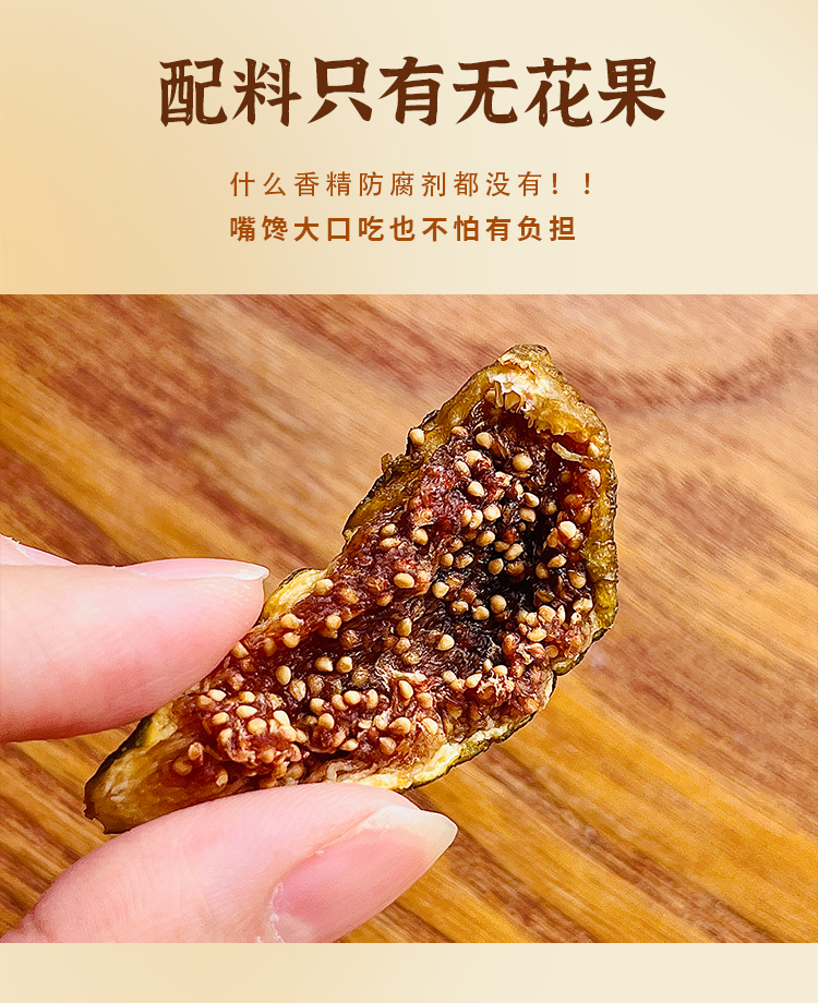 2.自然成熟的无花果手工切瓣烘干制作,未经其他加工,果皮颜色呈烘干后的自然色,深浅、大小有异,属正常现象,介意者慎拍