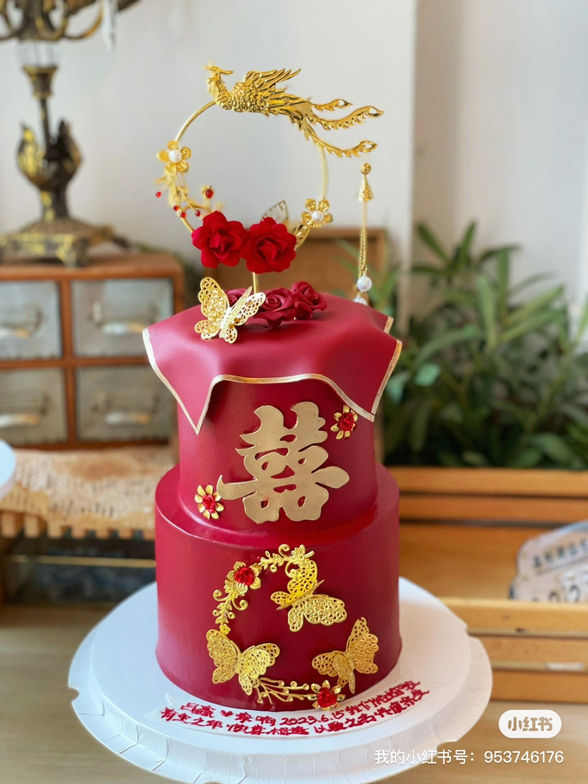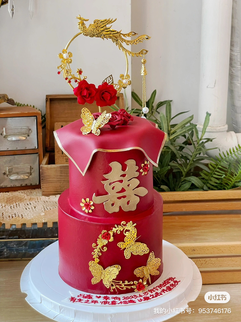 复古中国红结婚蛋糕,提前3天以上预定,深色奶油易染色,建议挂掉外层彩色奶油后食用