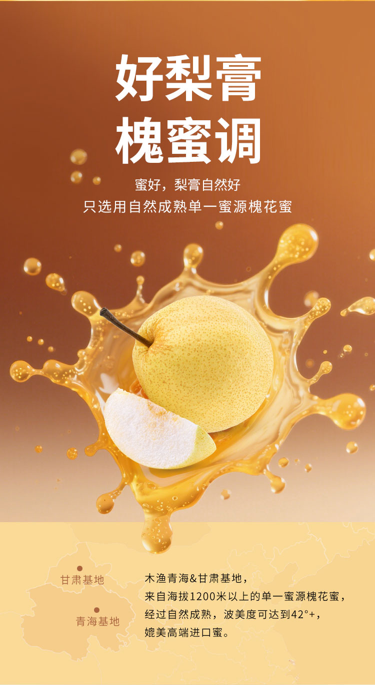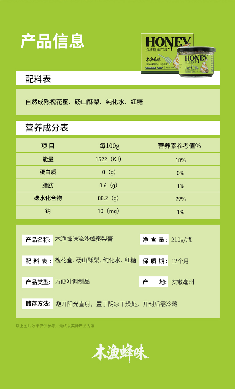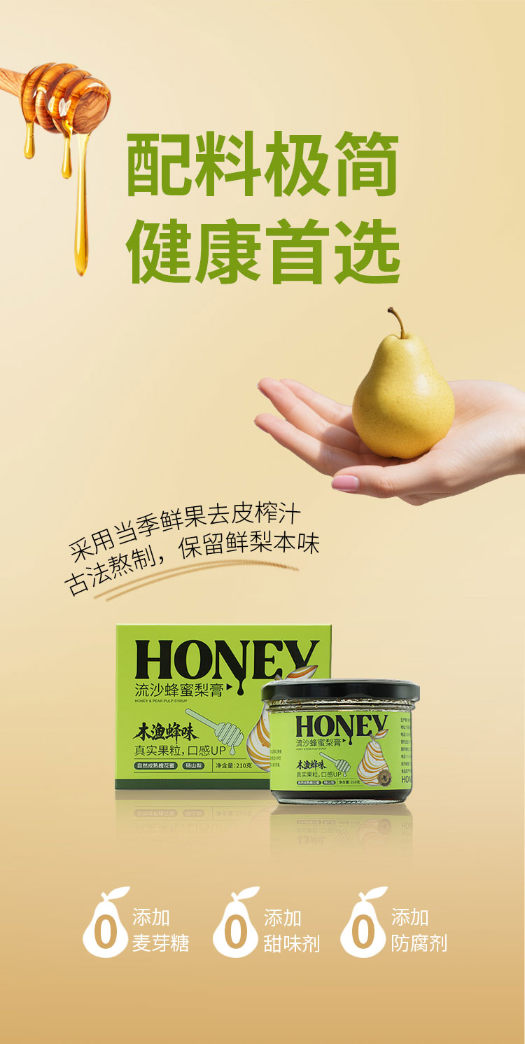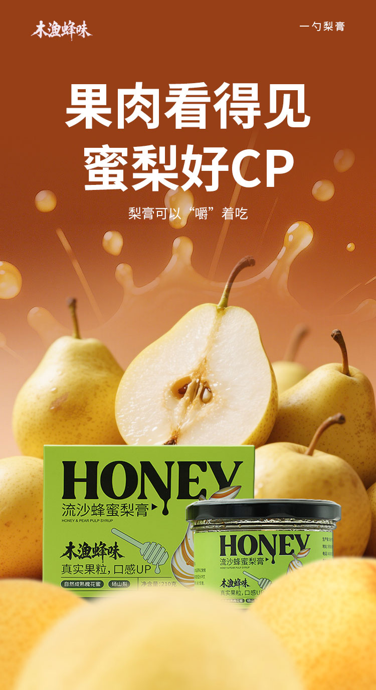 木渔蜂味流沙蜂蜜梨膏 选用自然成熟槐花蜜 古法慢熬酥梨膏含鲜梨果肉颗粒 配料极简 210g/瓶盒