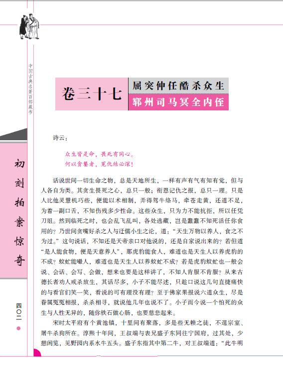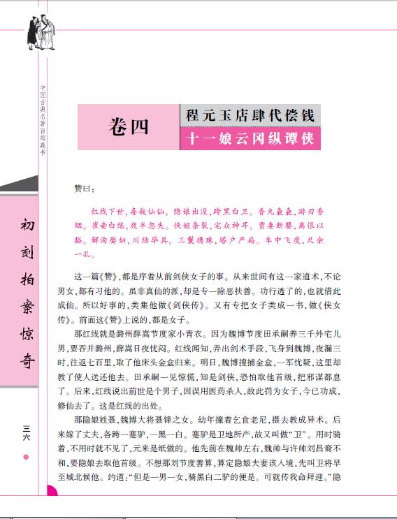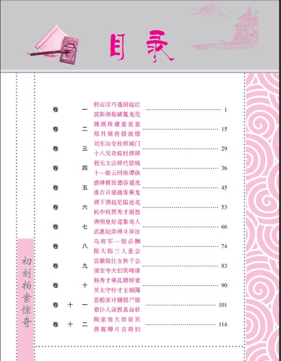 《初刻拍案惊奇》是明朝末年凌蒙初编着的拟话本小说集,其题材大多取自前人。书的内容比较繁杂,思想倾向前后不尽相同,主要有描写商人思想行径、命运遭际的作品和描写婚恋的作品。其多出自前代着述,但经过凌蒙初的再创作,也一定程度表现出晚明社会现实与时代气息,浸含着凌氏本人的思想观念和愤世不平之气。常与《二刻拍案惊奇》并称二拍,加上冯梦龙的“三言”,则为“三言二拍”,在中国文学史上有较重要的影响。