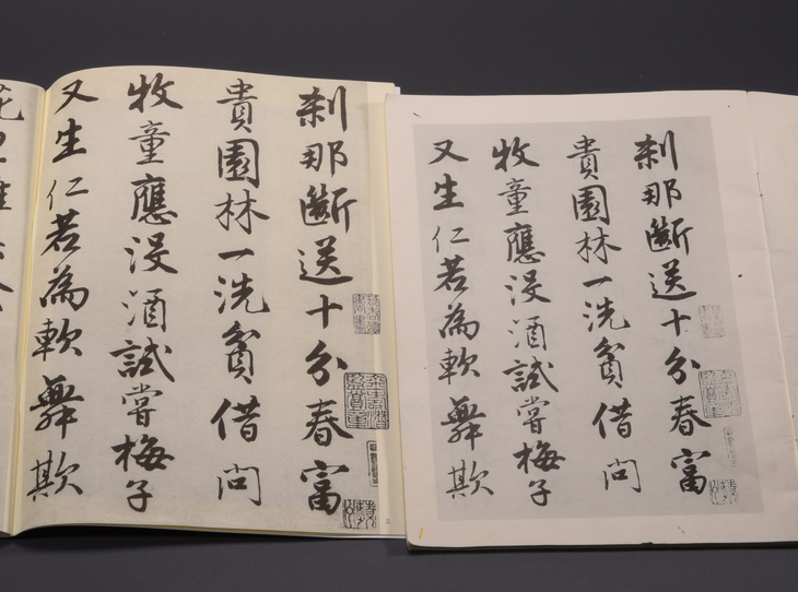 为了追求最大程度地表现原作的精神面貌,我们还原了册页的格式,每个对开页呈现一开册页,并调整图片大小,恢复了原大的尺寸,使得原作的细节表现力更加突出。在印刷上,我们使用了100g米黄道林纸,较之以前的80g道林纸更加厚实,底色更加柔和不刺眼。