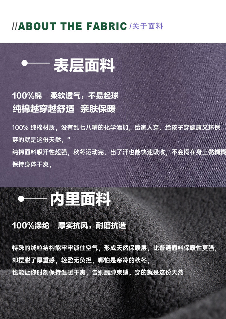 厚实不笨重 像裹着小暖炉🔥~面料厚实抗风,深秋、冷冬单穿都够暖! 软乎乎还耐磨,娃疯跑、登山都不怕。 微防小雨,打理超省心~