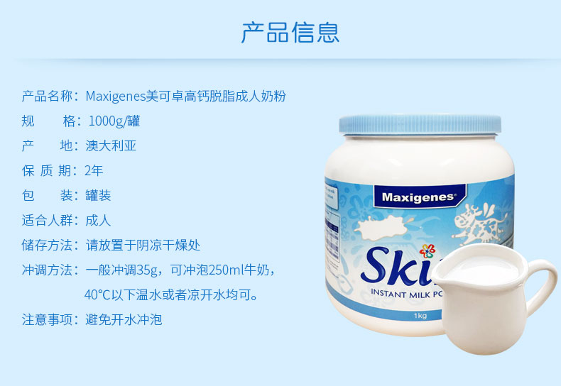 【一般贸易】澳洲美可卓蓝胖子奶粉 蓝妹子脱脂牛奶粉1kg