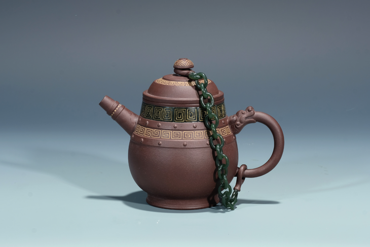 这把由故宫文博专家曹静楼创意,宜兴工艺师张子威,上海玉雕工艺大师韩荣昌联袂精制的,仿青铜夔龙玉链壶,由于用一根13公分长的玉棒,采用传统工艺雕琢成17公分长的环环相扣玉链条,镶在仿青铜器型的紫砂壶上,尤显古朴典雅、富贵大气,更张扬了中国古老玉雕工艺与紫砂壶珠联璧合的艺术之美。它弥补了紫砂壶自明至今600余年的一项技术空白。用一块整玉琢成链子,镶嵌在壶盖与把上,在18世纪欧洲皇室从中国宜兴,进口紫砂壶的珍藏品中,用金和银铸成链子的壶,至今还能见到,唯独不见玉链子壶。