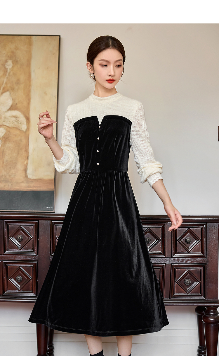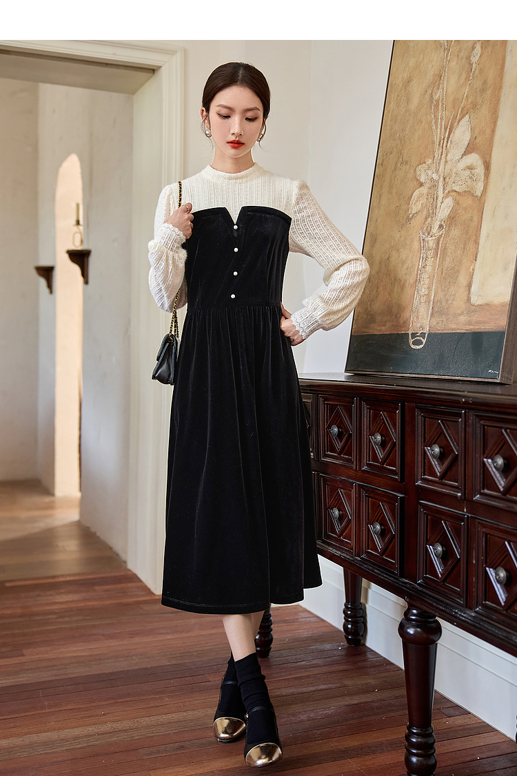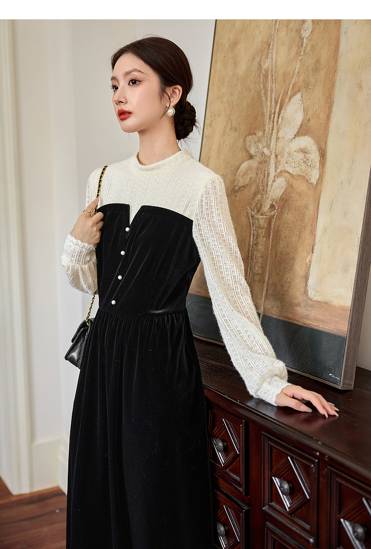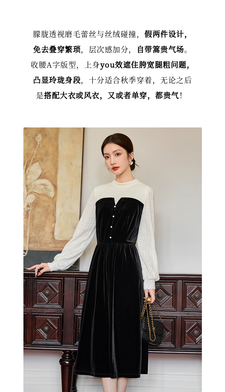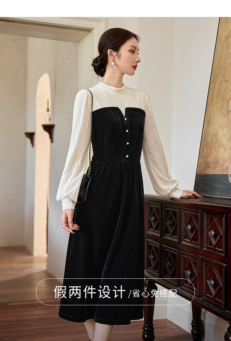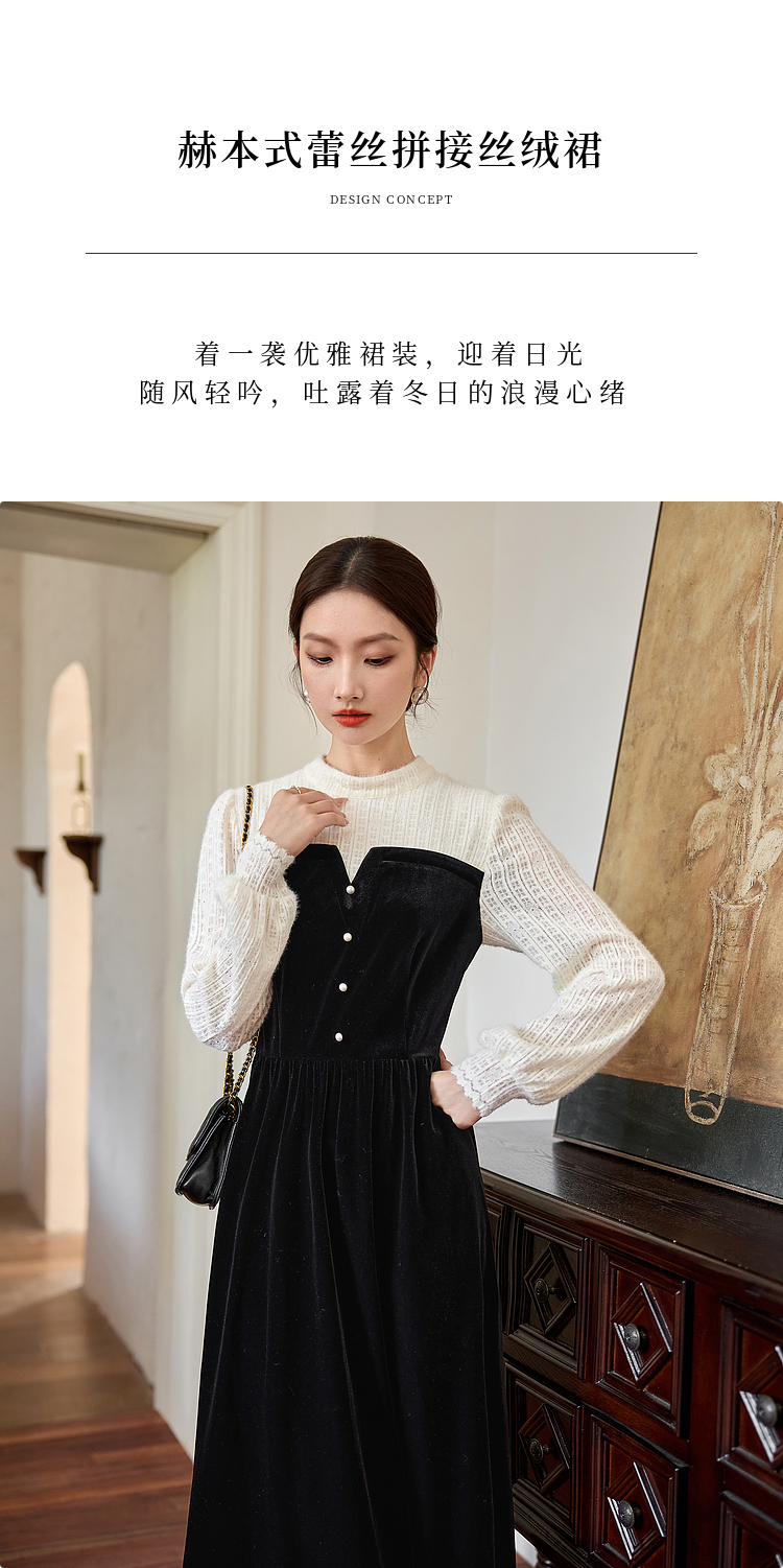 【年终特卖】熙世界2025秋冬新款蕾丝拼接丝绒假两件连衣裙女法式赫本风裙子