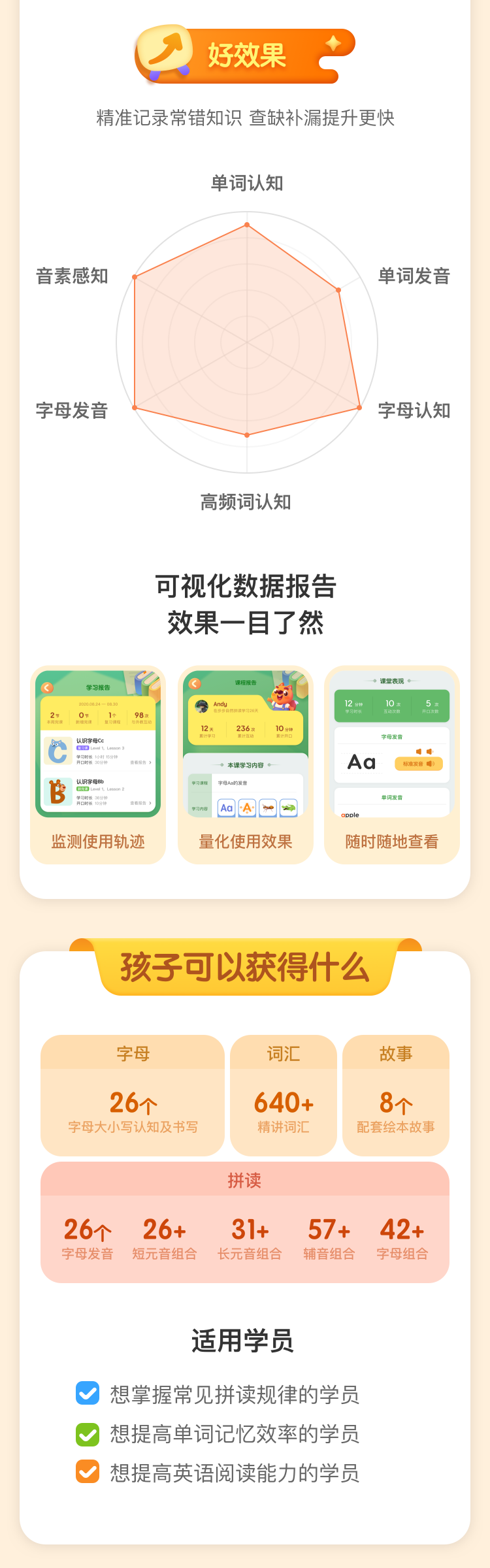 适用学员:1想掌握常见拼读规律的学员。2想提高单词记忆效率的学员。3想提高英语阅读能力的学员