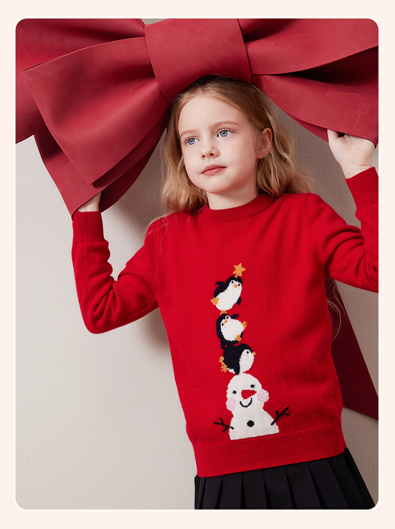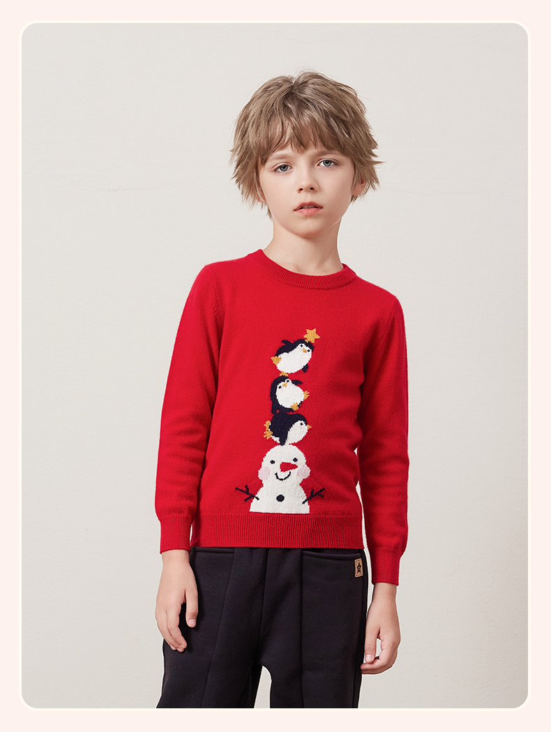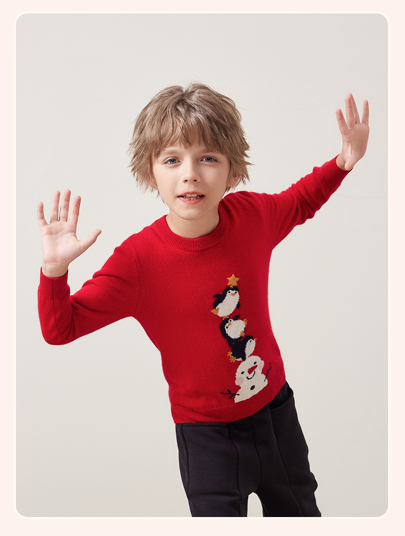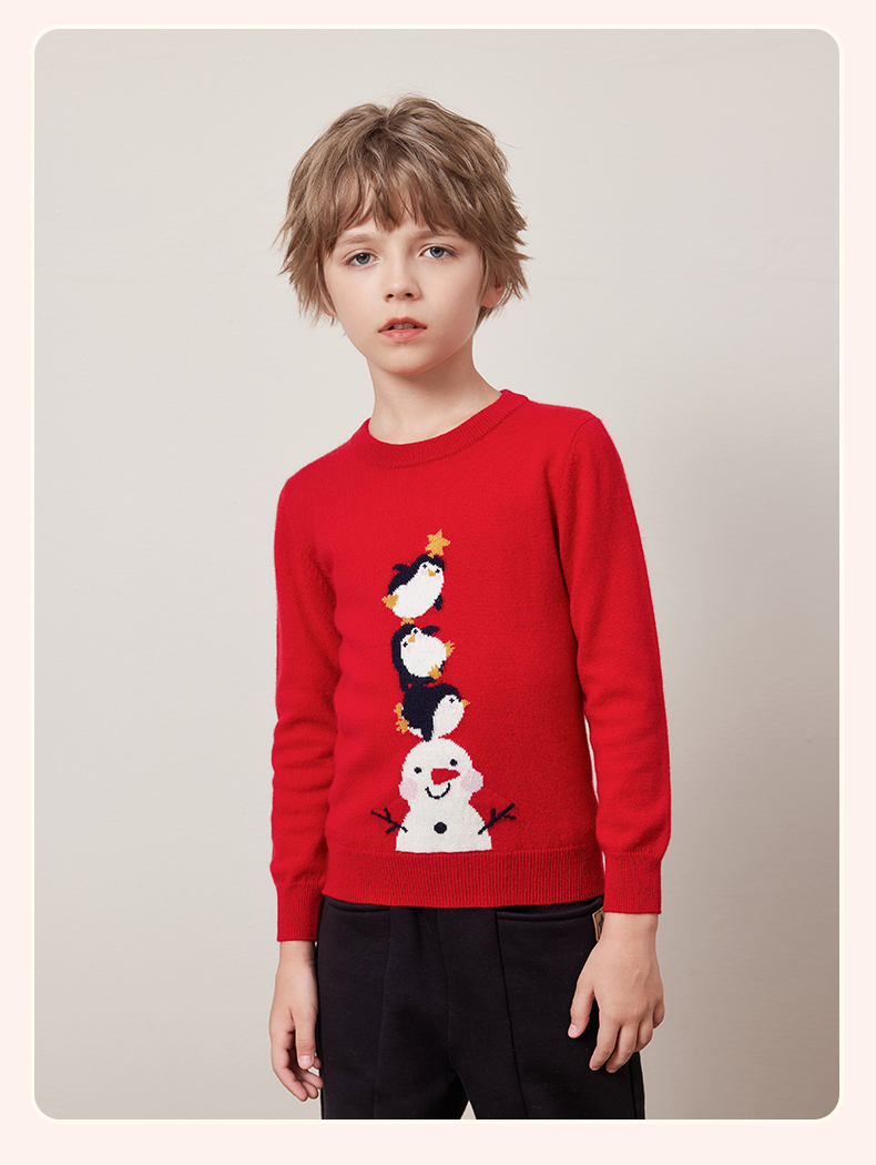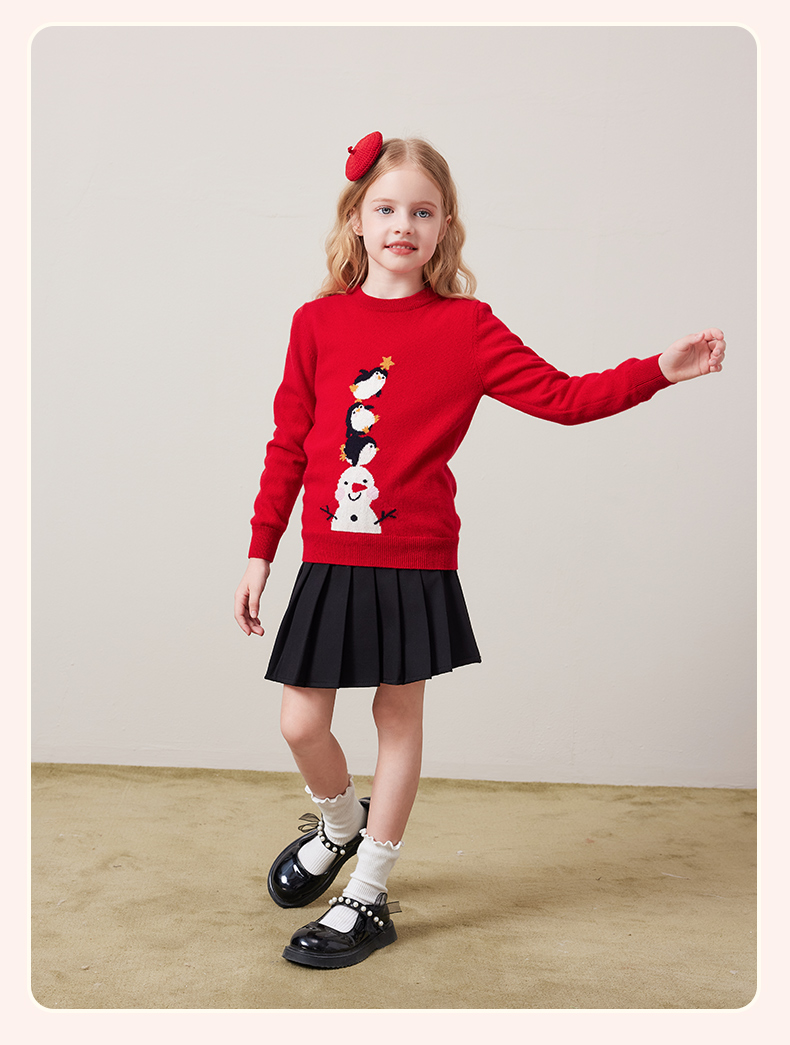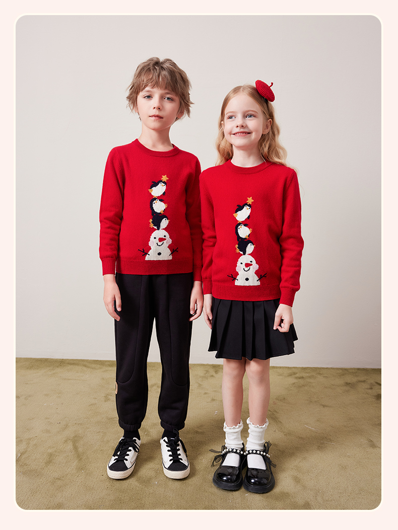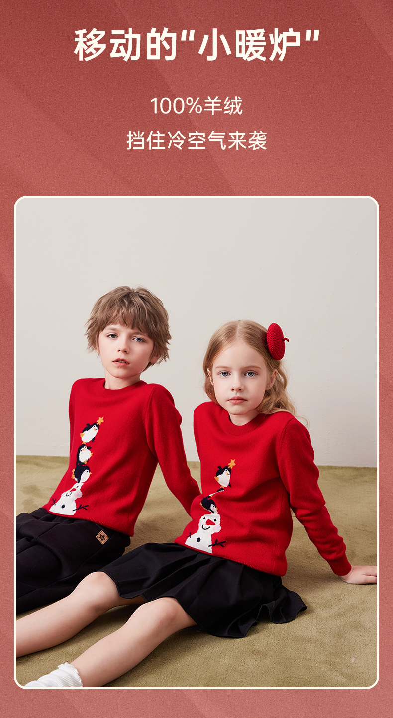 mettekids儿童100%羊绒衫2024秋冬新款男童卡通针织女童红色毛衣