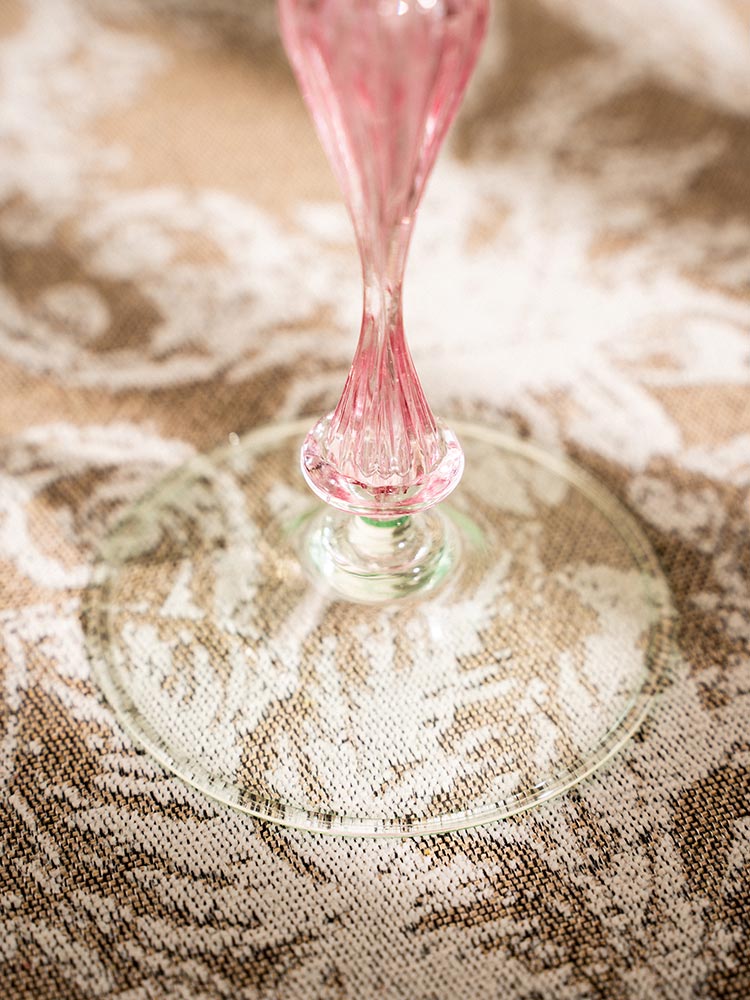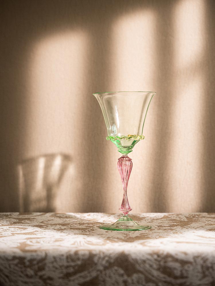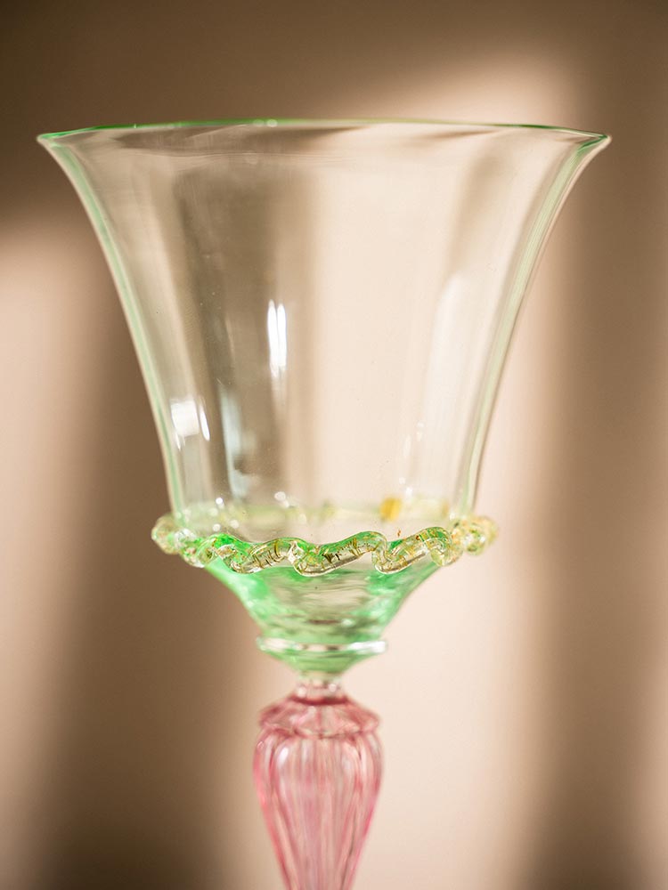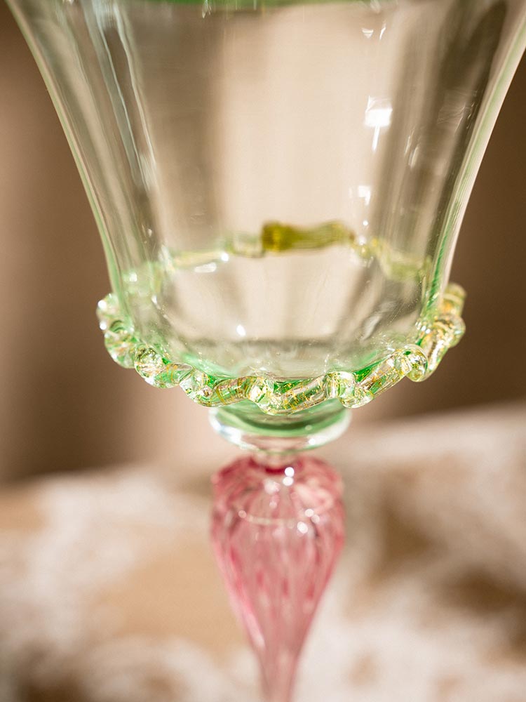 20世纪意大利威尼斯穆拉诺水晶工坊出品螺旋纹粉色杯柄修饰翠绿色杯身玻璃高脚杯