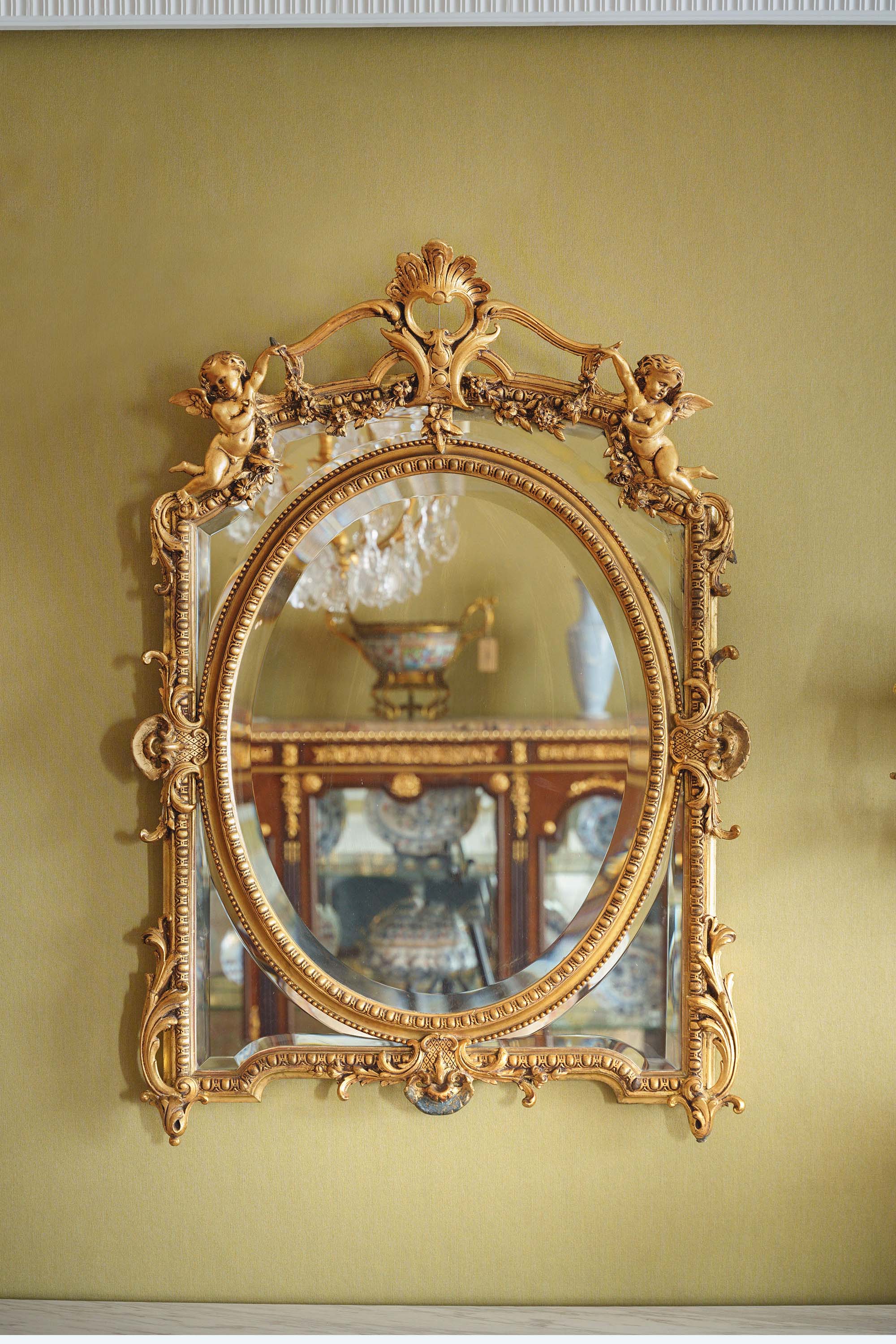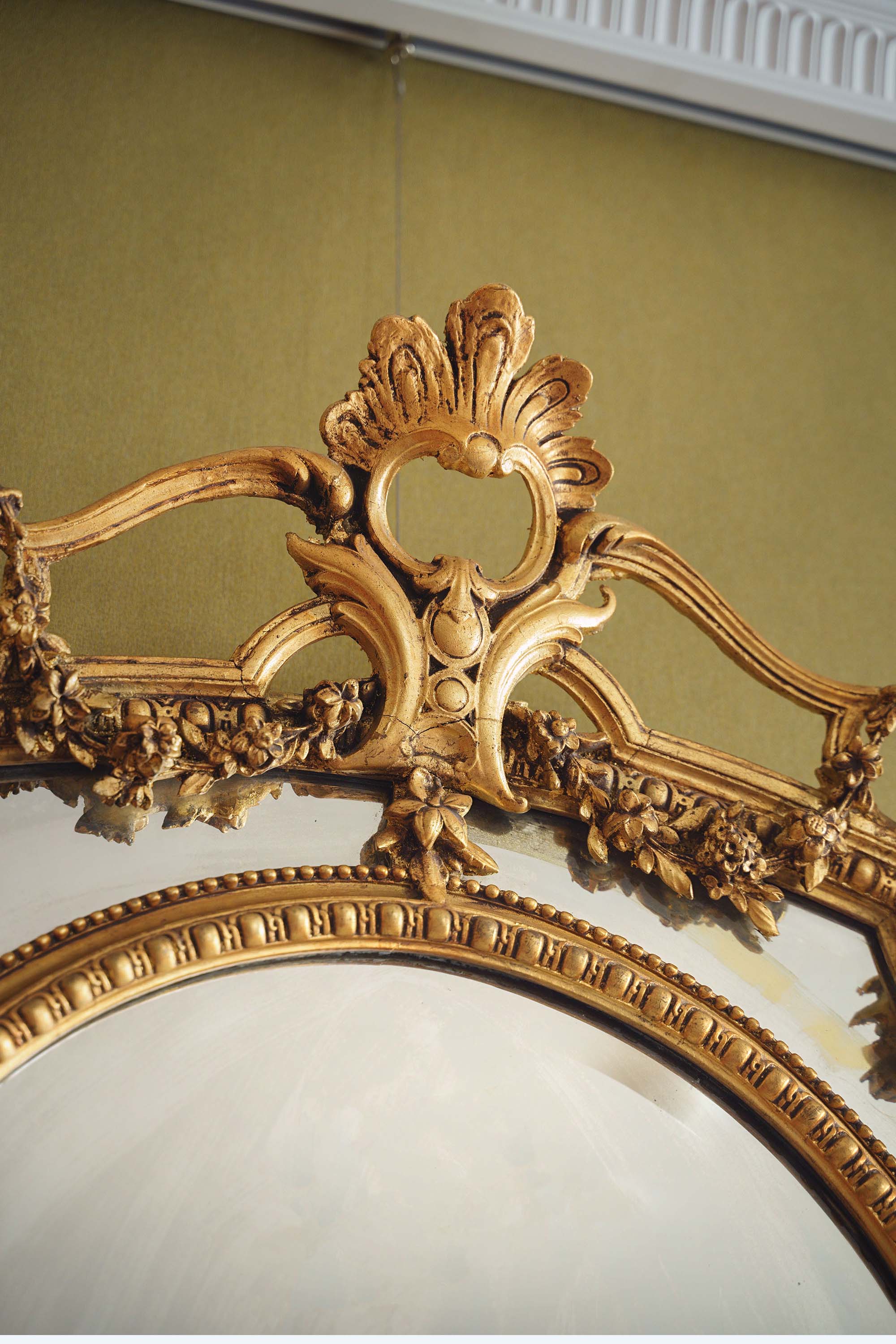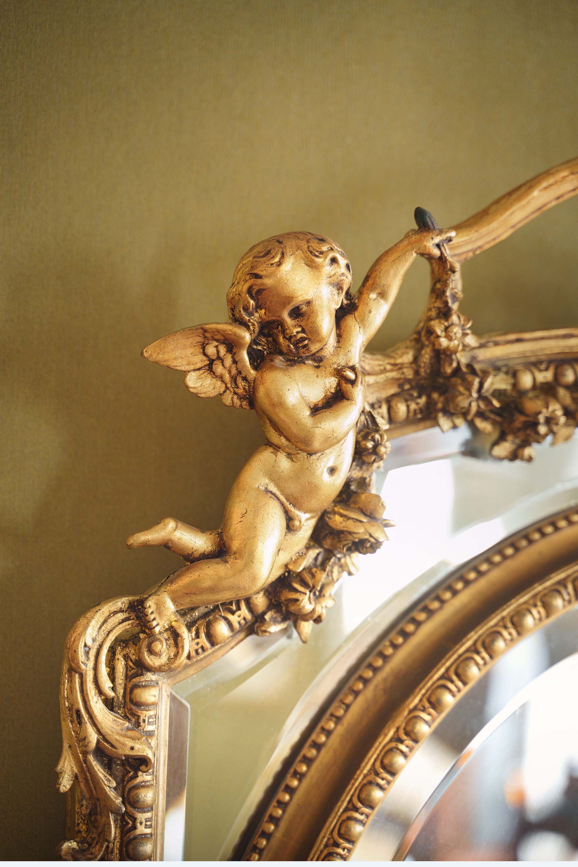 独角鹿西洋古董1880年代法国出品古典天使花蔓主题鎏金灰墁浮雕木质大型挂镜