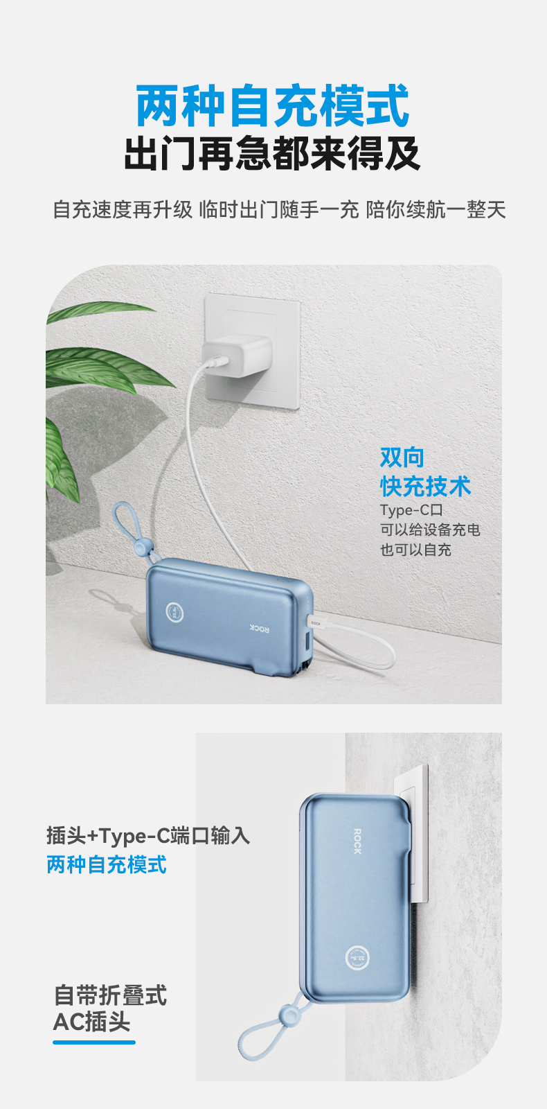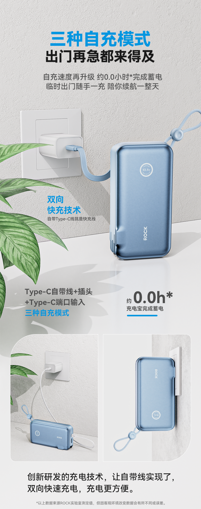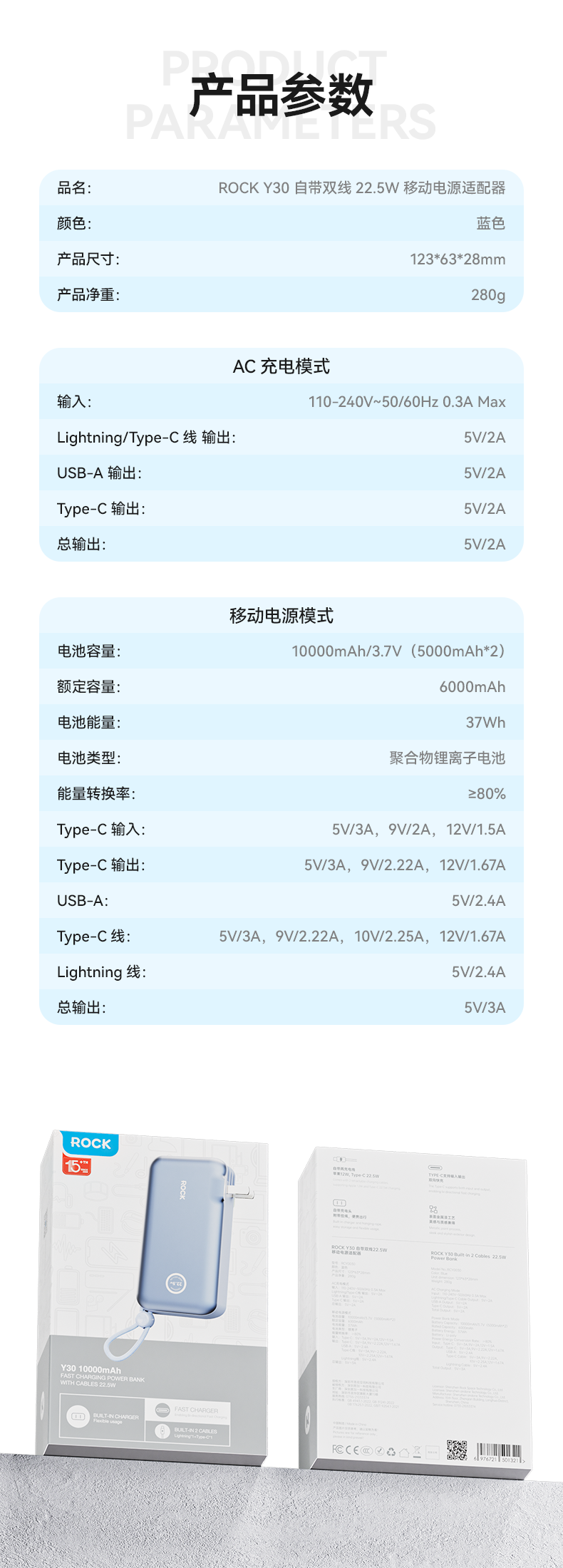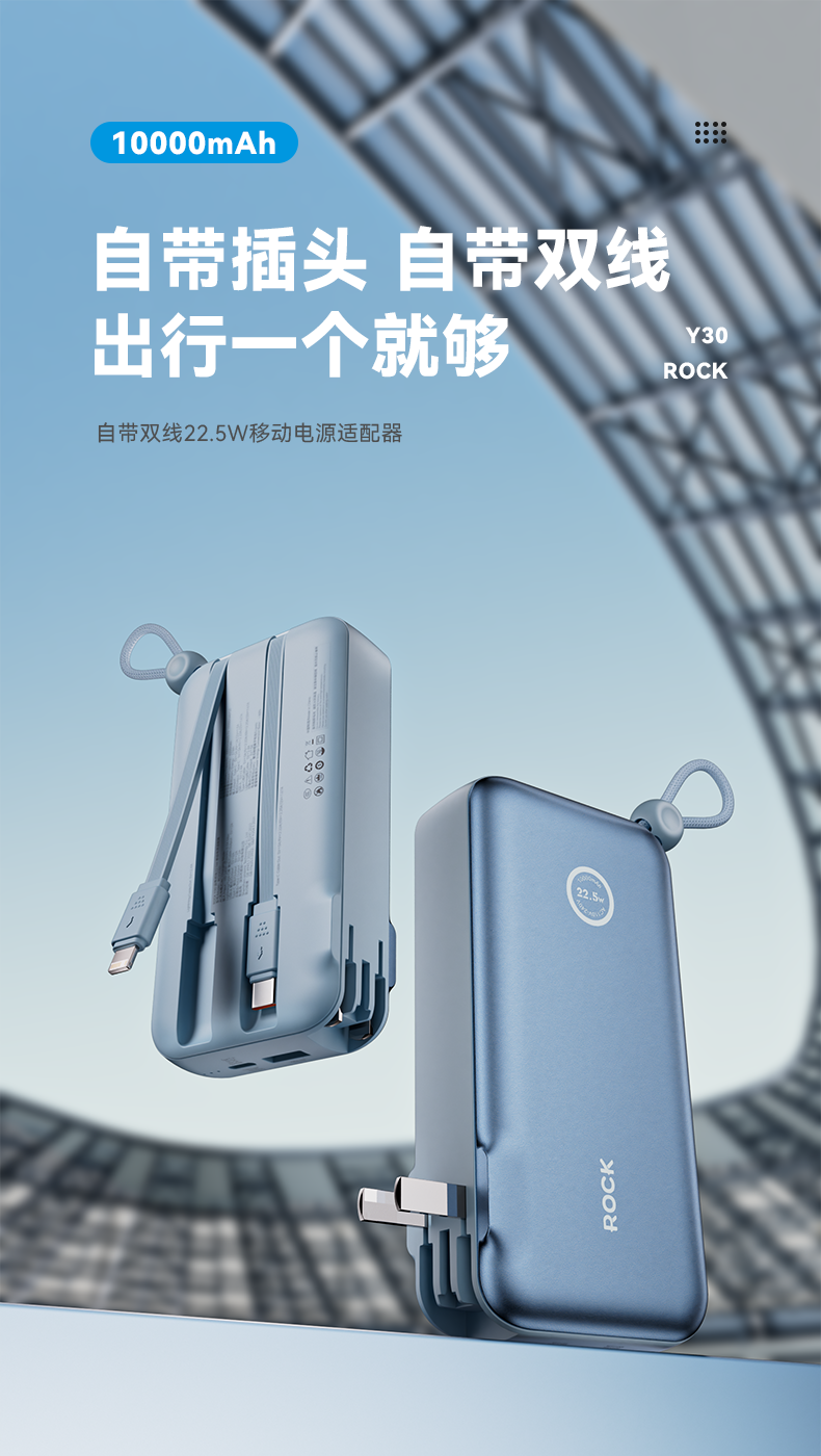 ROCK 自带双线22.5W移动电源10000mah Y30 蓝色