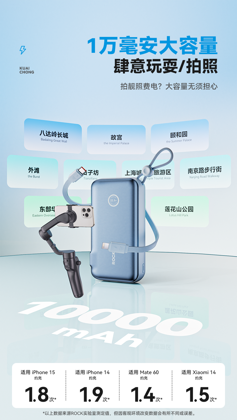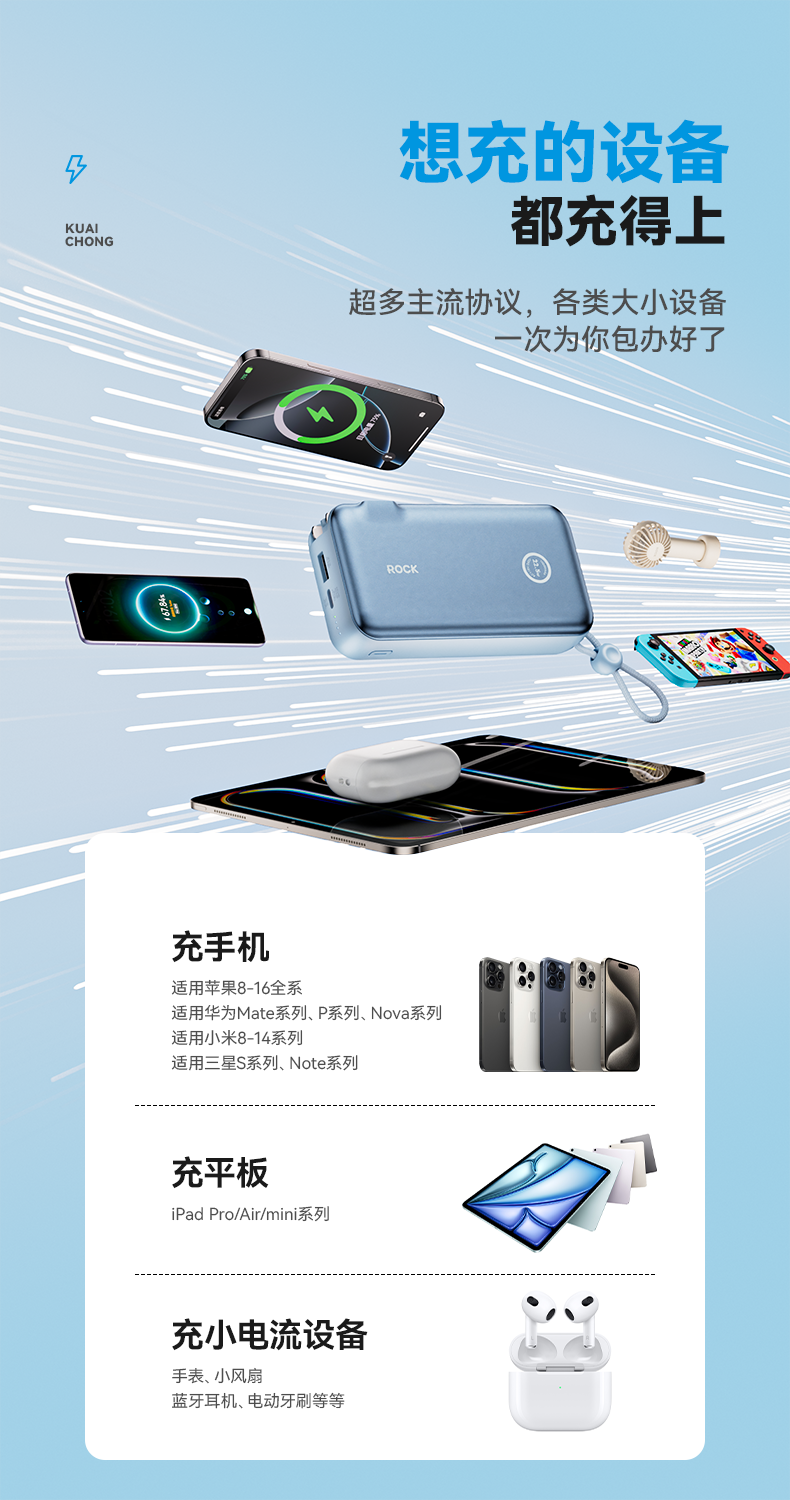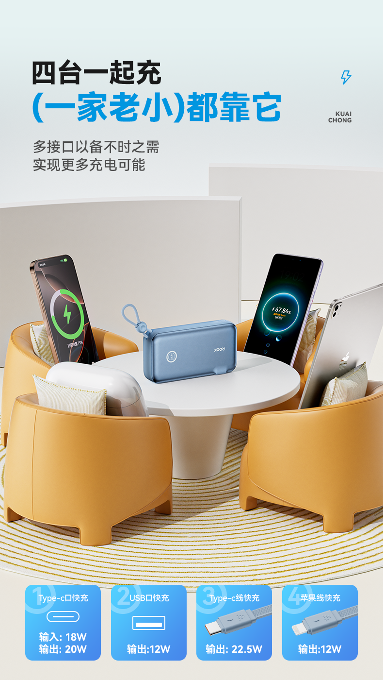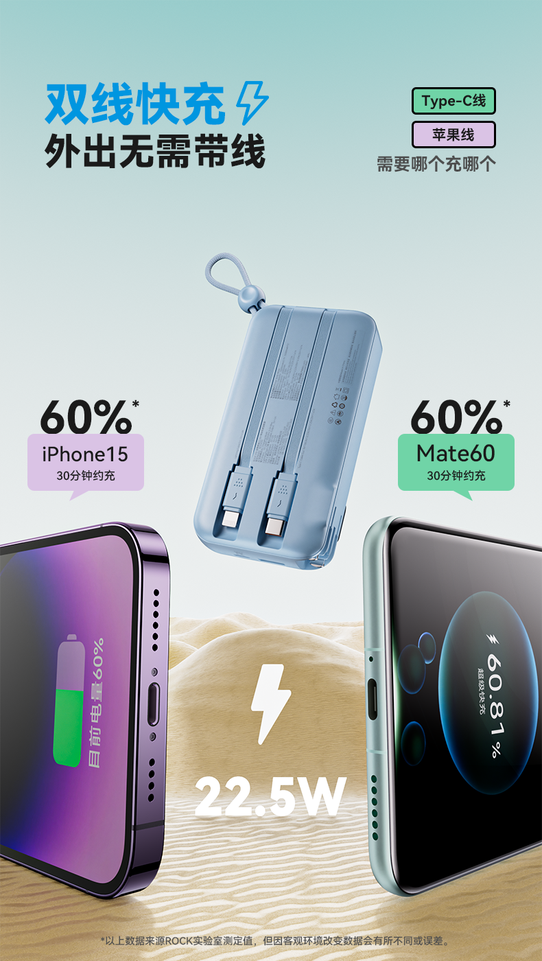 ROCK 自带双线22.5W移动电源10000mah Y30 蓝色