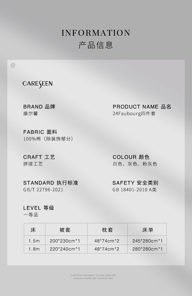 - 源自五星级酒店的奢华家纺品牌,康乃馨首次提出打造“酒店+家纺”的全新概念,将更为严格的五星级酒店纺织品品质标准与家纺相结合,完美诠释“酒店品质家纺”的舒适感受与奢华品味。