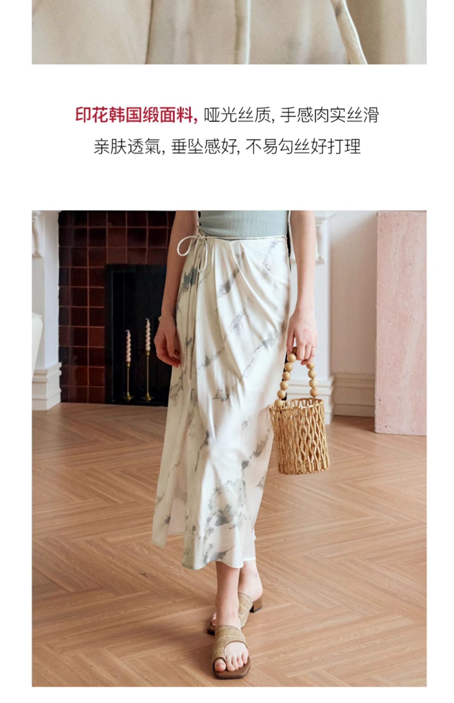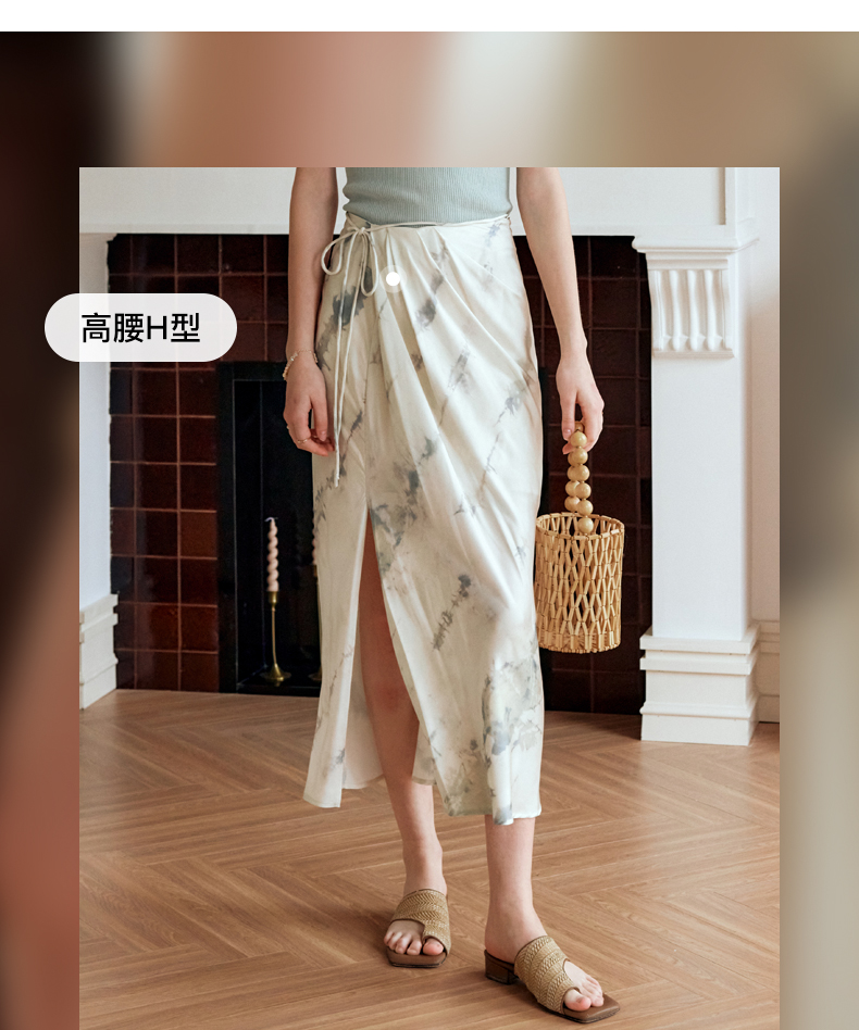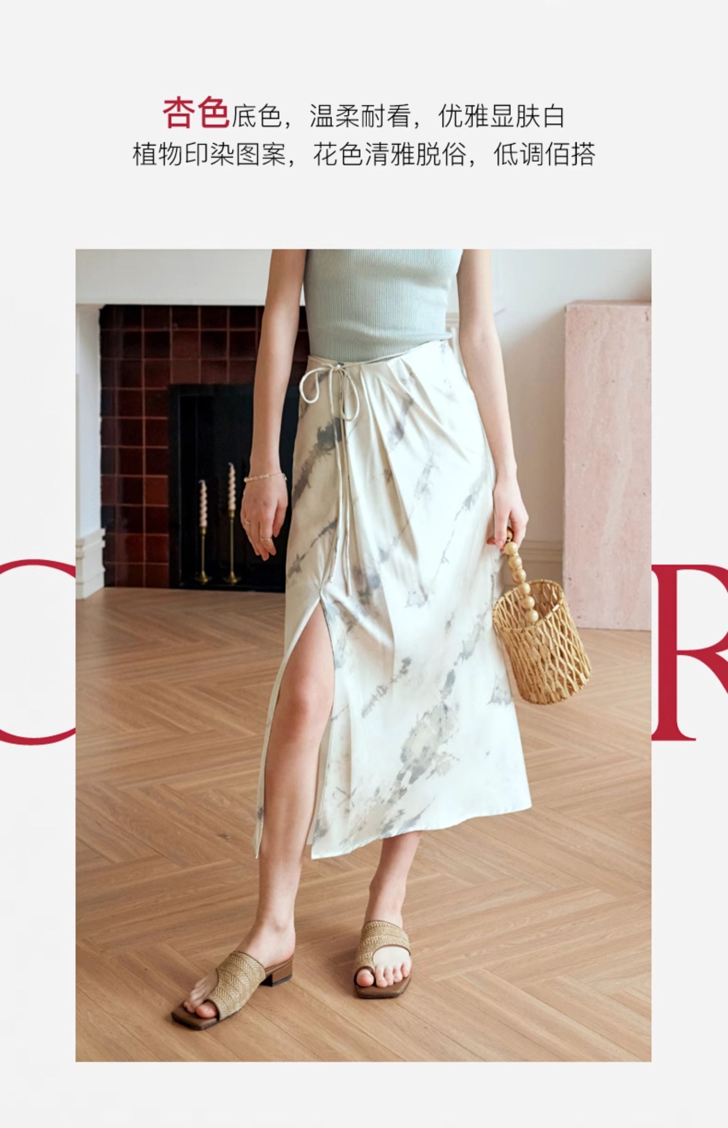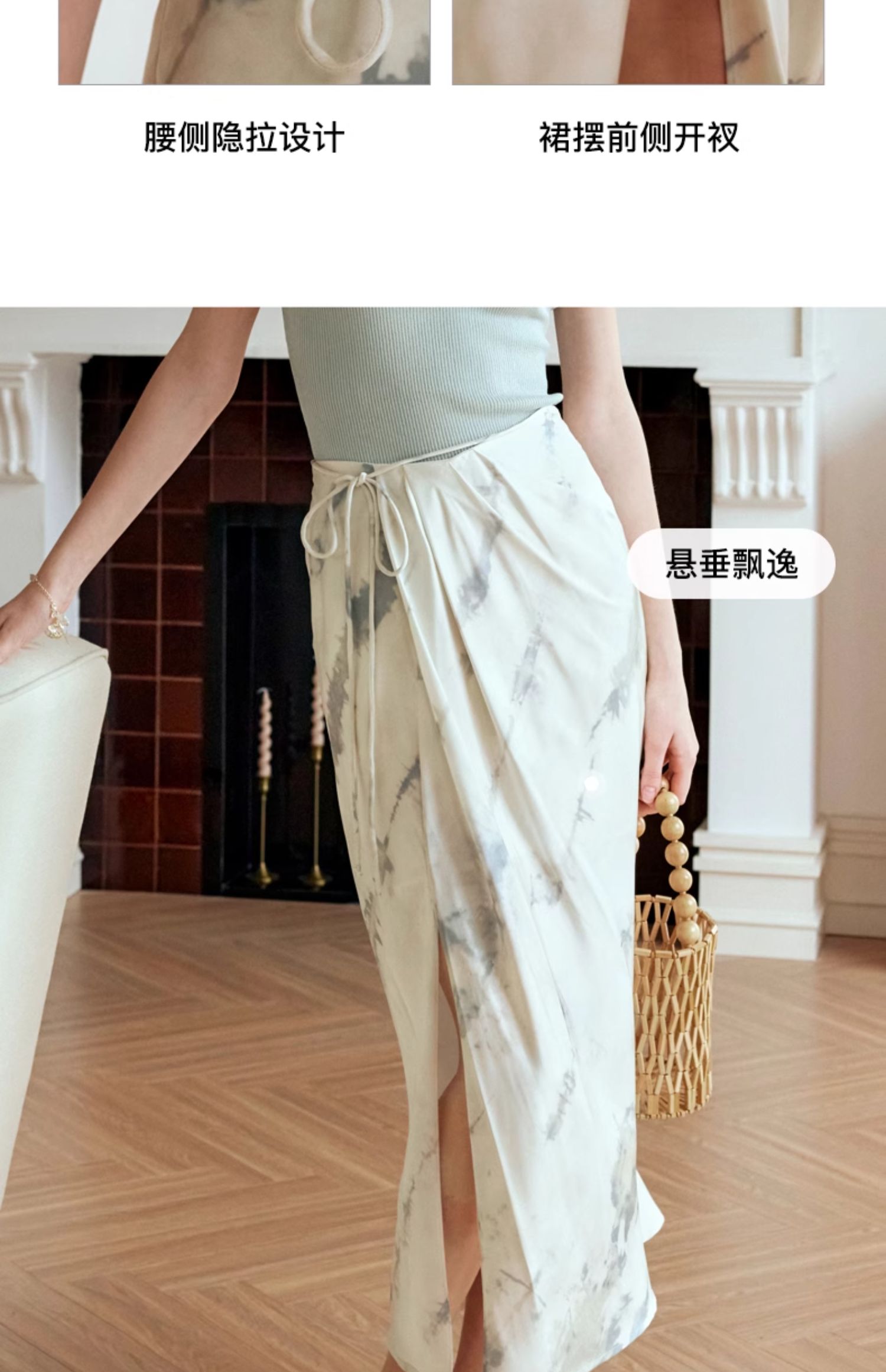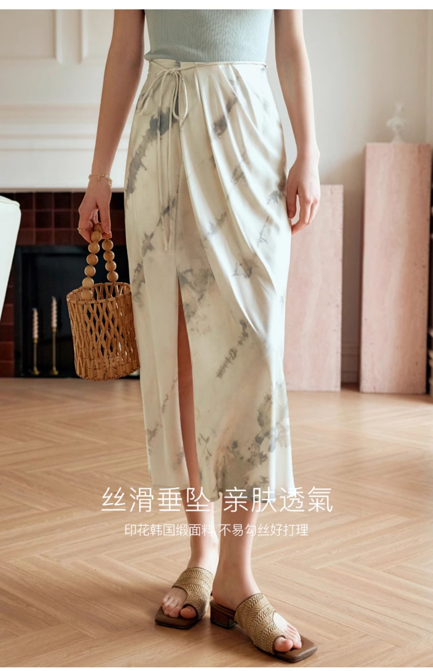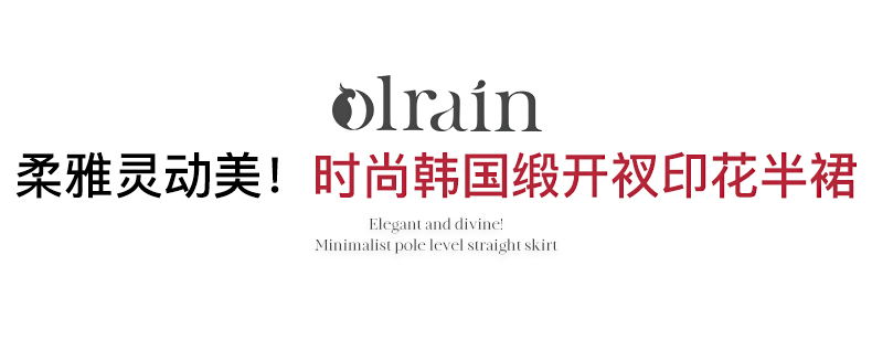 OLrain欧芮儿杏色半身裙女夏季2024年新款时尚印花不规则开叉半裙
