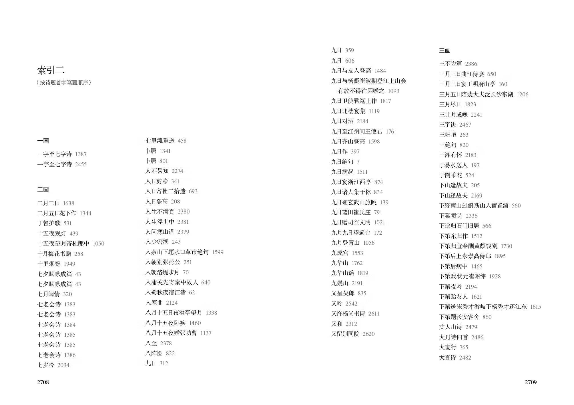 七、为方便一般读者查阅,我们在书后增加了两个索引。索引一按作者姓名首字笔画顺序排列,索引二按诗题首字笔画顺序排列。