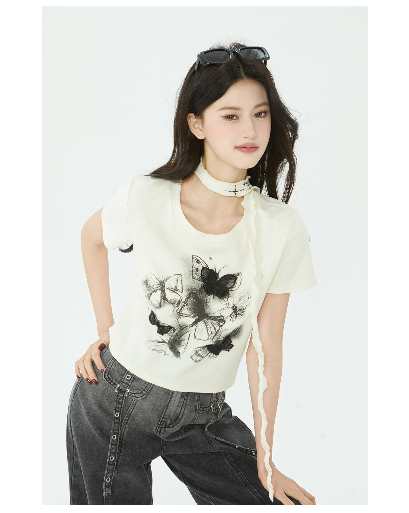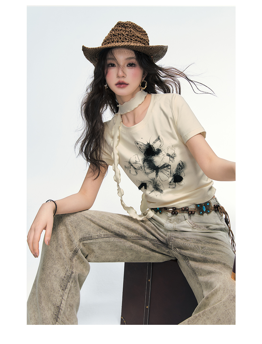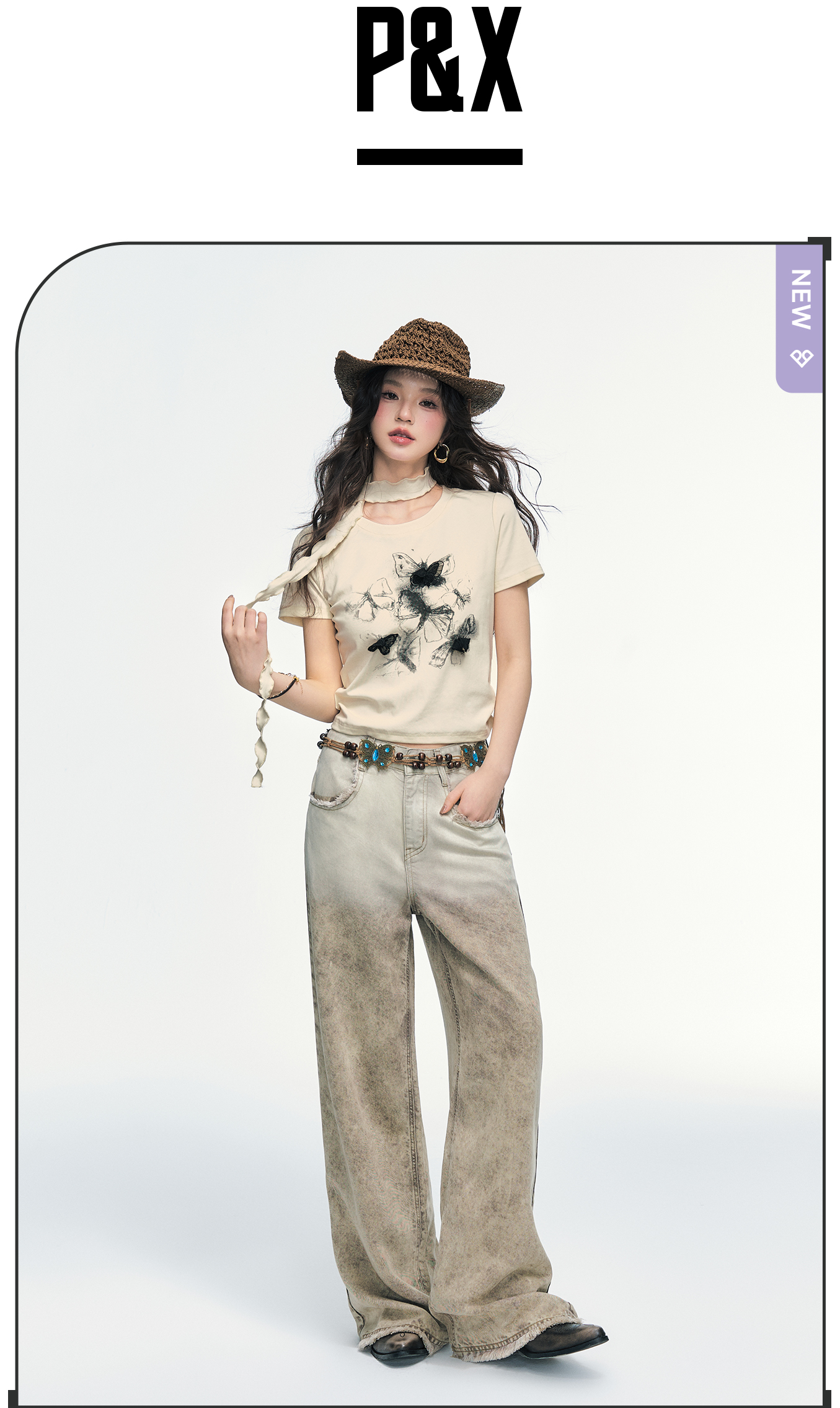 P&X设计师女装 美式复古蝴蝶涂鸦飘带针织短款T恤 825202233 杏色