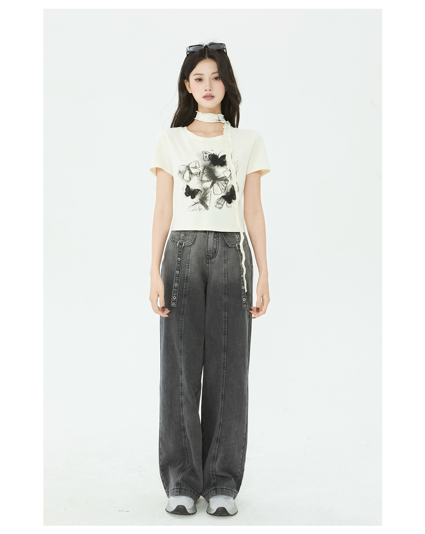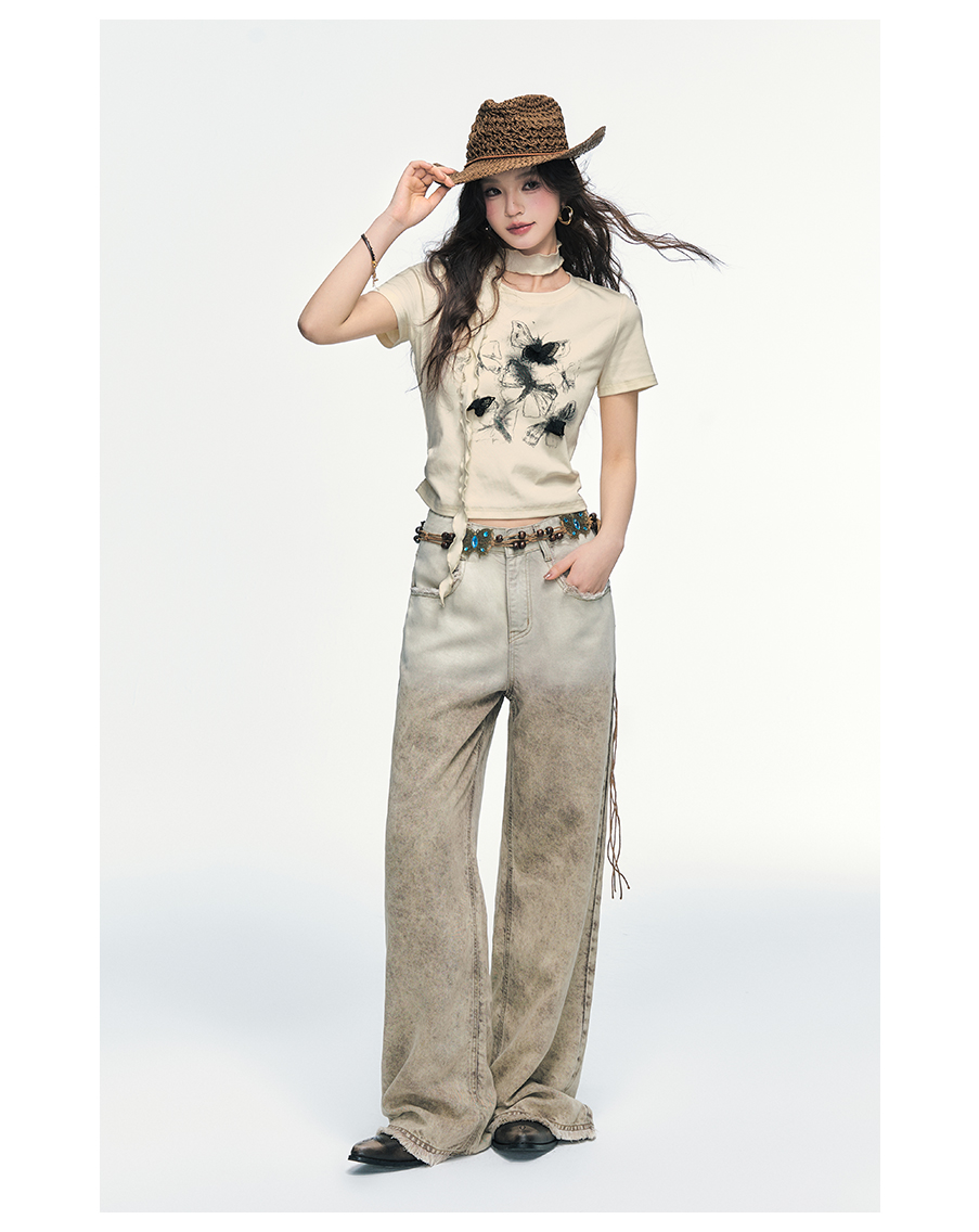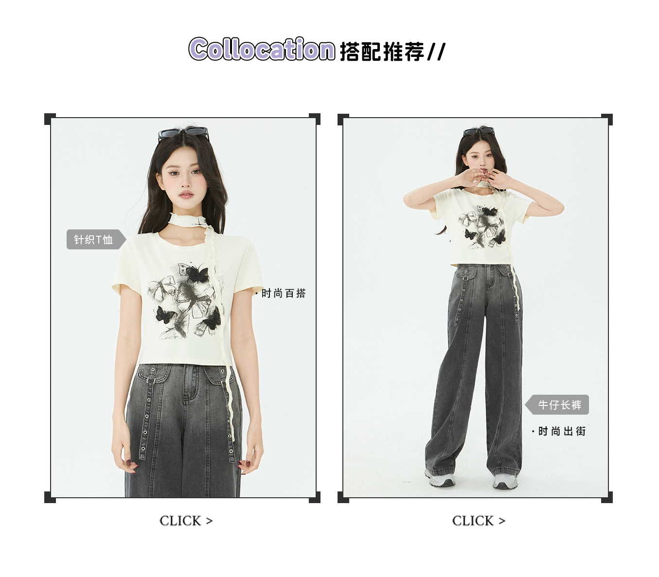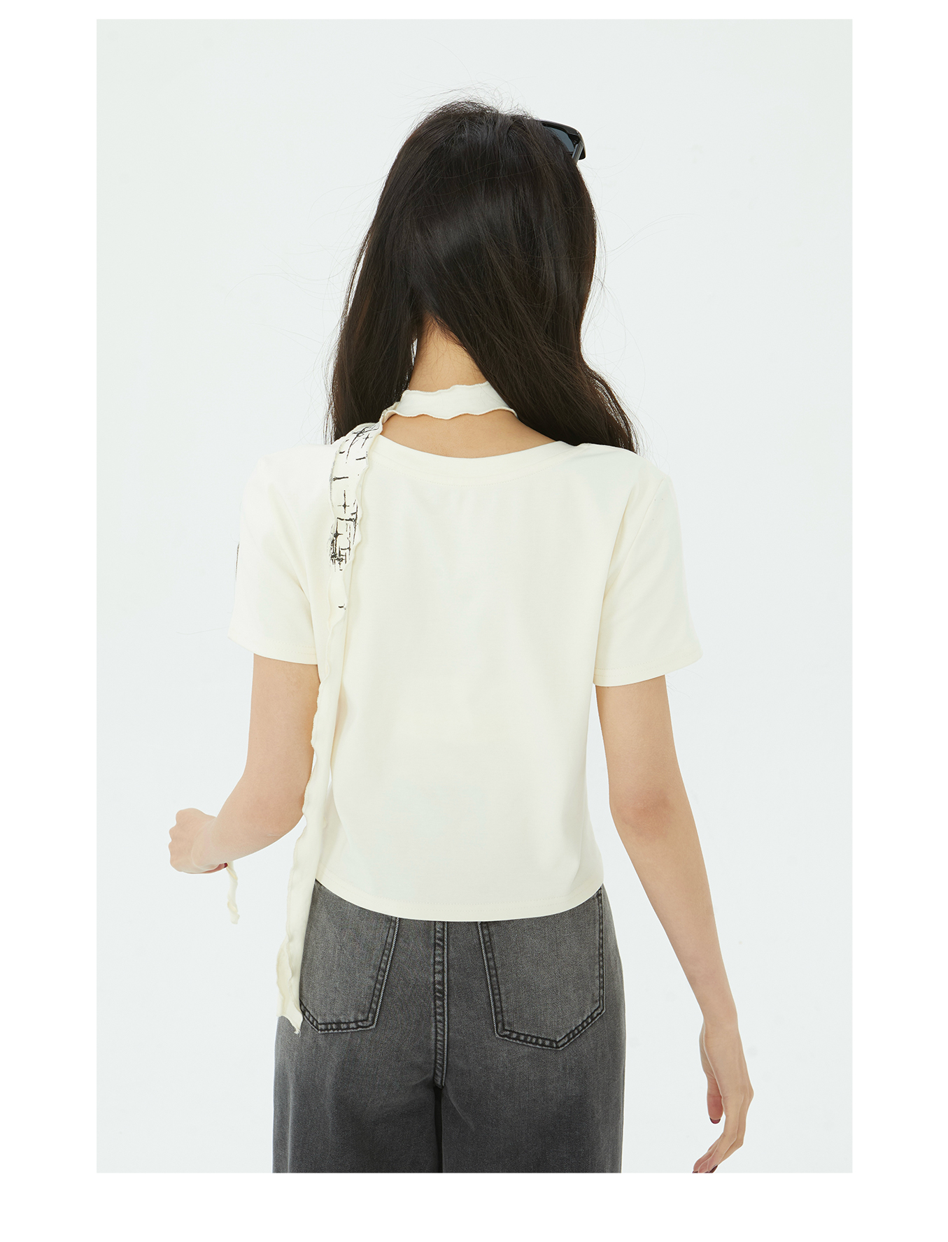 P&X设计师女装 美式复古蝴蝶涂鸦飘带针织短款T恤 825202233 杏色