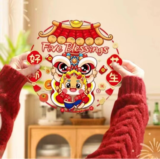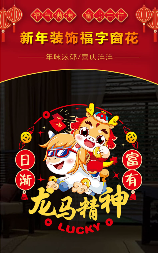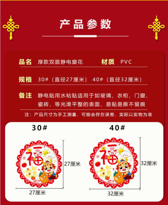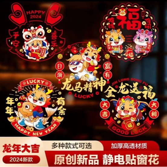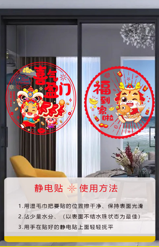 迎接龙年的到来,为你的家居增添一份独特的魅力 我们的双面静电窗花贴以精美的设计和高质量的制作工艺,为你带来全新的装饰体验! 这款窗花贴采用了先进的静电技术,无需胶水或胶带,只需轻轻一按,就能牢固地贴在窗户上 双面设计更是让你可以在内外两侧都欣赏到精美的图案,为你的家居增添更多节日氛围~