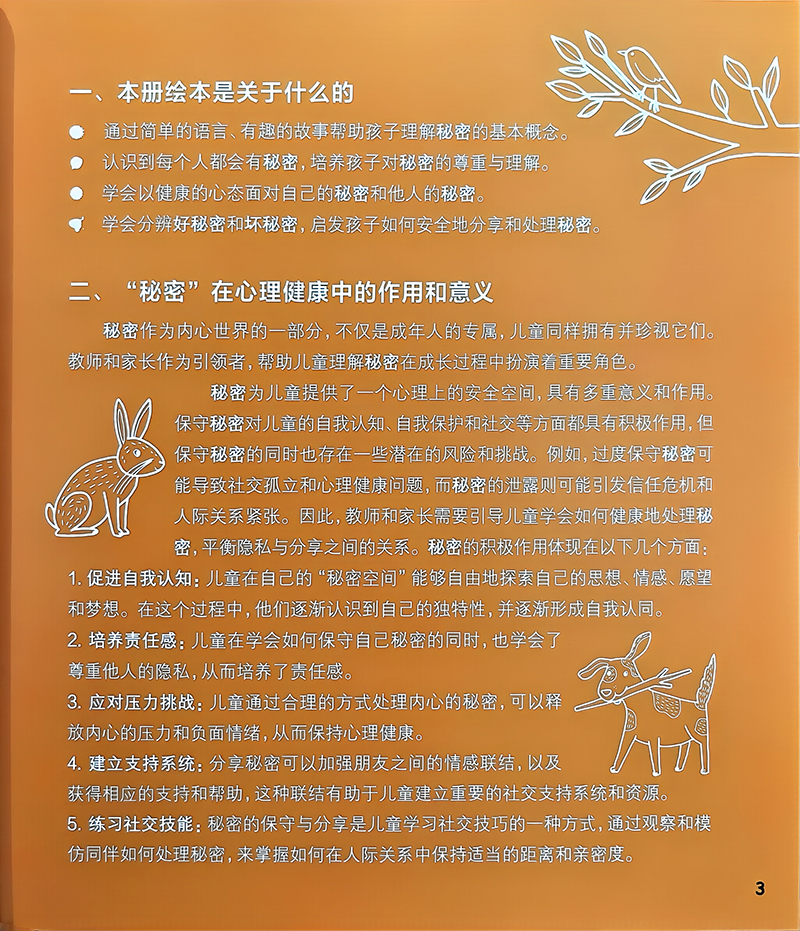 《给孩子的心灵美育绘本 秘密》讲述孩子们如何看待秘密的故事,引导孩子树立隐私意识。通过原创音乐、思考练习、漫画、游戏以及画一画等版块帮助孩子理解秘密的含义。避免说教,符合孩子的阅读习惯。本书集结了囯内、外儿童心理专家、教育专家和童书作家、获奖插画家,共同打造的一套儿童心理健康读本(含教具和指导用书)每本由美育绘本故事、幽默漫画、思考练习、手工制作、互动游戏和家长导读等版块构成。并且配有情绪卡片及讲义,指导家长,帮助孩子共同解决不良情绪的心理问题。