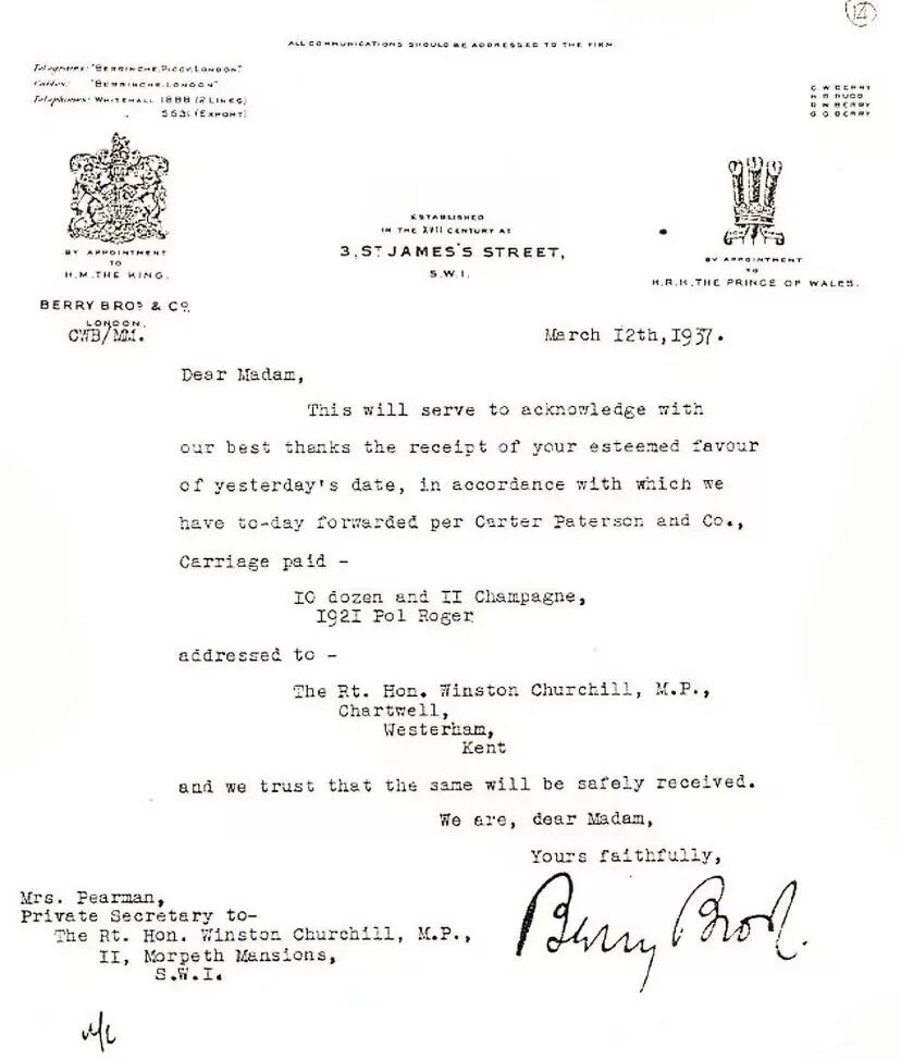 1937年英国首相丘吉尔(Winston Churchill)在Berry Bros&Rudd的买酒小票。