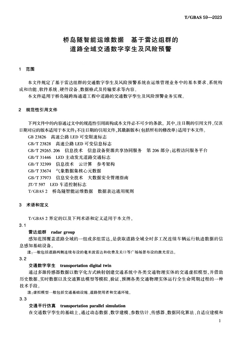 书名:桥岛隧智能运维数据 基于雷达组群的道路全域交通数字孪生及风险预警T/GBAS 59—2023