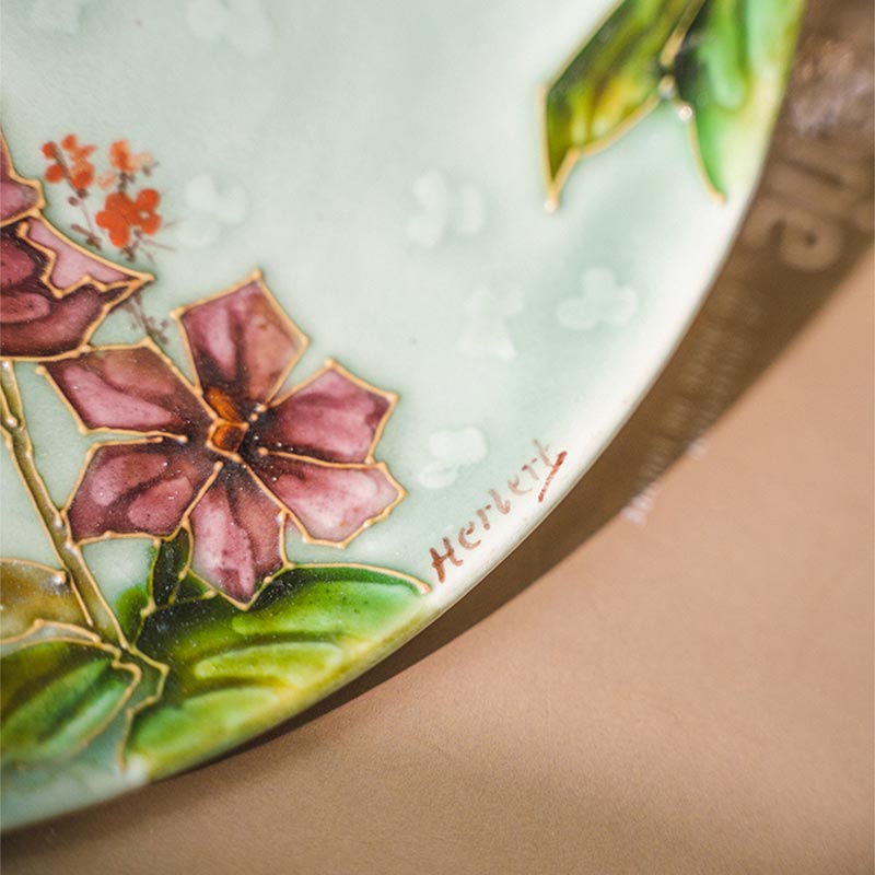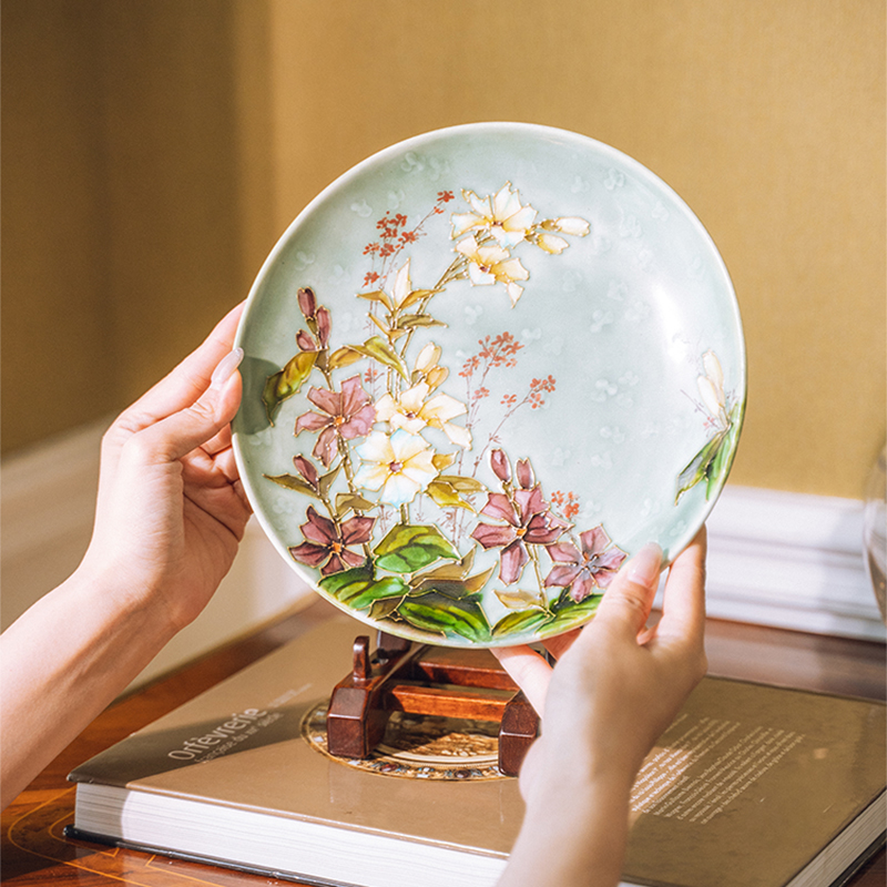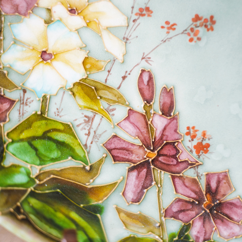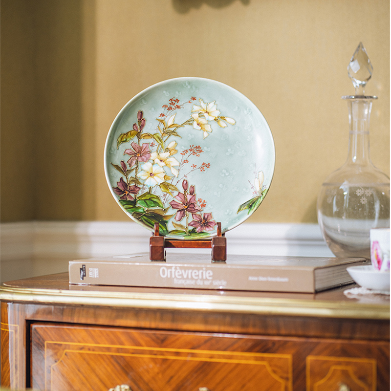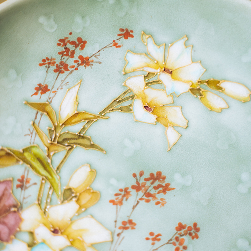 19世纪末20世纪初法国出品新艺术风格自然花卉主题青釉彩绘瓷盘